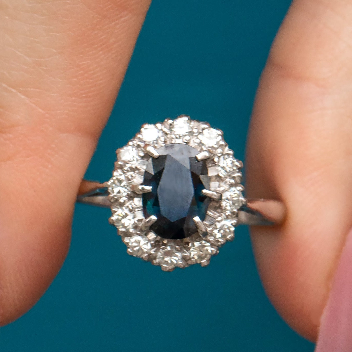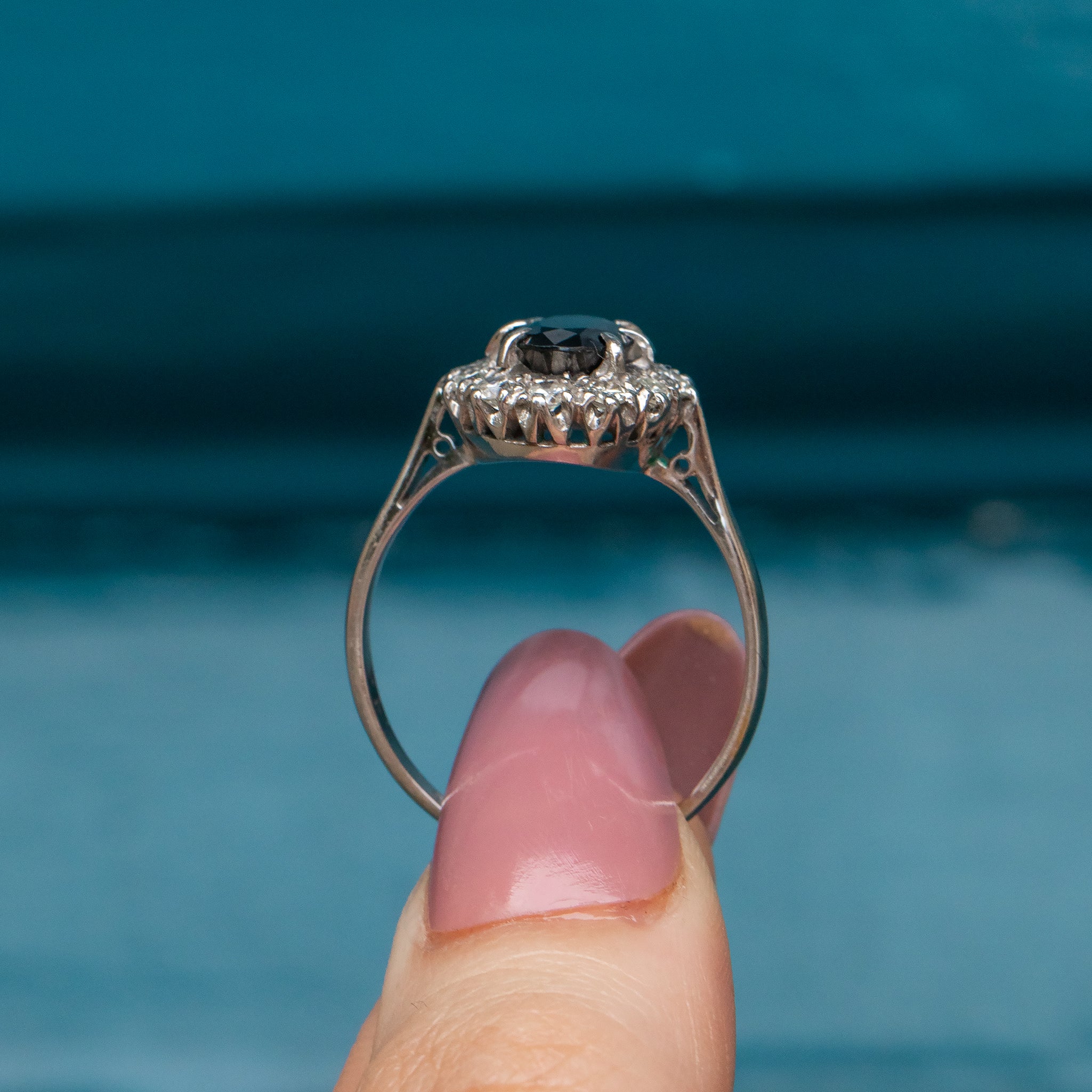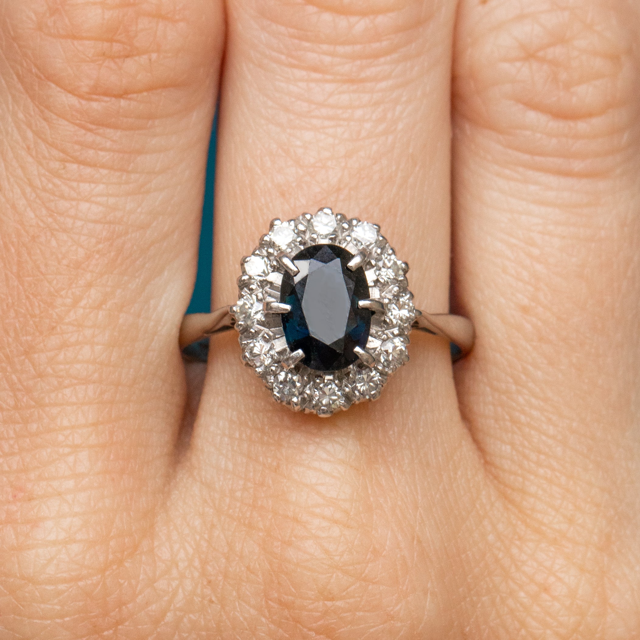 EXCELLENT. This gorgeous antique natural Sapphire and Diamond cluster ring is in excellent condition! This piece has a wonderful natural Sapphire centre, free from damage and securely set, as well as a sparkly halo of Diamonds. The 18ct White Gold ring band has kept its shape very well, and has a partial 18CT stamp still visible.