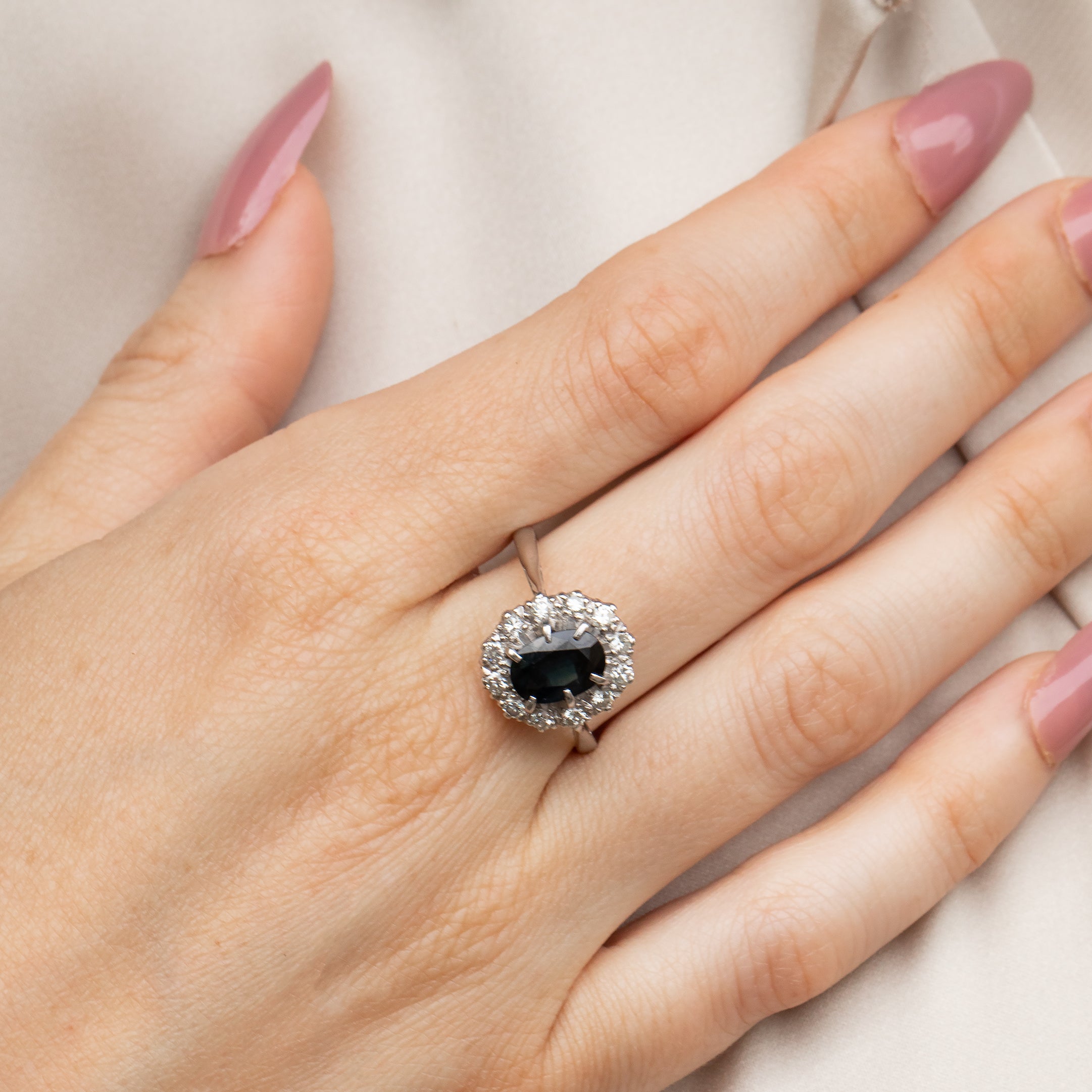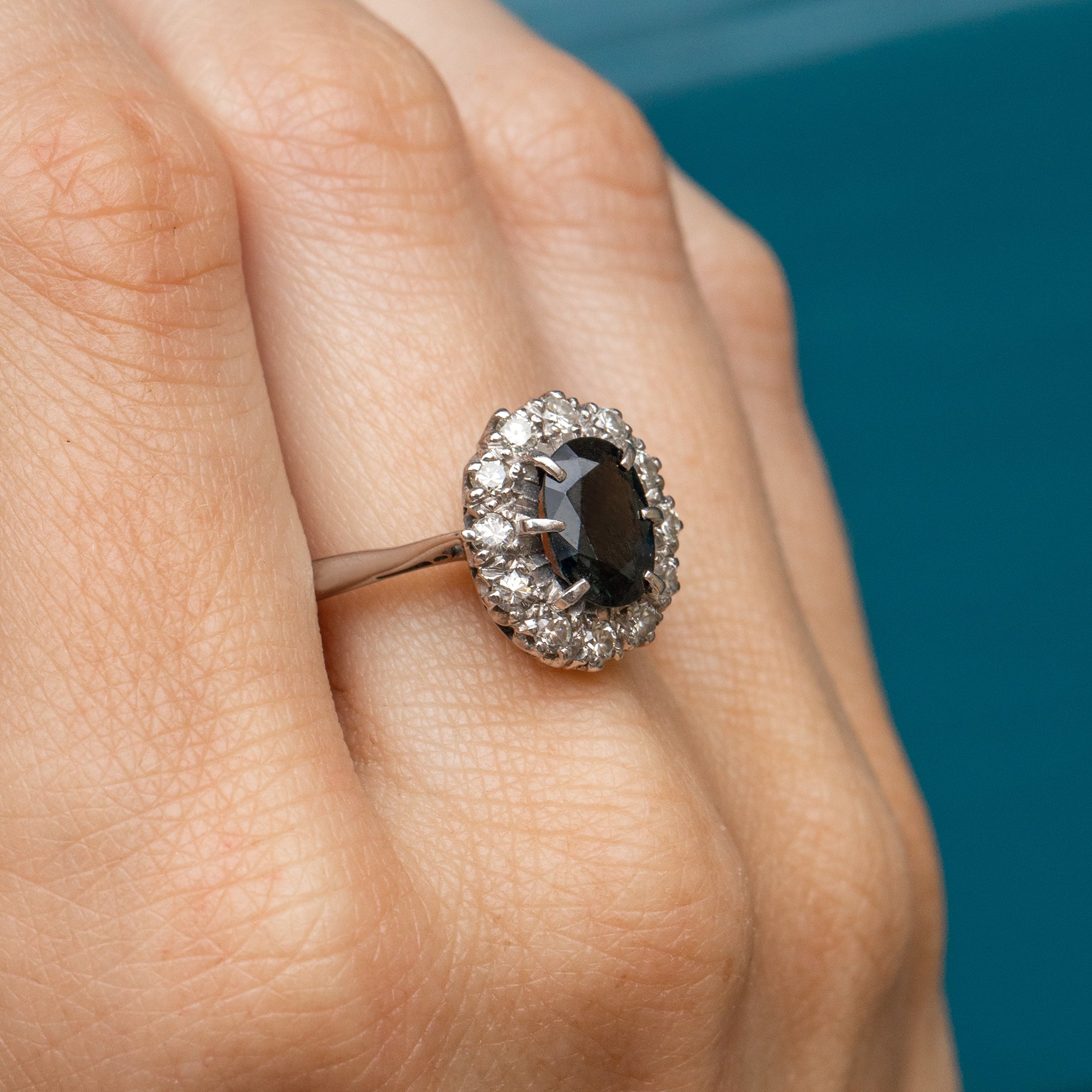 A striking antique natural Sapphire Diamond ring to adorn your finger! This gorgeous ring is home to a 1.60ct natural blue Sapphire, with a 0.25ct halo of sparkling Diamonds.