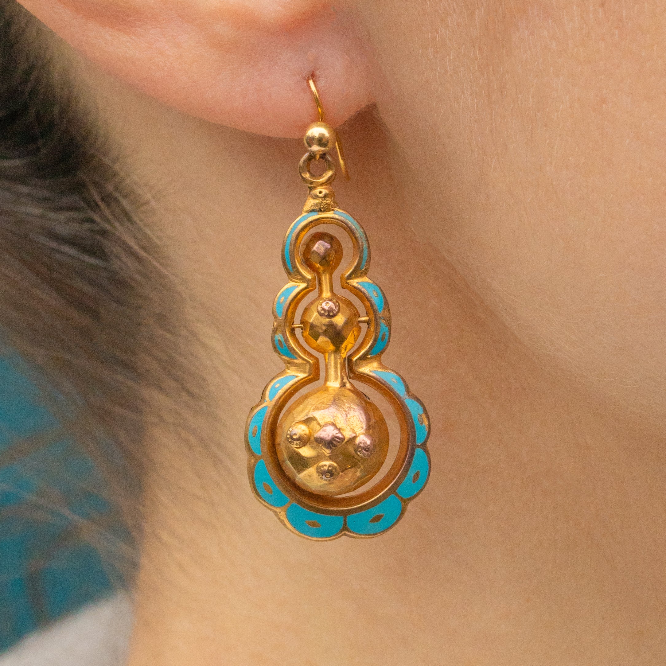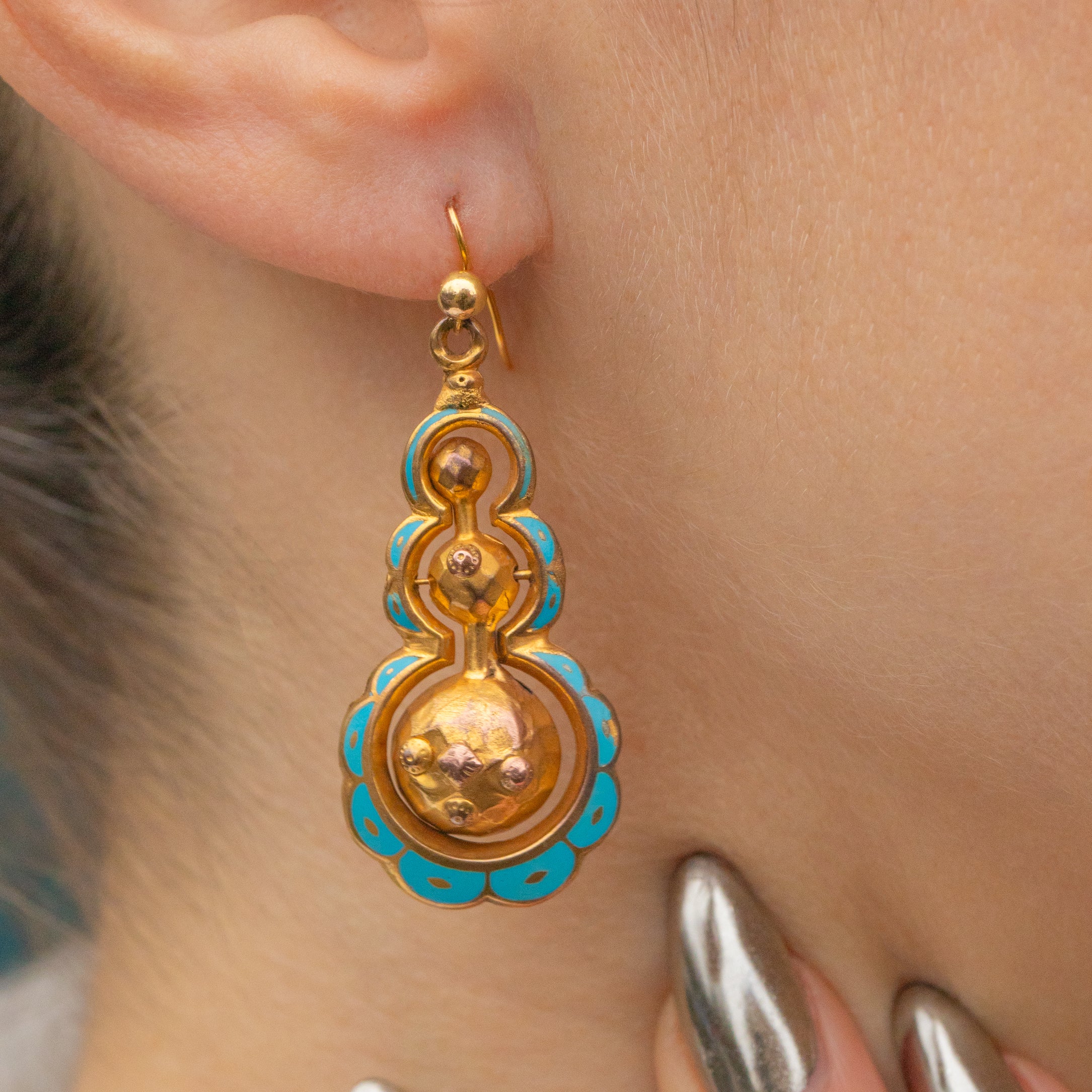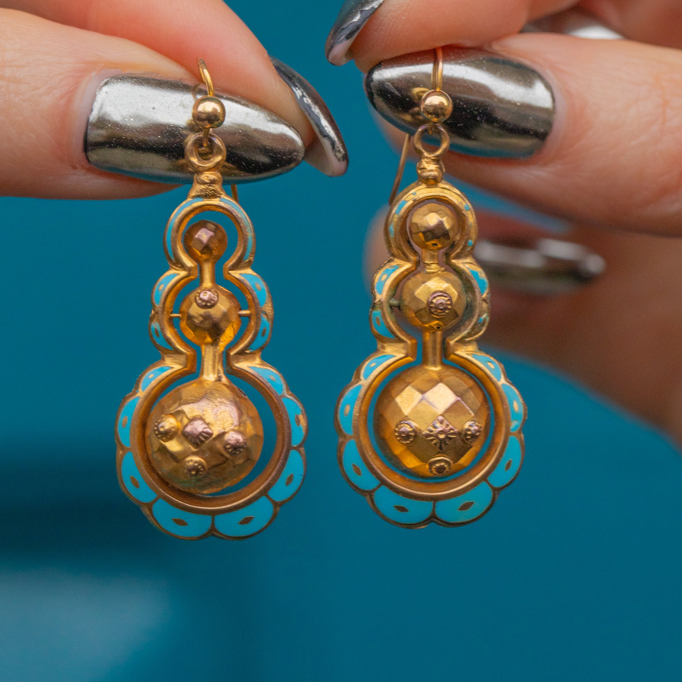 Each earring features a pendulum orb in its centre, dancing with movement as they suspend from your lobes. Accented with vibrant blue Enamel, these Victorian drop earrings are the perfect pair to add a pop of colour and unique allure to your collection.