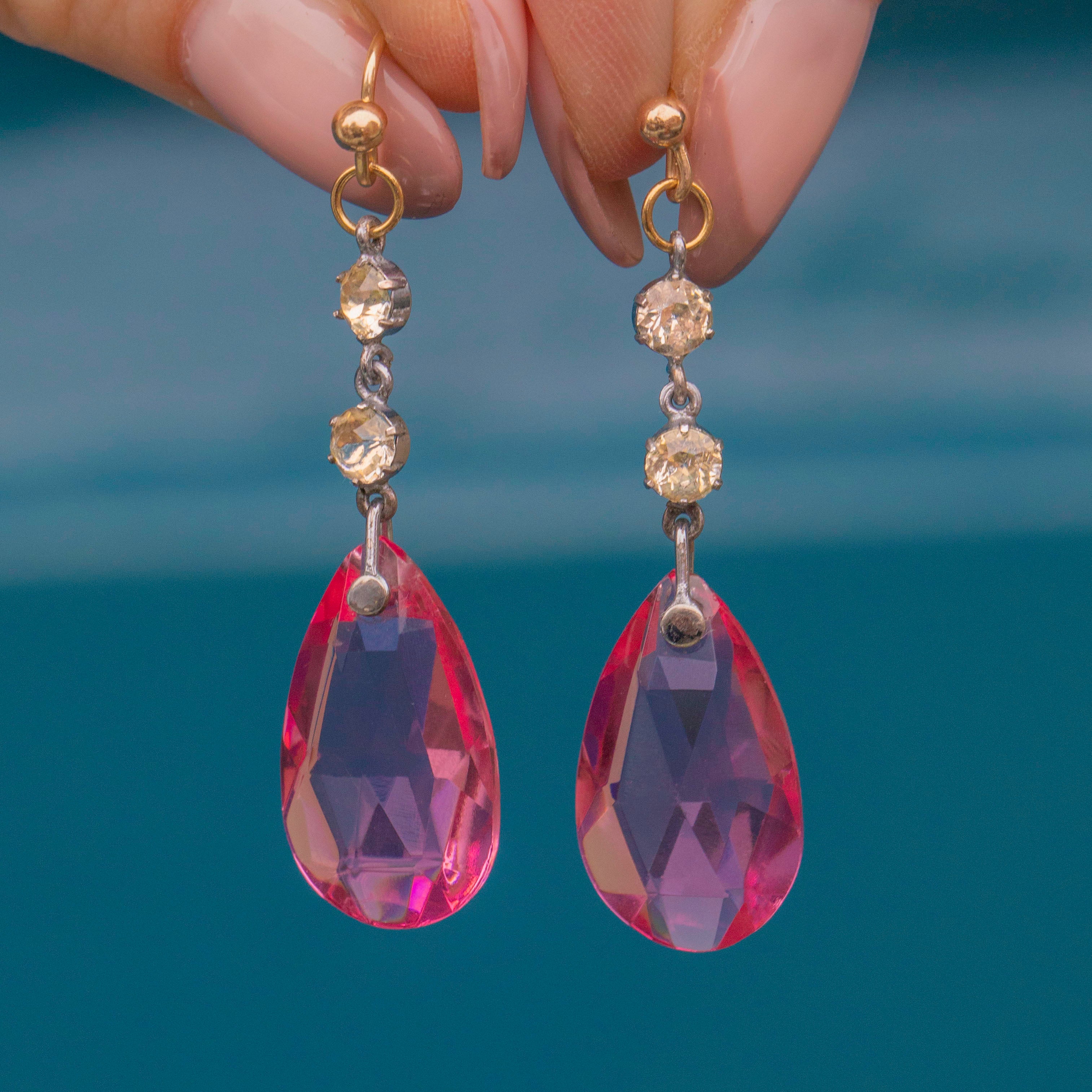 GOOD-VERY GOOD. These antique pink Paste drop earrings are in great condition. The Paste are vibrant and bright with some minor nibbles and signs of wear, commensurate with age, but this won't be noticeable during wear. Each component is securely affixed and the Paste are all firmly held in place. With slender Gold hooks providing comfortable and confident wear, these Art Deco Paste earrings will provide you with much wearing pleasure!