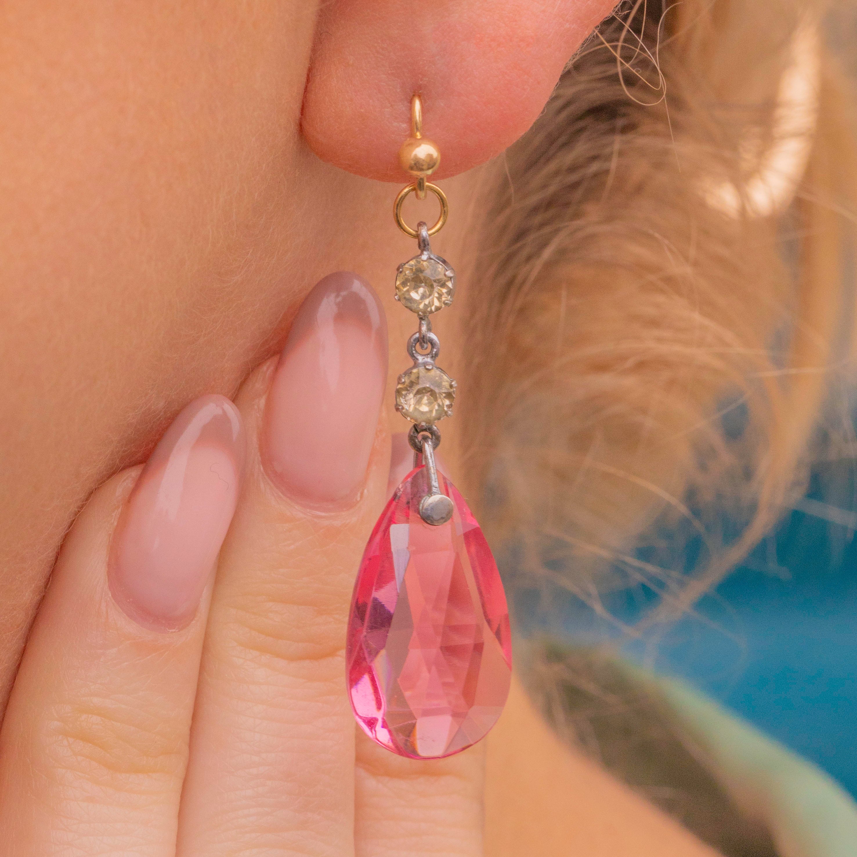 Antique Pink Paste Drop Earrings, 9ct Gold Hooks
