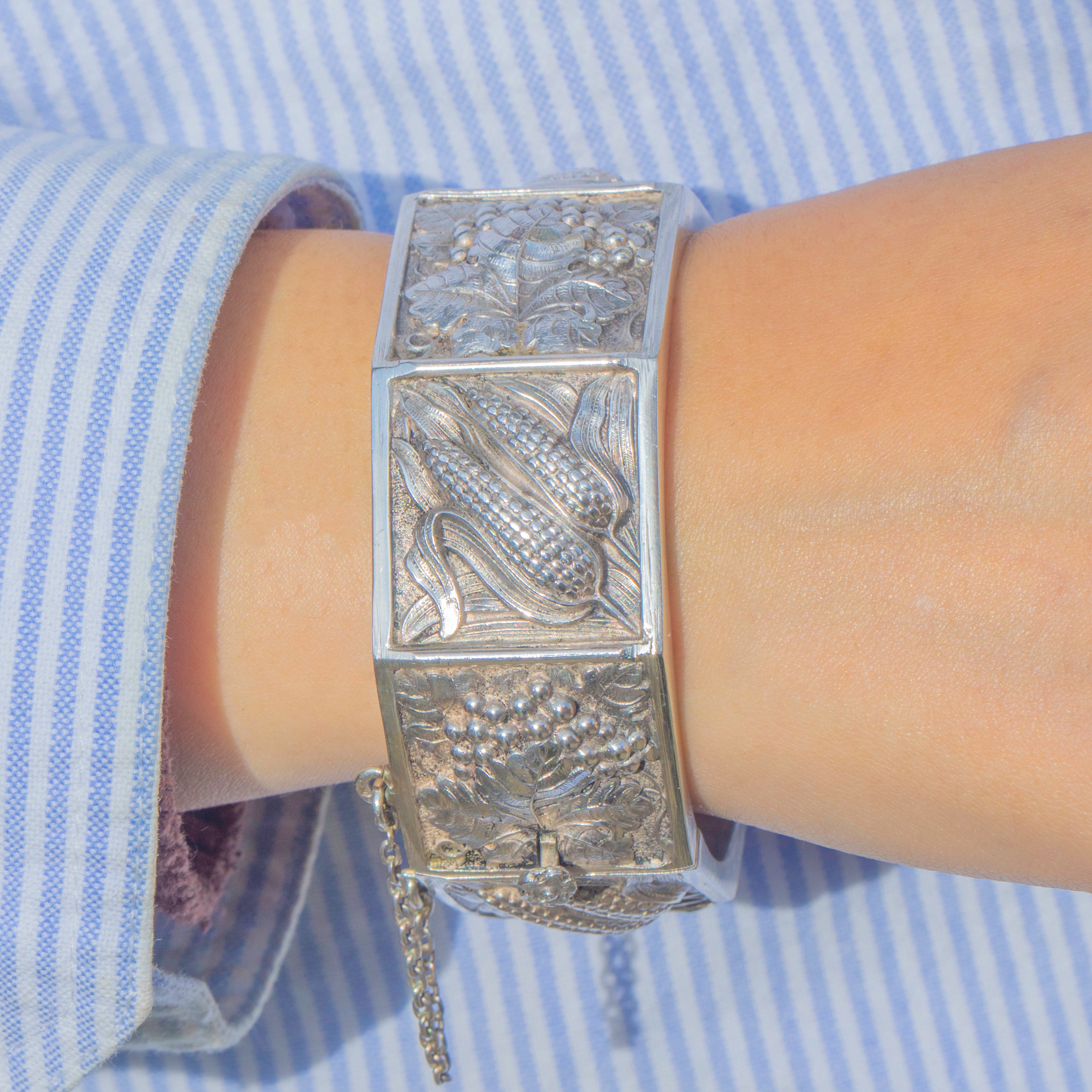 Antique Portuguese Silver Harvest Motif Bangle, 7"