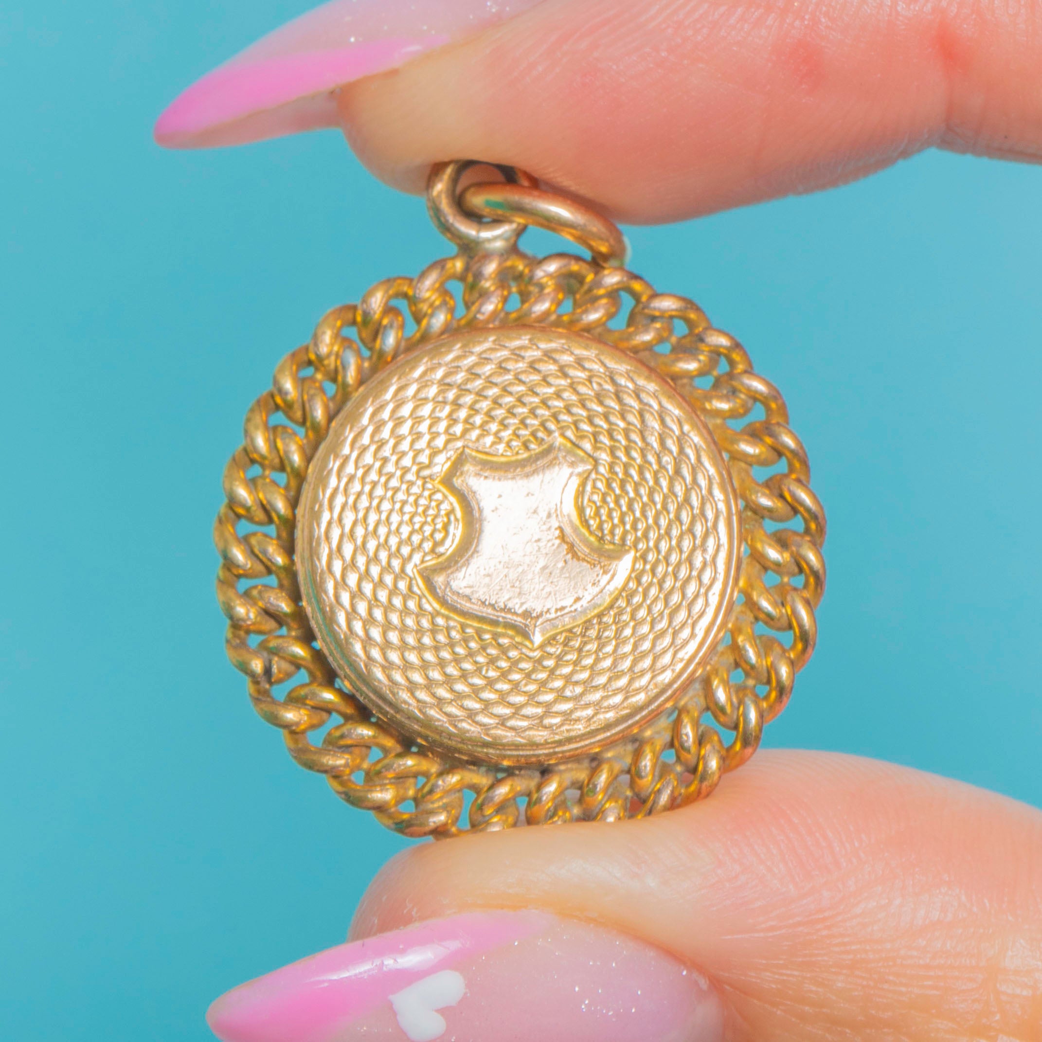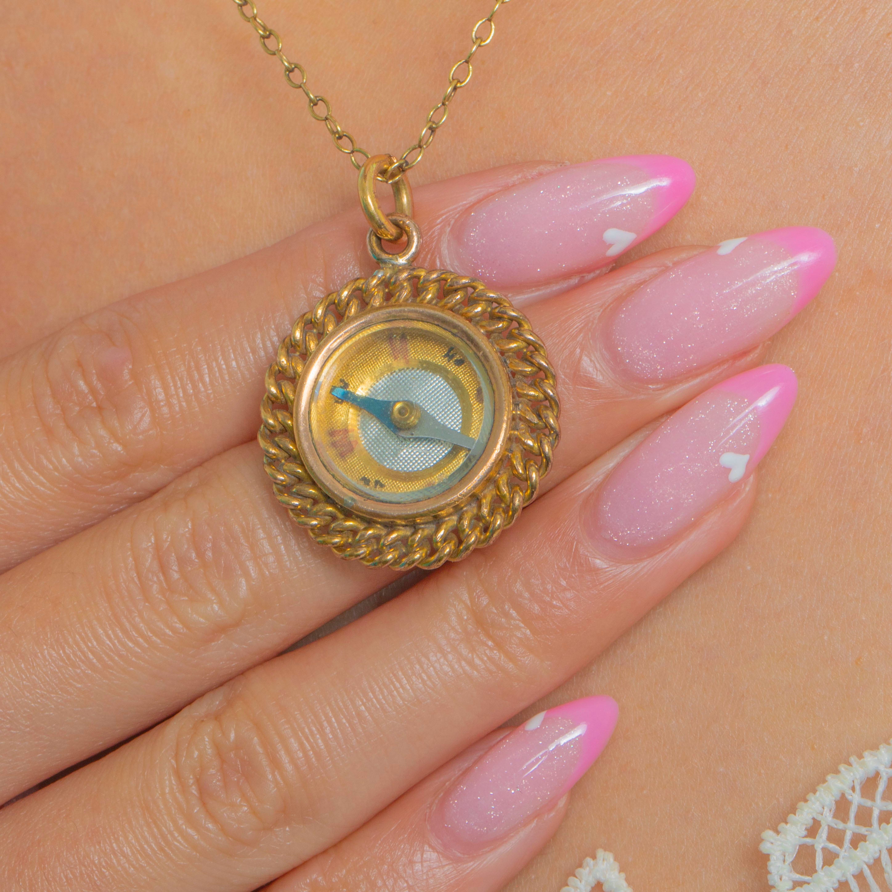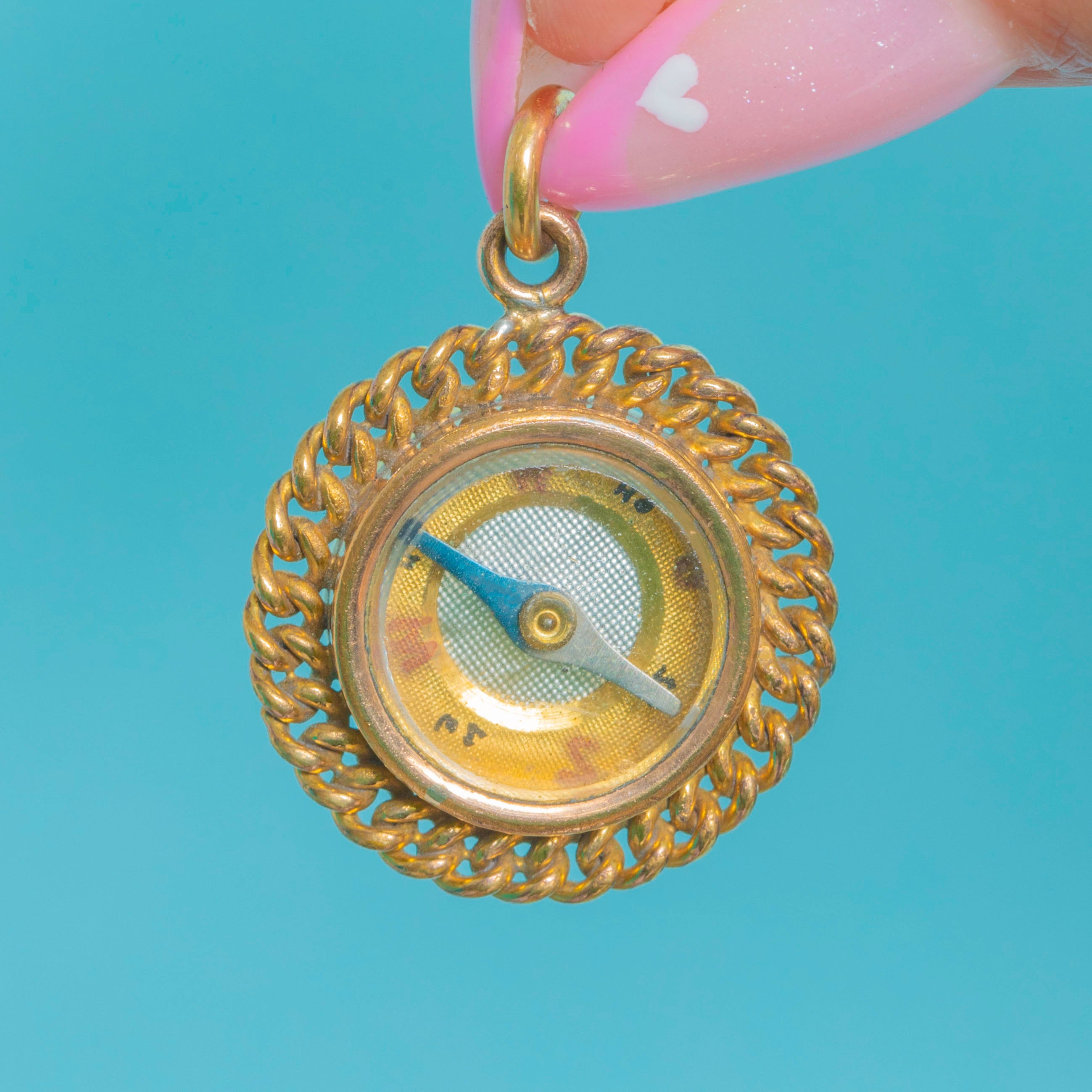 VERY GOOD: Compass face is clear and functional. Gold-tone casing remains bright with only light surface wear from age. Jump-ring securely soldered and ready to wear.