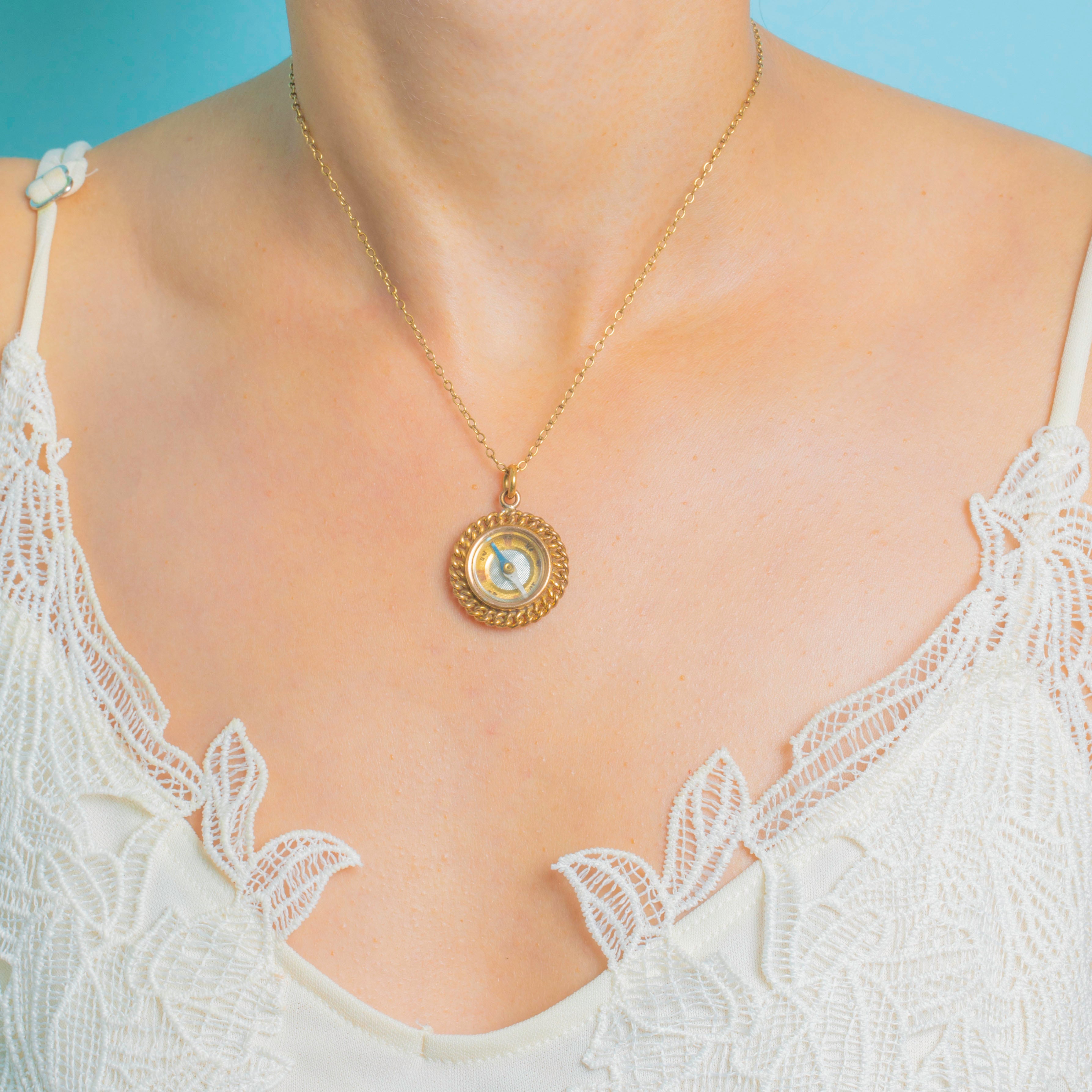 The working compass is housed in a gold-tone metal case, giving the warm appearance of Gold, and finished with a solid 9ct Gold jump-ring for secure wear.