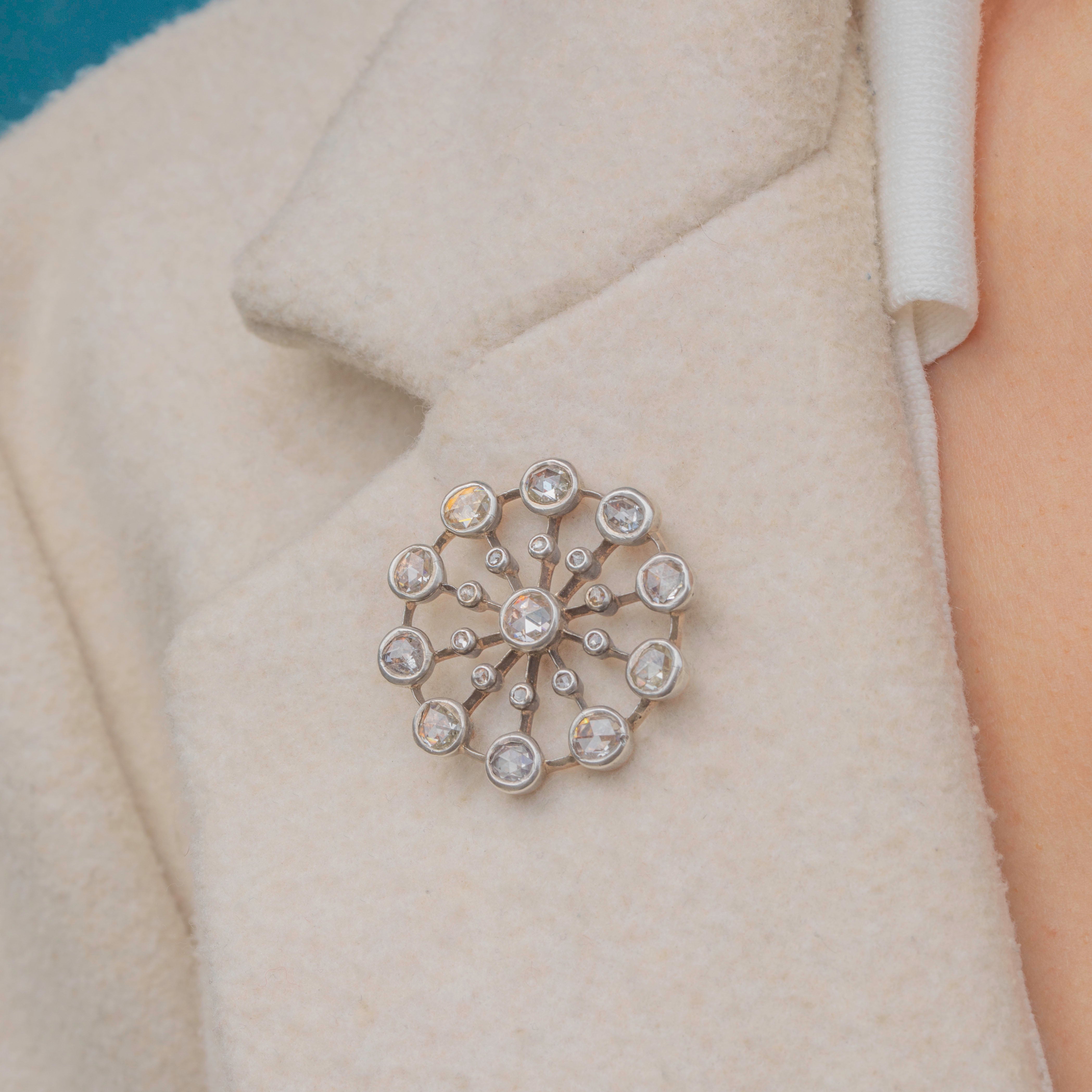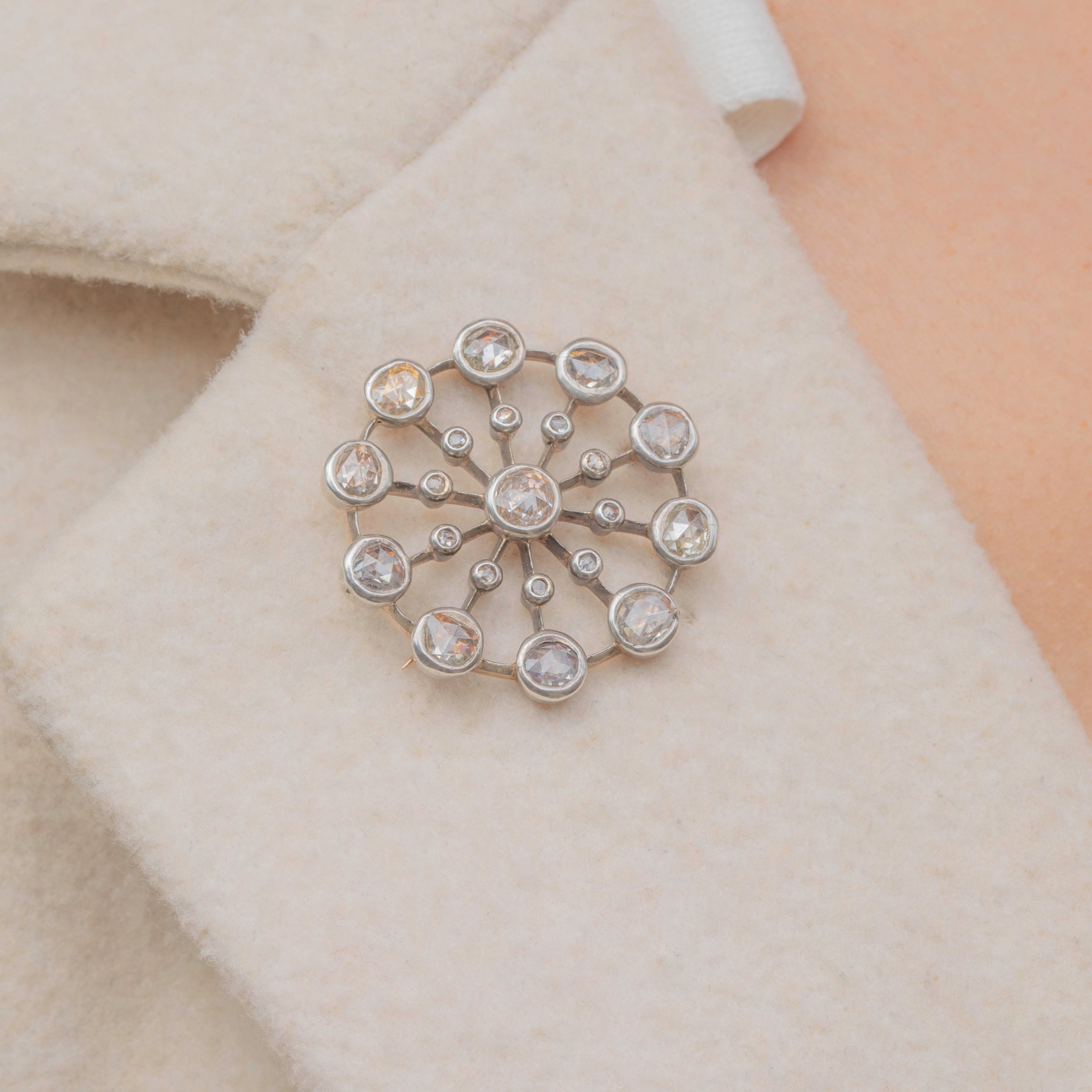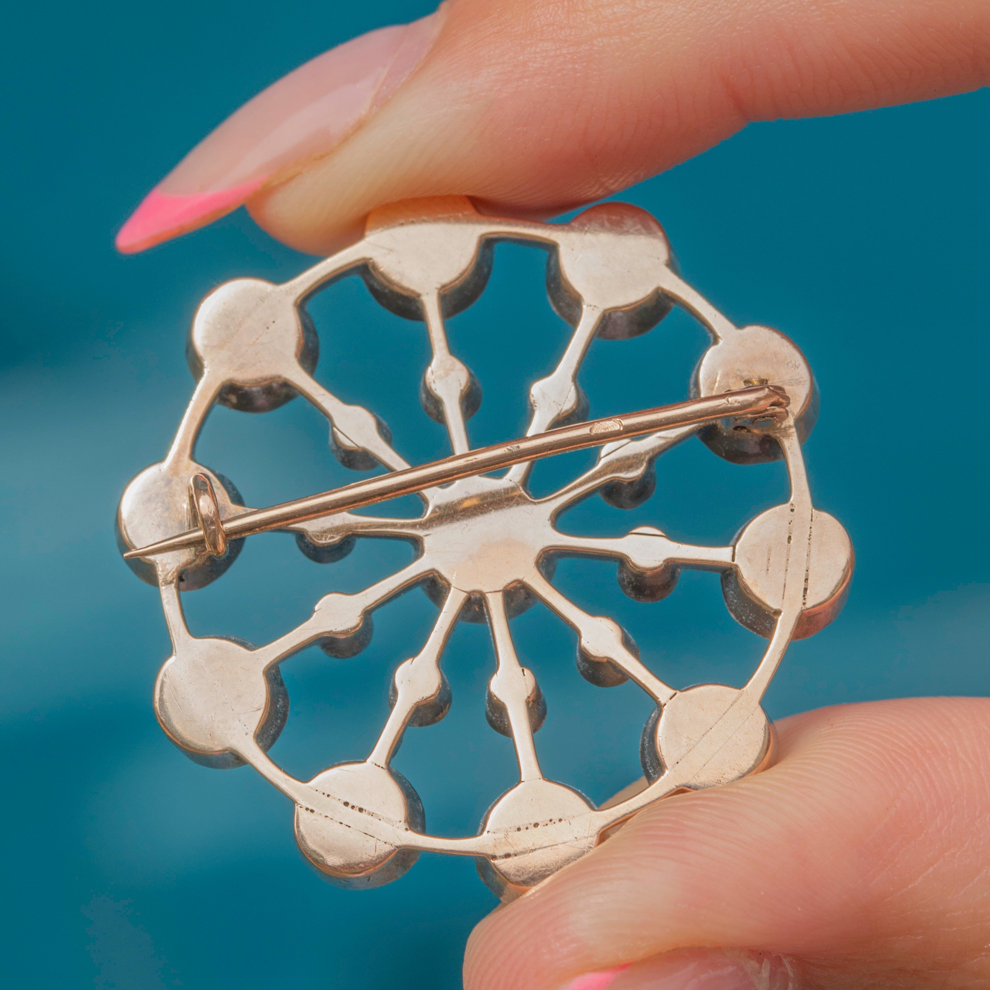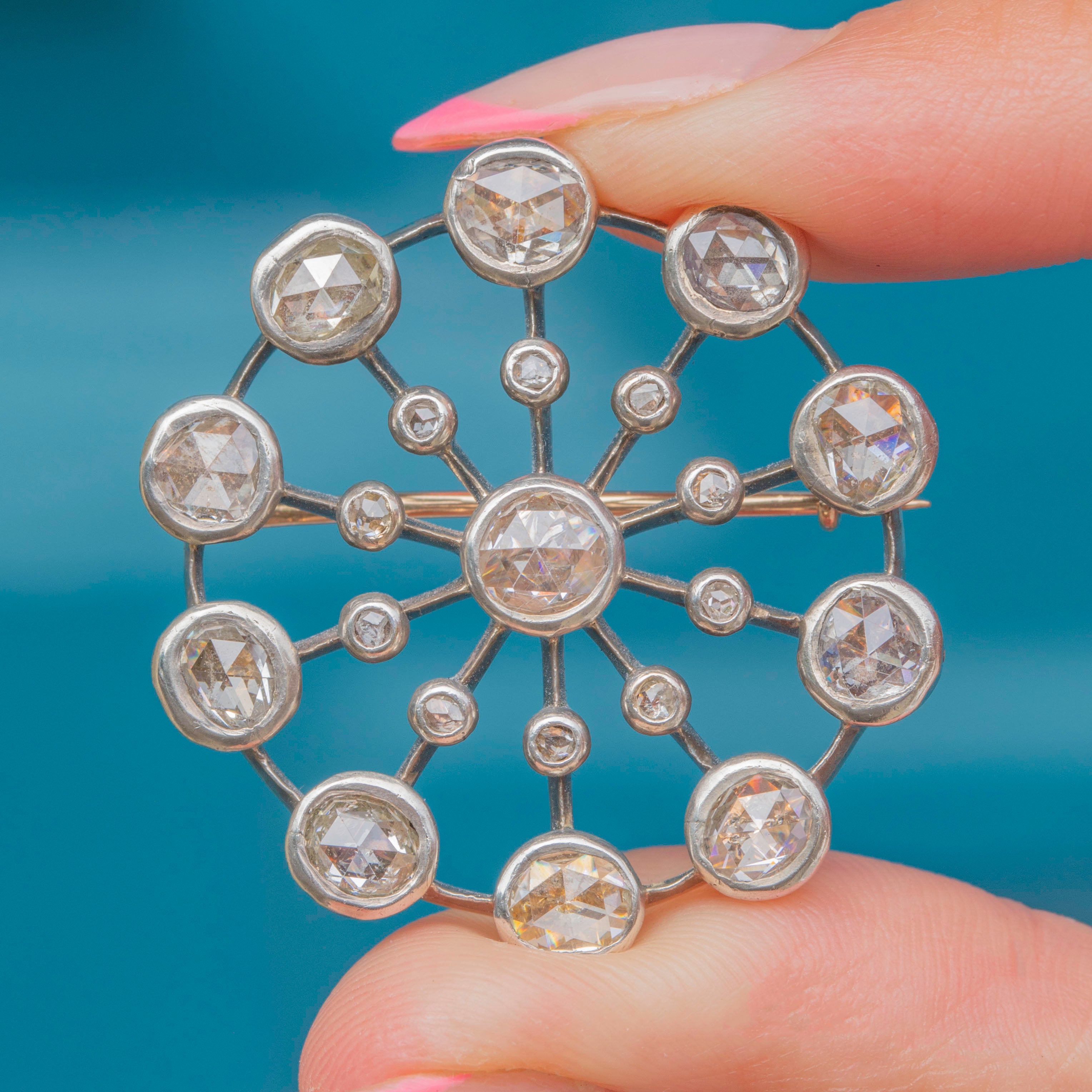 This antique 15ct Gold rose-cut Diamond cluster brooch is quite the statement piece! Akin to a burst of scintiallting stars, this Victorian brooch boasts twenty-one rose-cut Diamonds, with a combined 3.33cts, that will catch the light from every direction, whatever the lighting conditions.