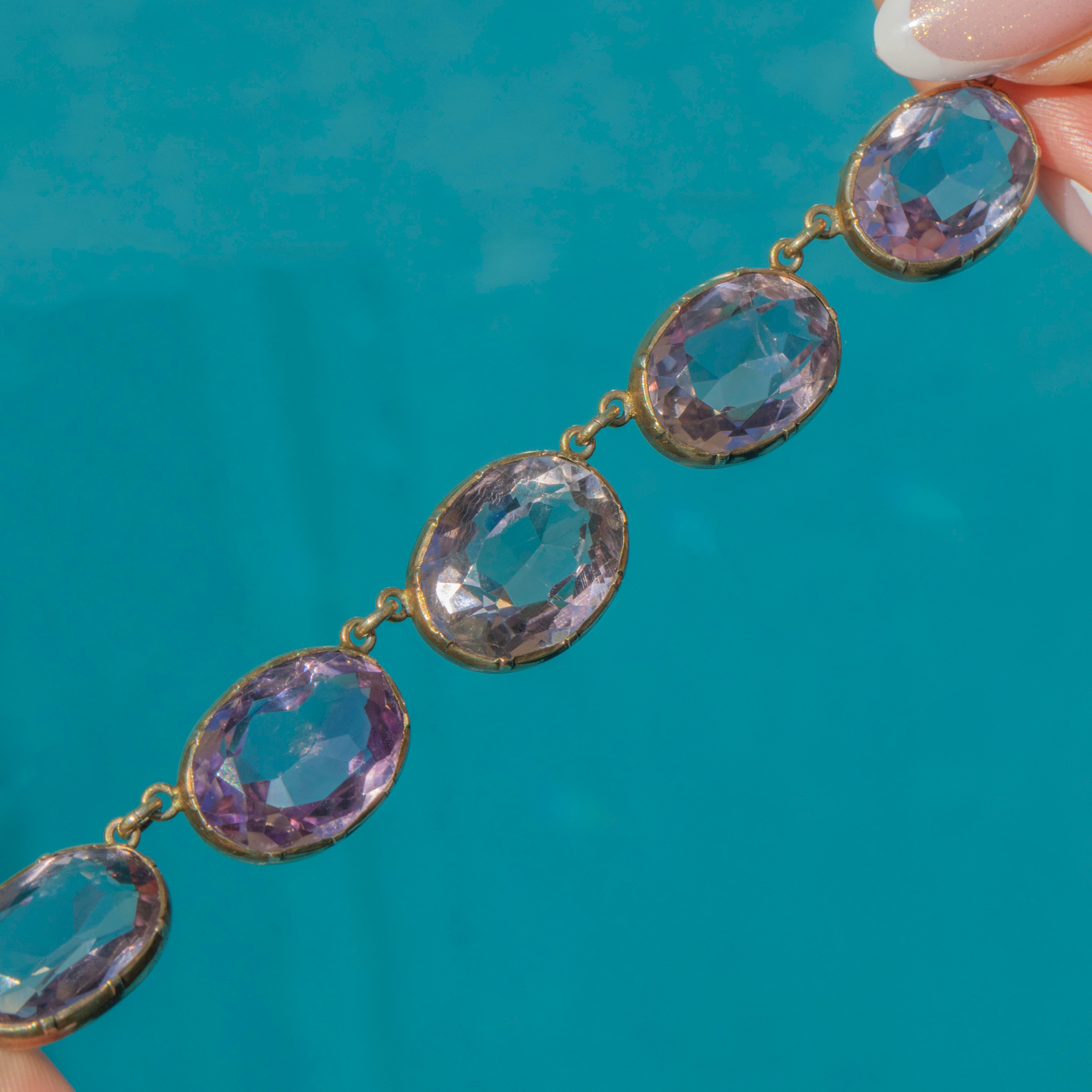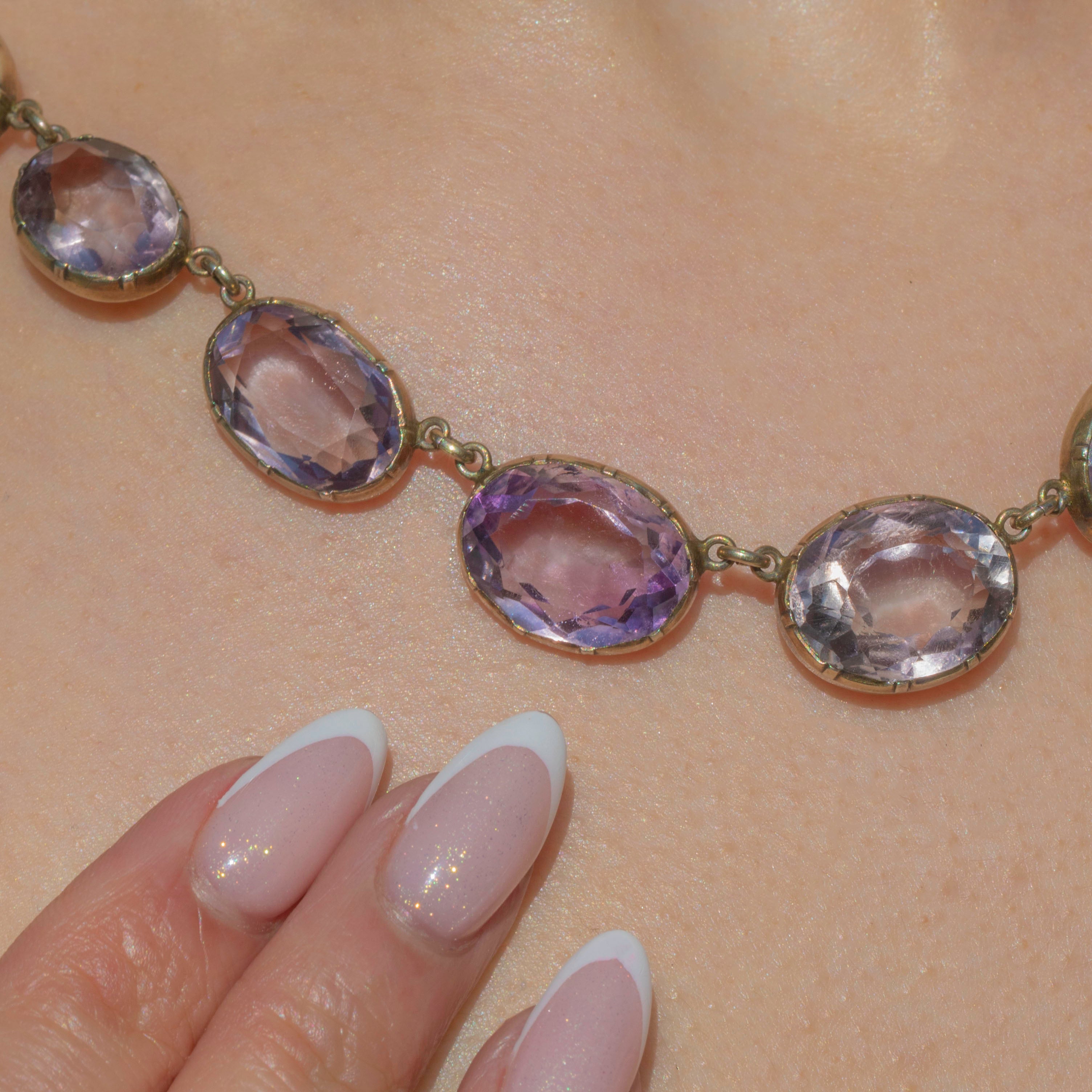 VERY GOOD TO EXCELLENT. This antique Silver Amethyst rivière necklace is in wonderful condition. The Amethysts all have their own pretty lilac hue, and they are all securely set. The necklace likely once had a bright 9ct Gold gilded finish, but this has slowly faded over the years to something more subtle. The necklace closes with a bolt ring so you can wear it securely.