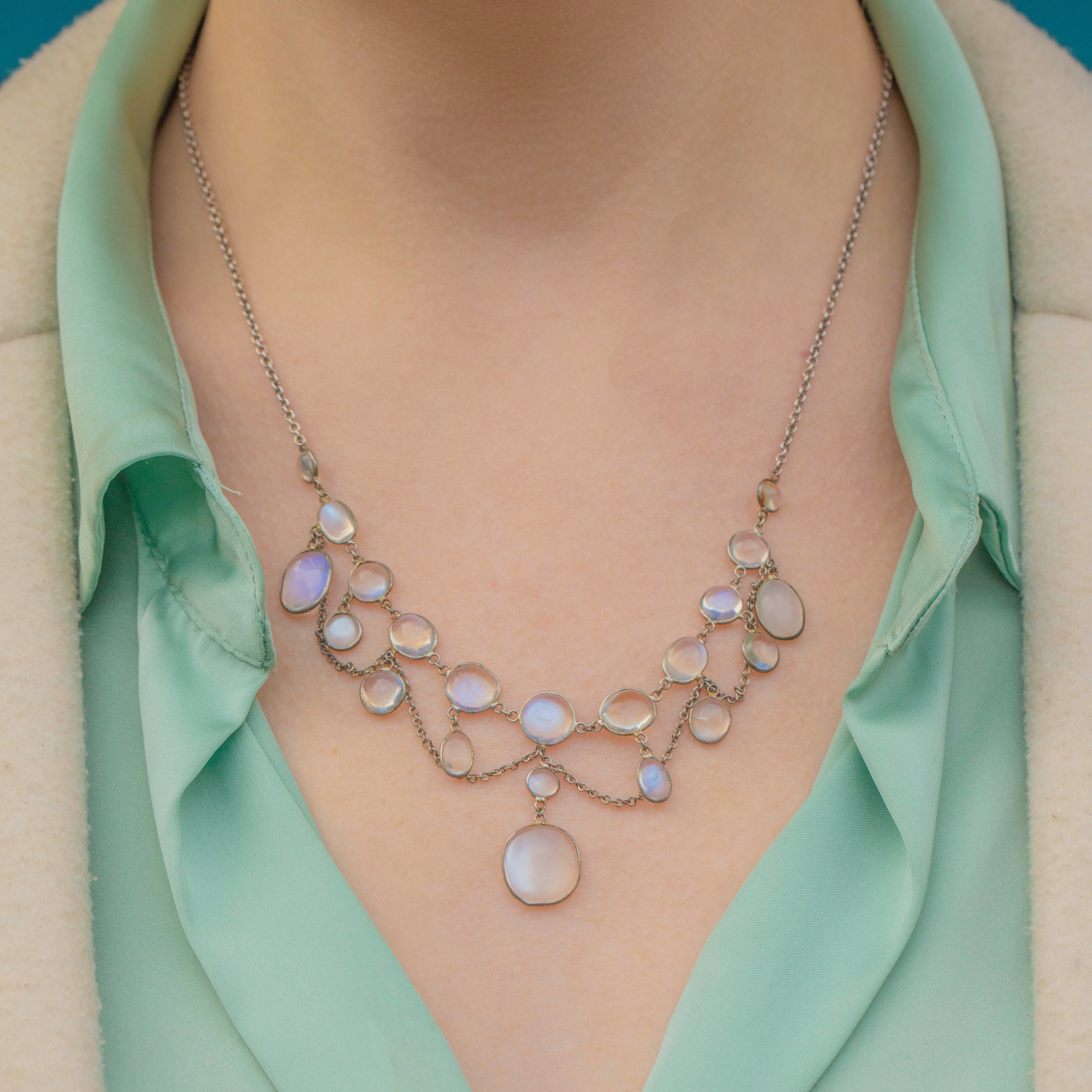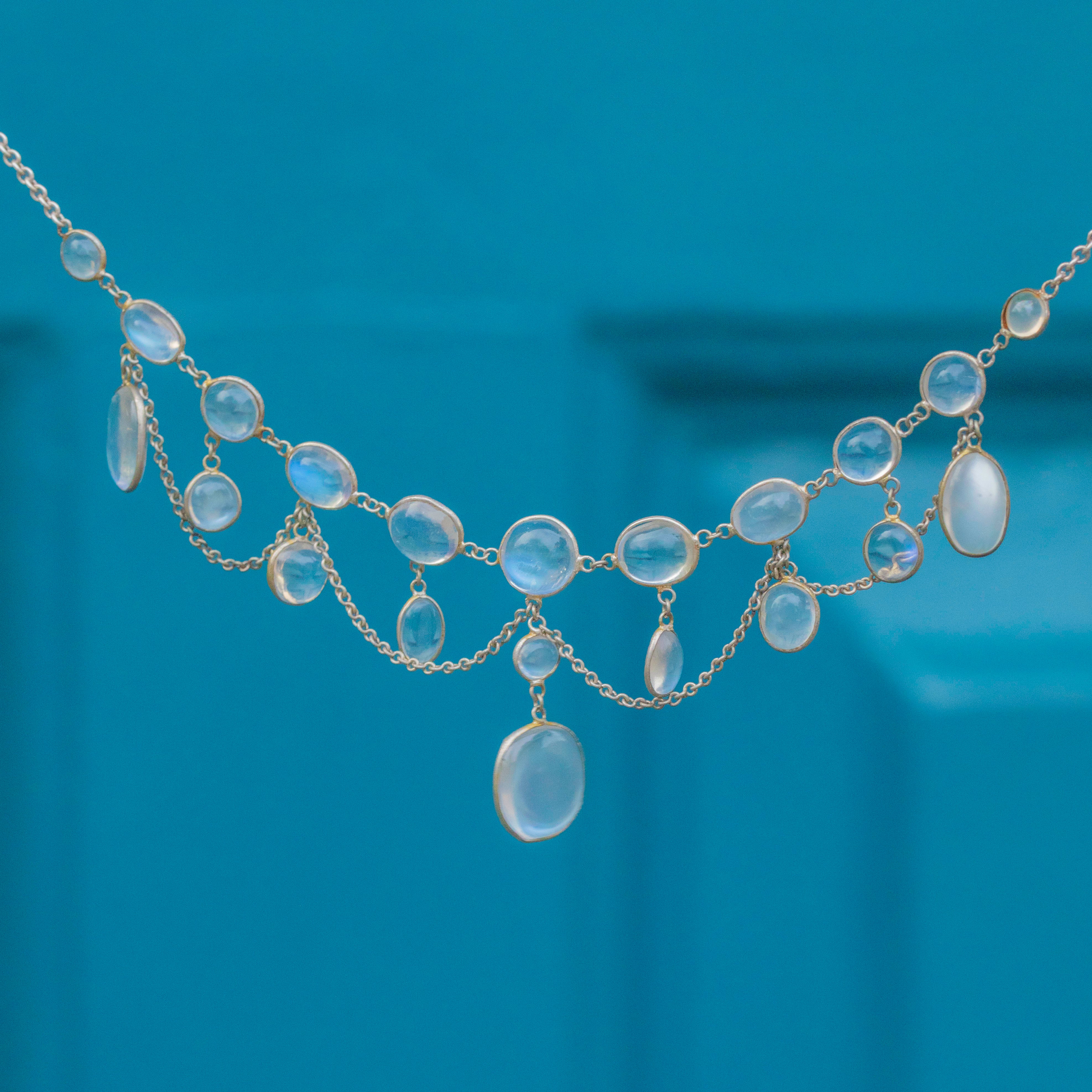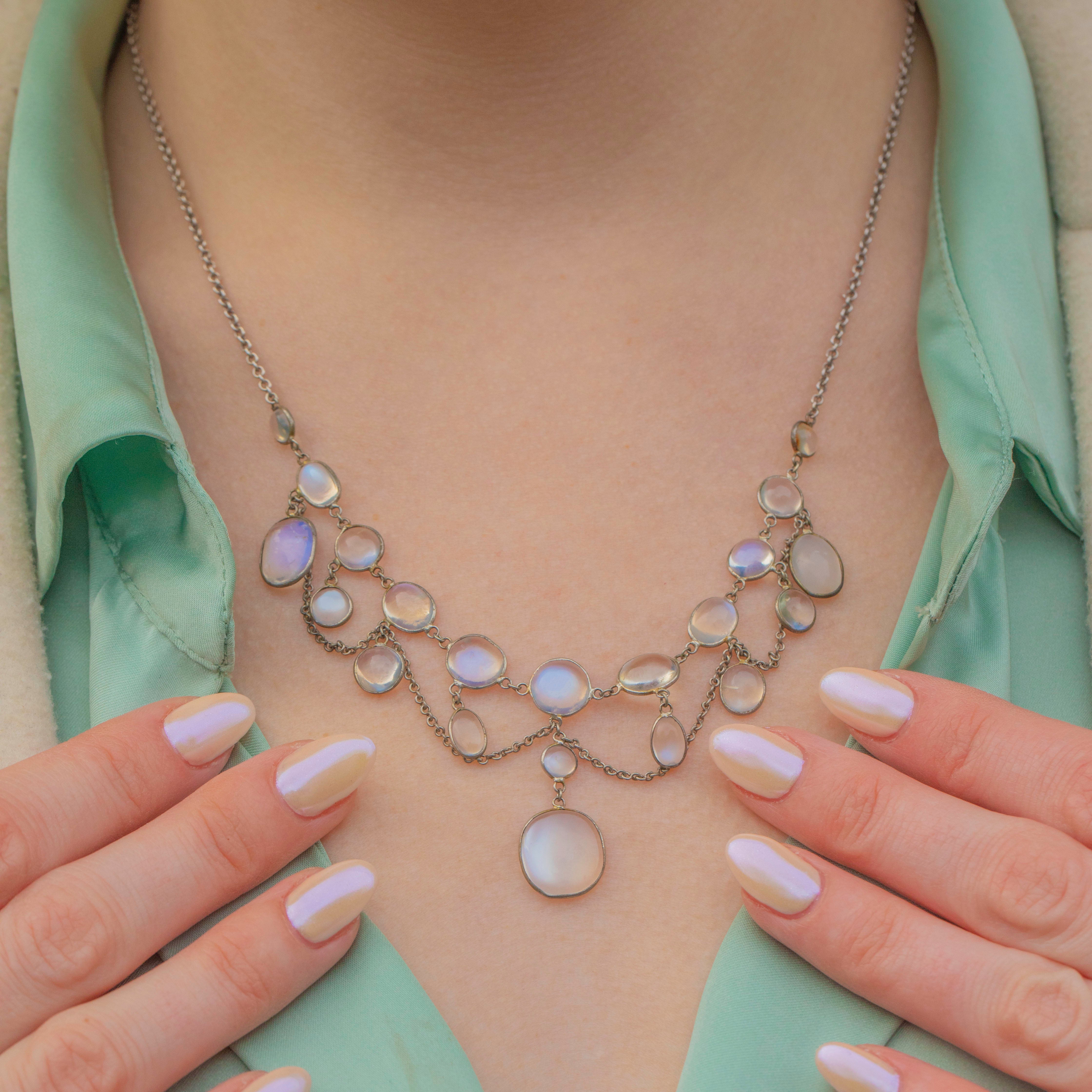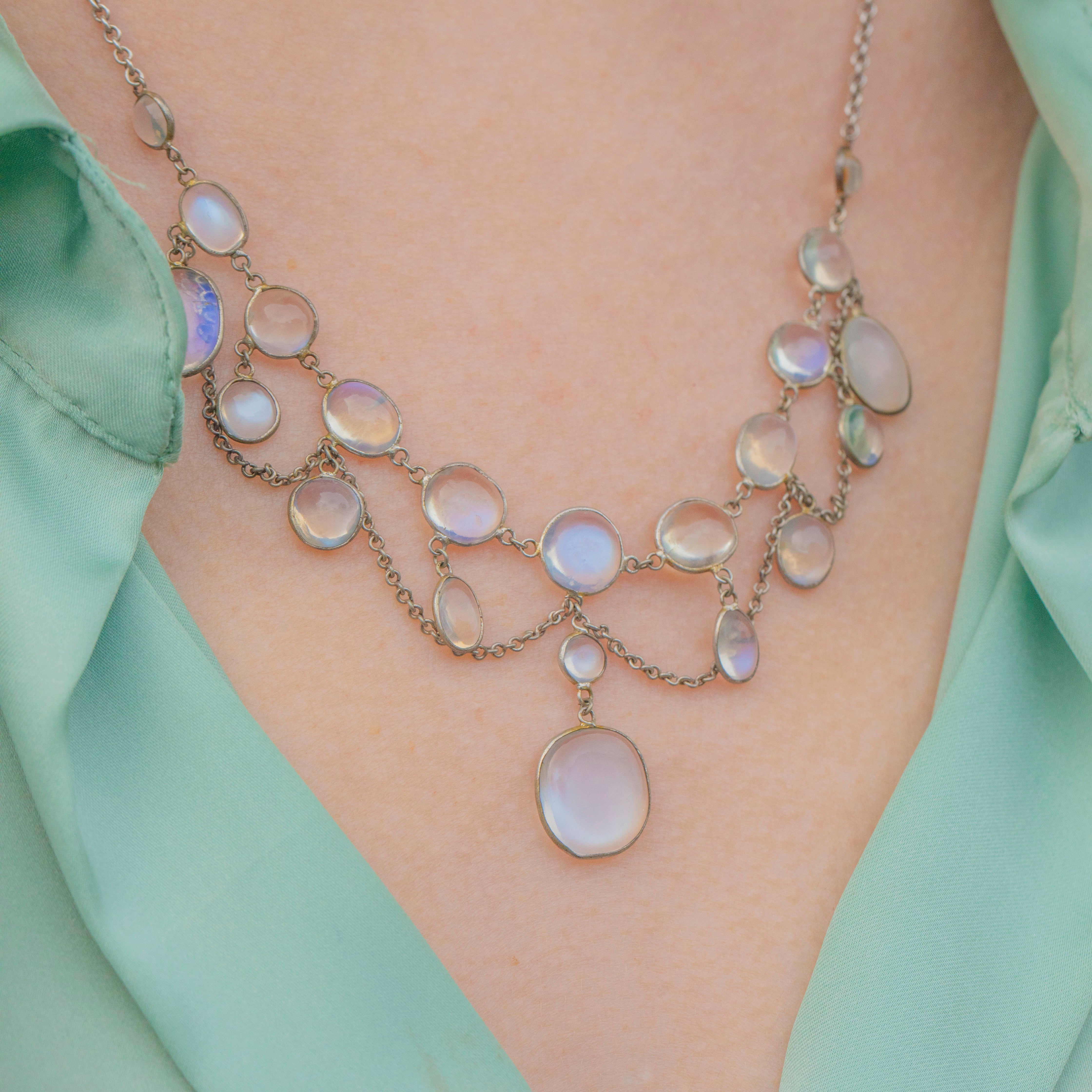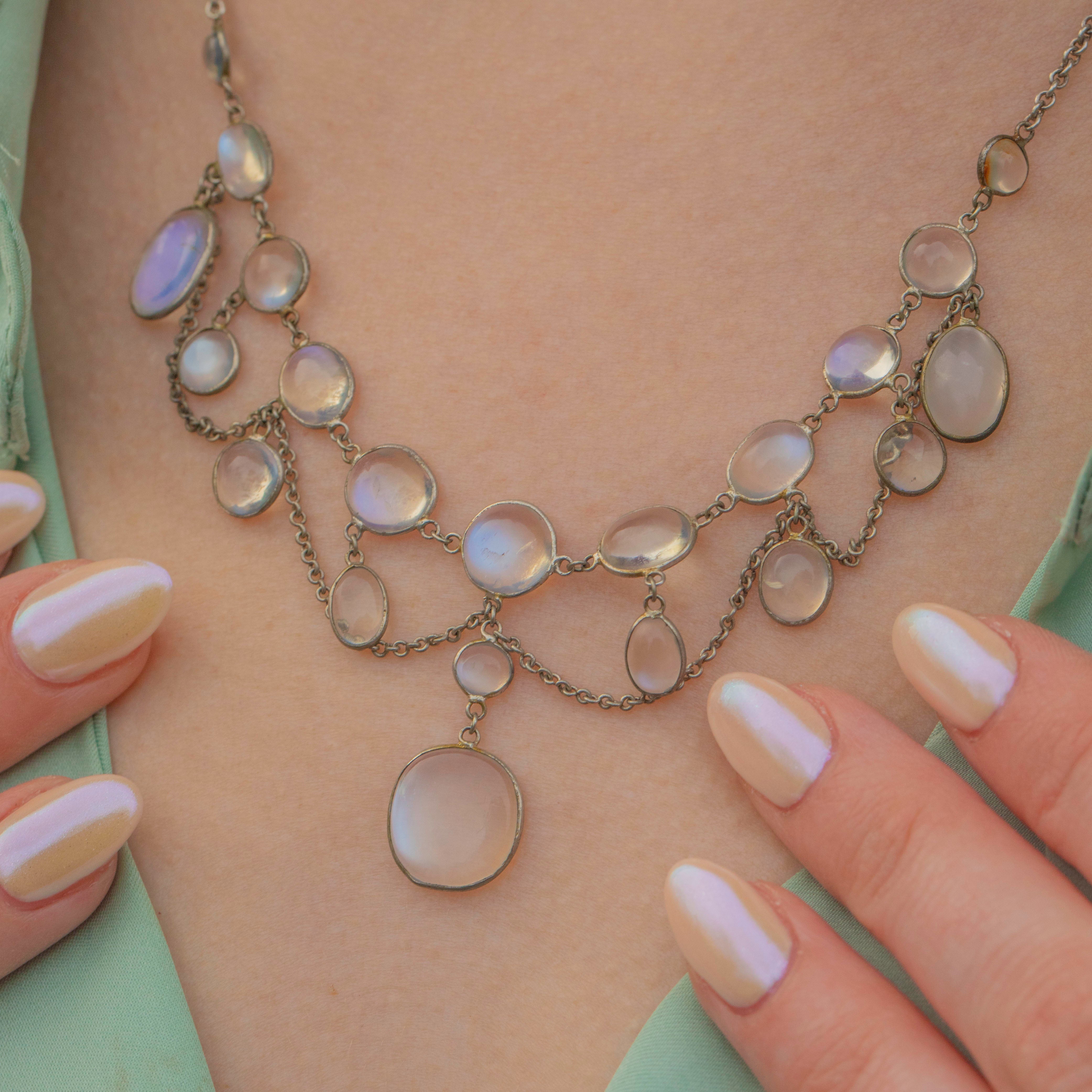 Crafted from sterling Silver, this Victorian necklace boasts twenty one gorgeous ceylon Moonstones. Each capture the light wonderfully, displaying a stunning adularescence and creating an almost magical effect. They suspend in a fringe style, flowing like droplets of water upon your décolletage.