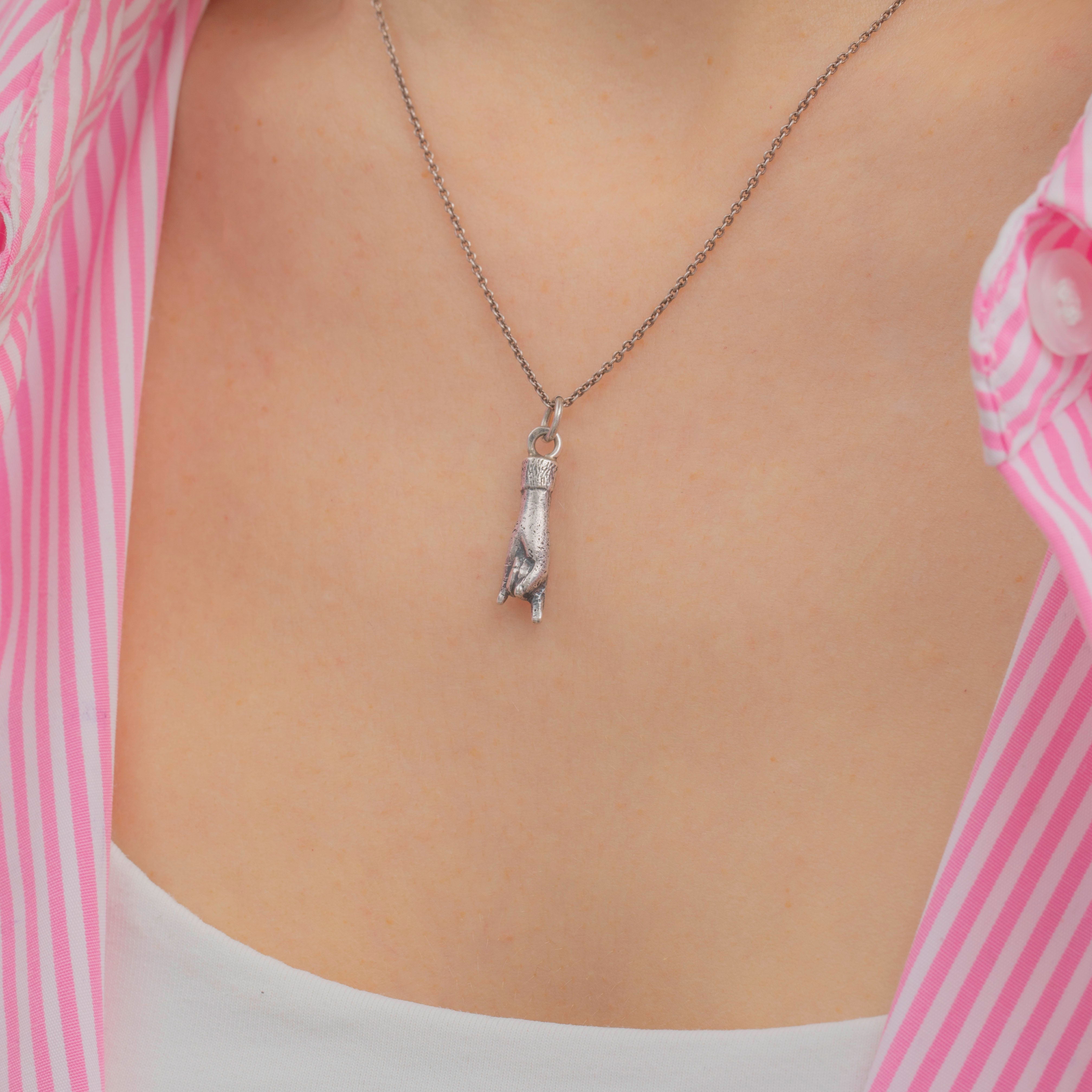 VERY GOOD-EXCELLENT. This antique Silver Figa hand charm is in wonderful condition, showcasing intricate craftsmanship with finely preserved details. The surface is slightly dappled but this is a result of the casting process and gives it a unique texture. Steeped in symbolism, this Victorian Figa pendant will make a lovely addition to your collection!