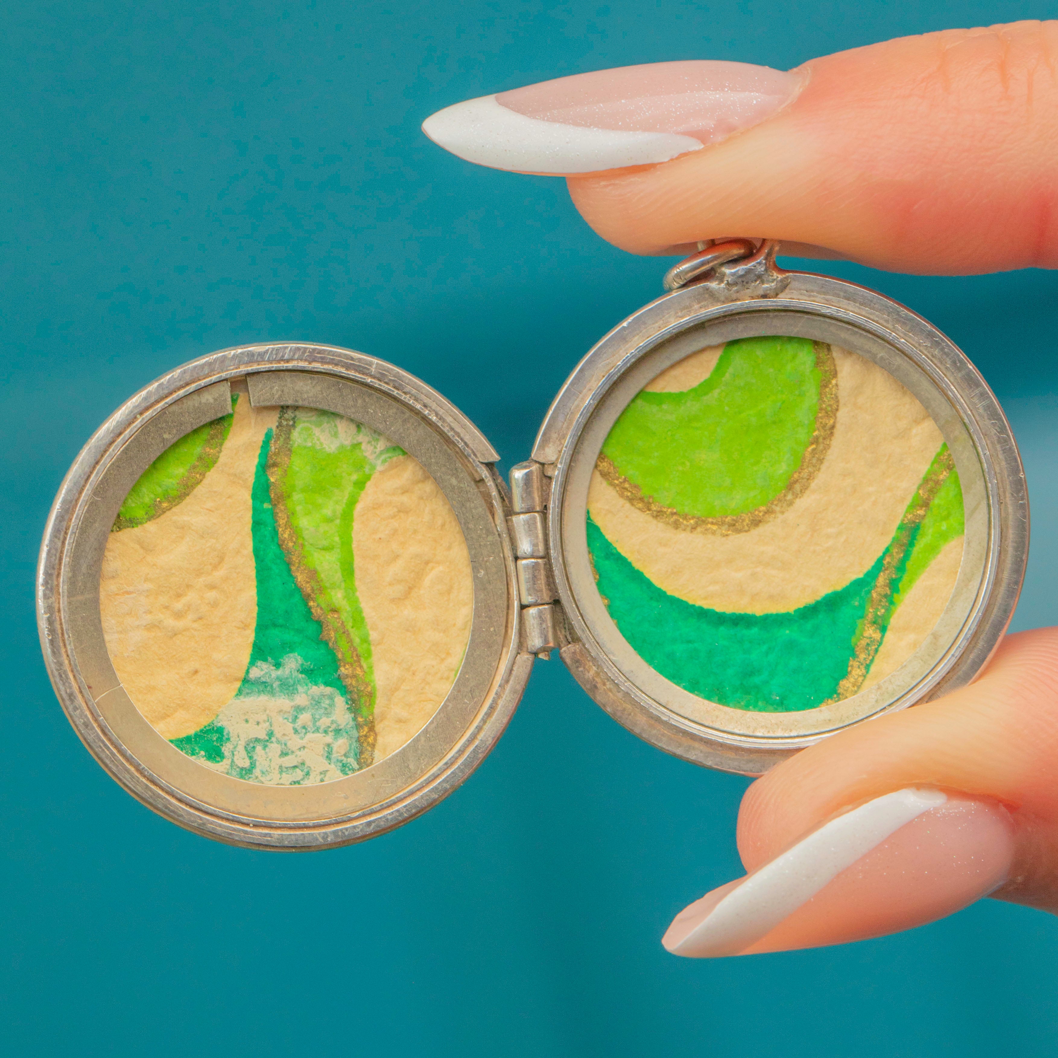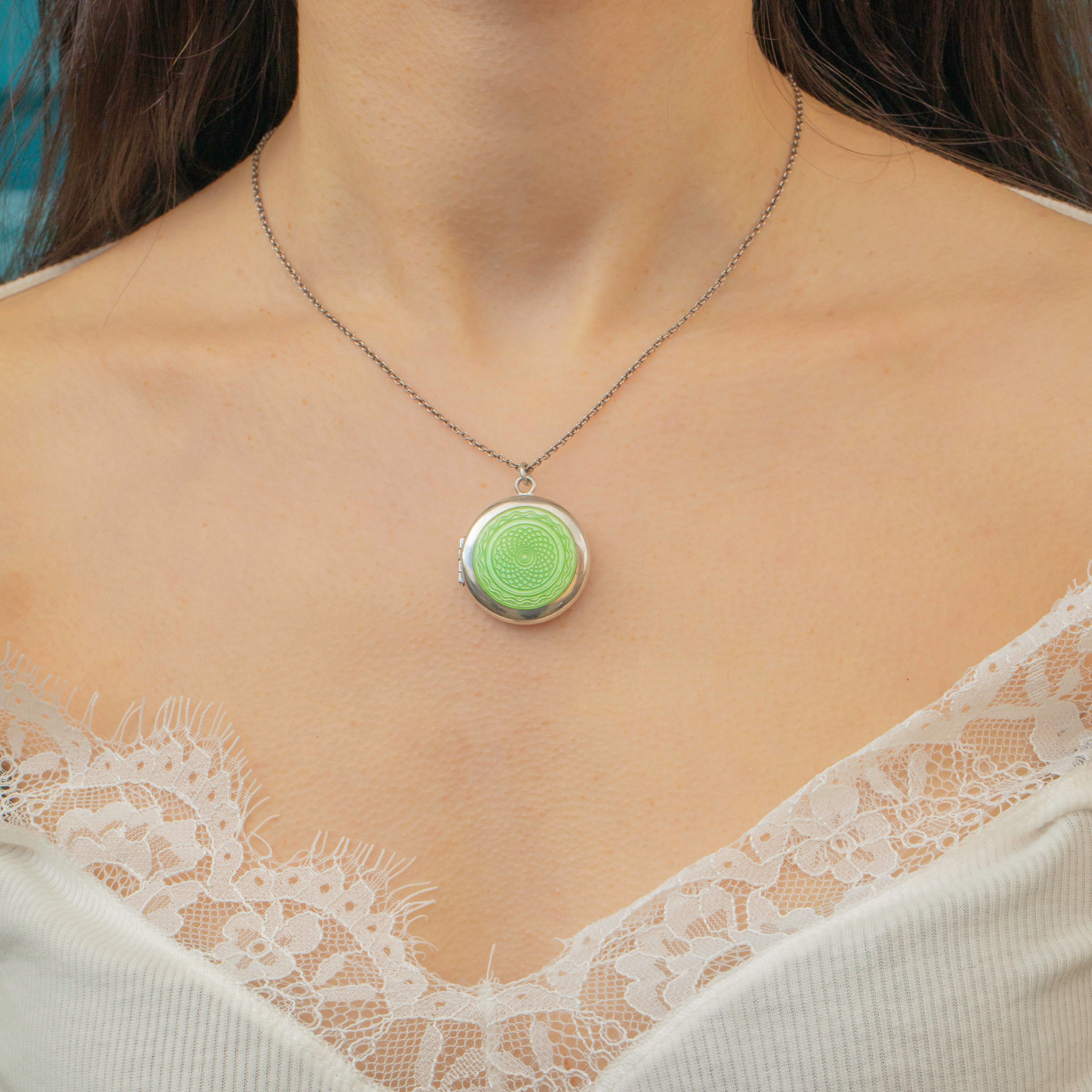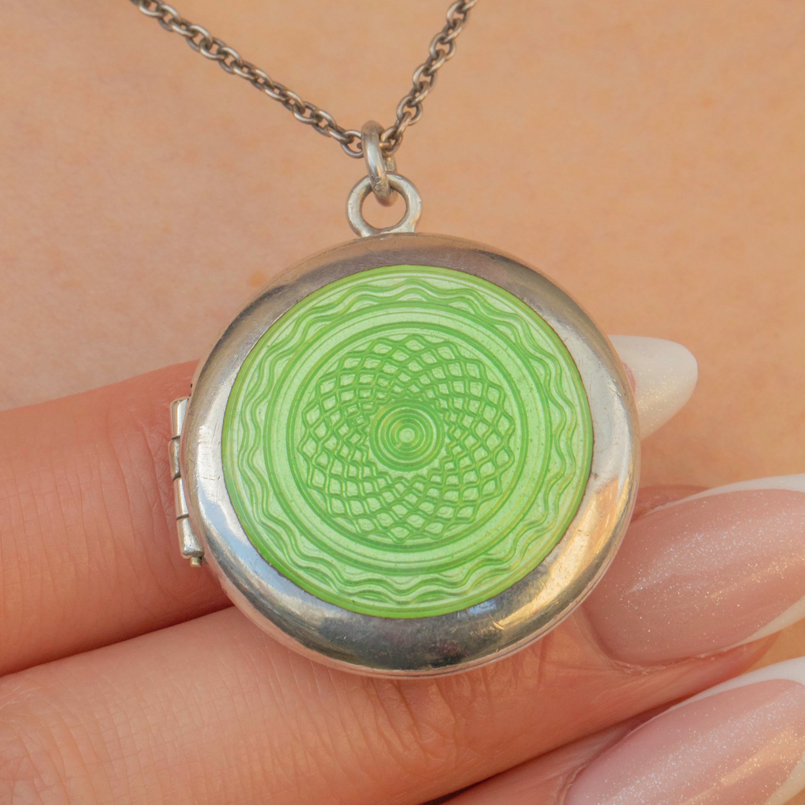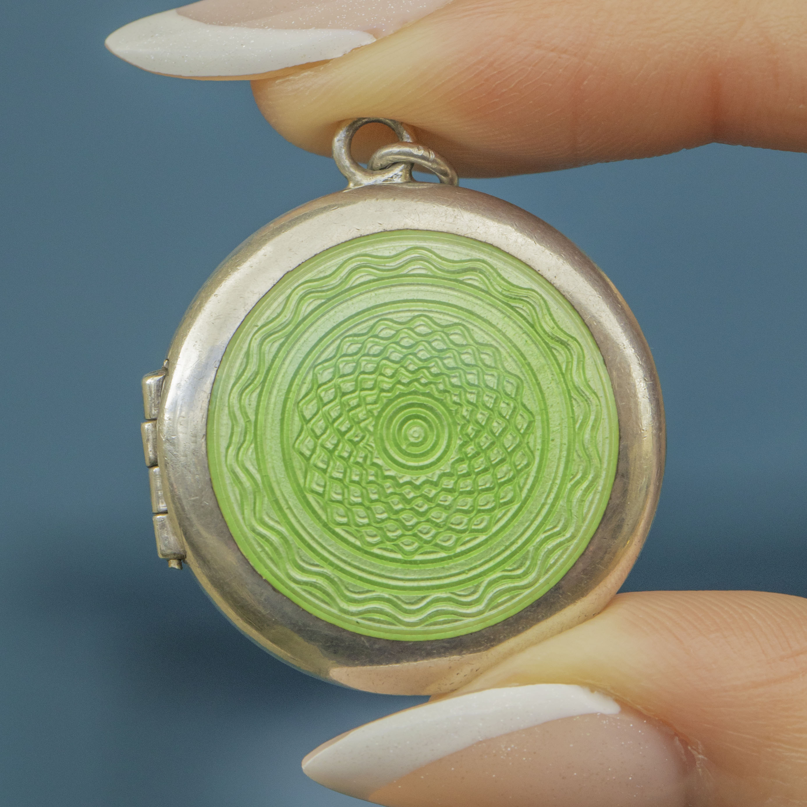 Add a pop of vibrant colour to your attire with this Art Deco Silver green guilloché Enamel locket!