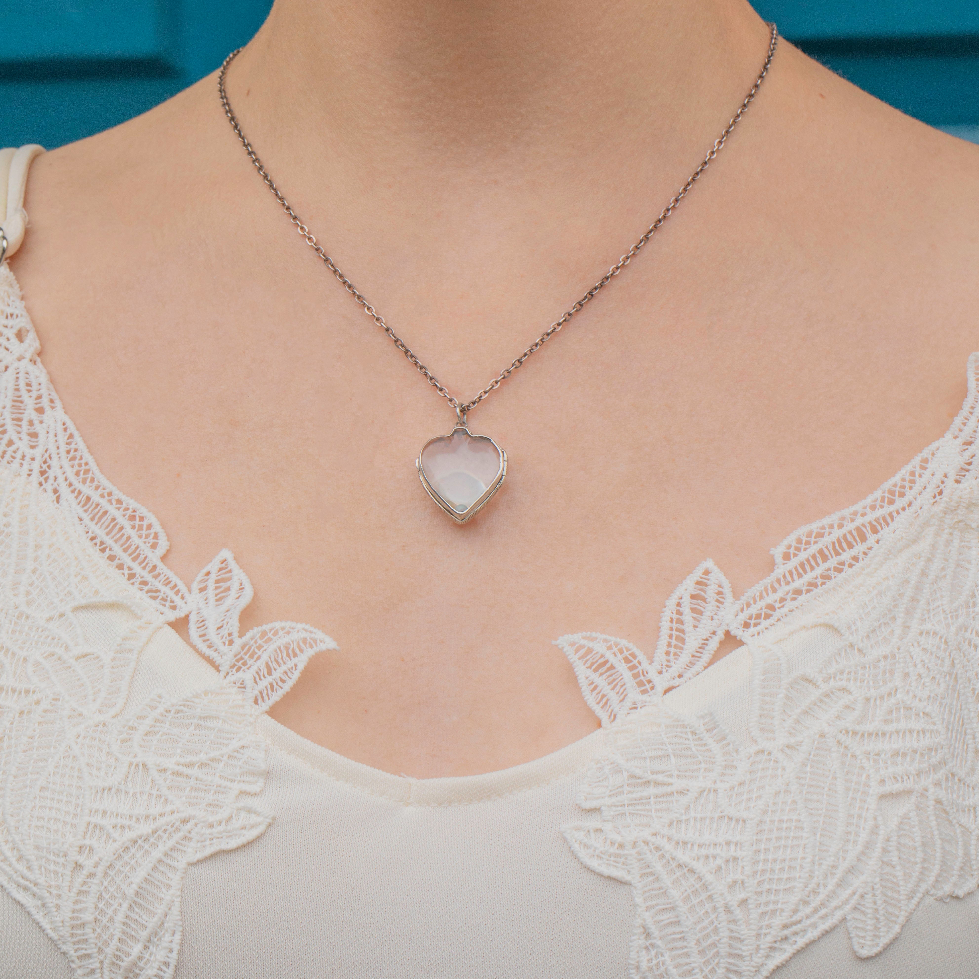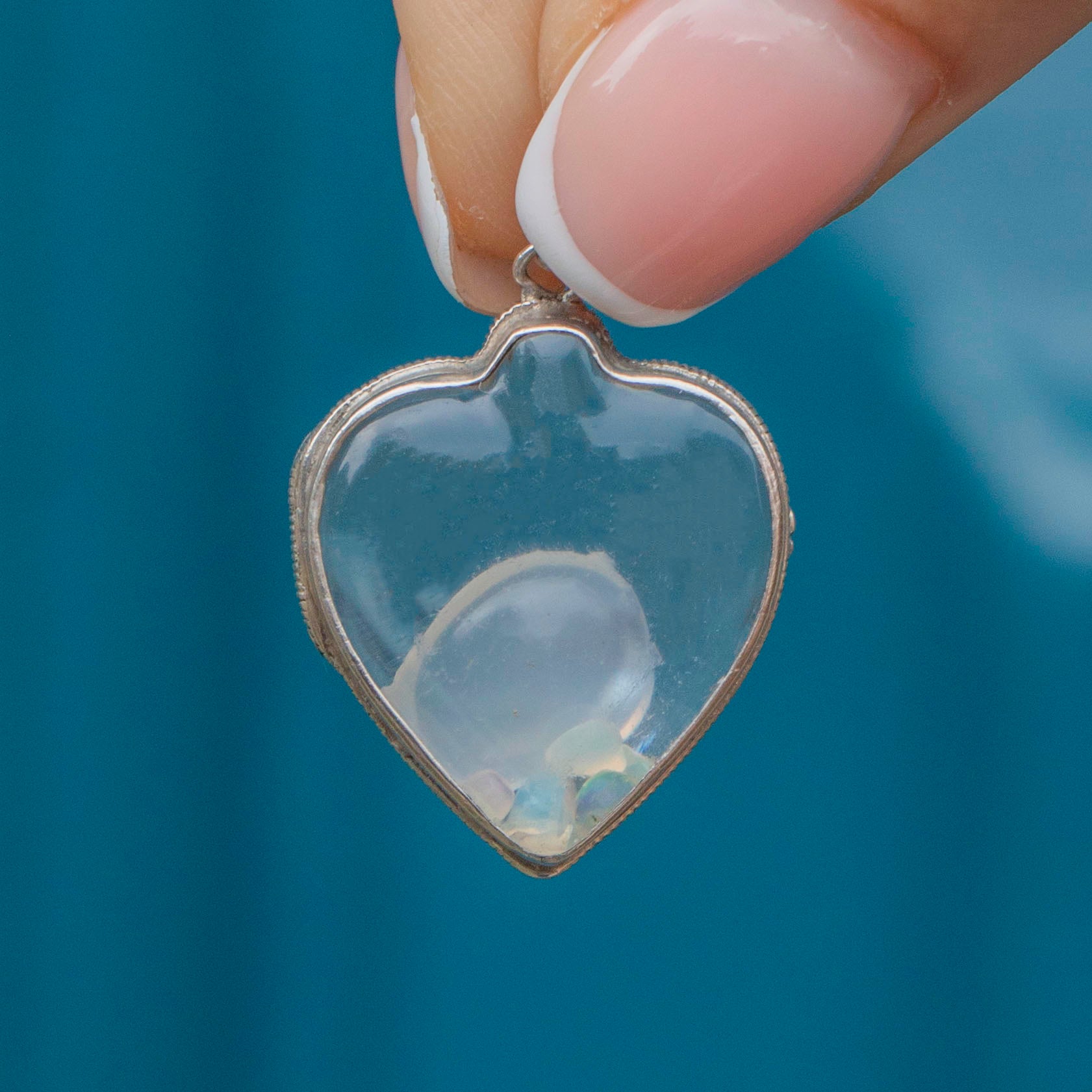 This Victorian Silver heart shaker locket, filled with a loose Moonstone and Opals, would make a playful addition to your jewellery box! Crafted from Sterling Silver, this antique locket has been skillfully formed into a cute heart making it the perfect love token for yourself or a loved one.