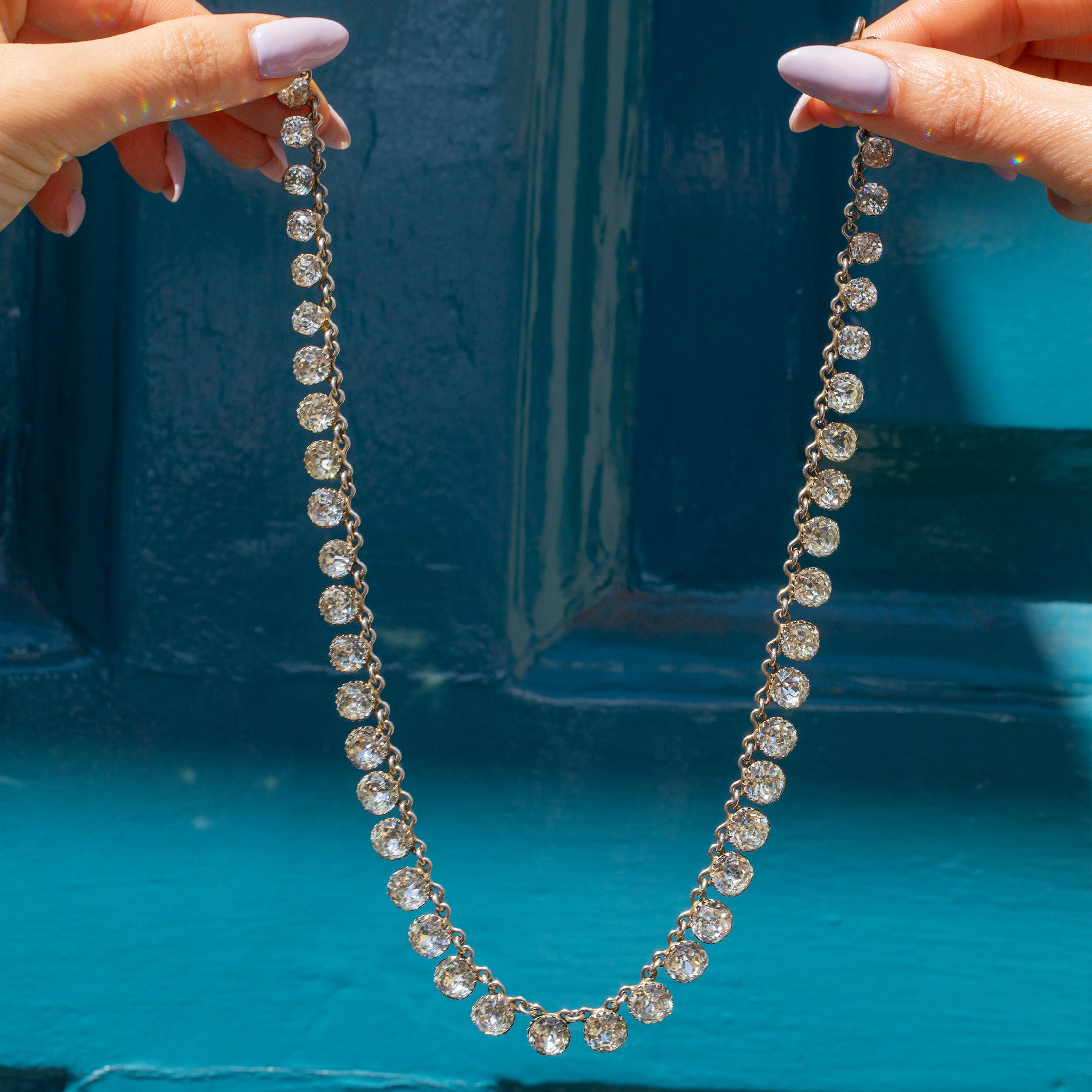 The beauty of this Victorian Paste necklace is that comparatively her Diamond carat weight would be 41.80cts but she is a fraction of the price and still glistens just like the real deal. Bound together by lustrous Sterling Silver their domed backs sit comfortably across your chest just waiting for all the attention!