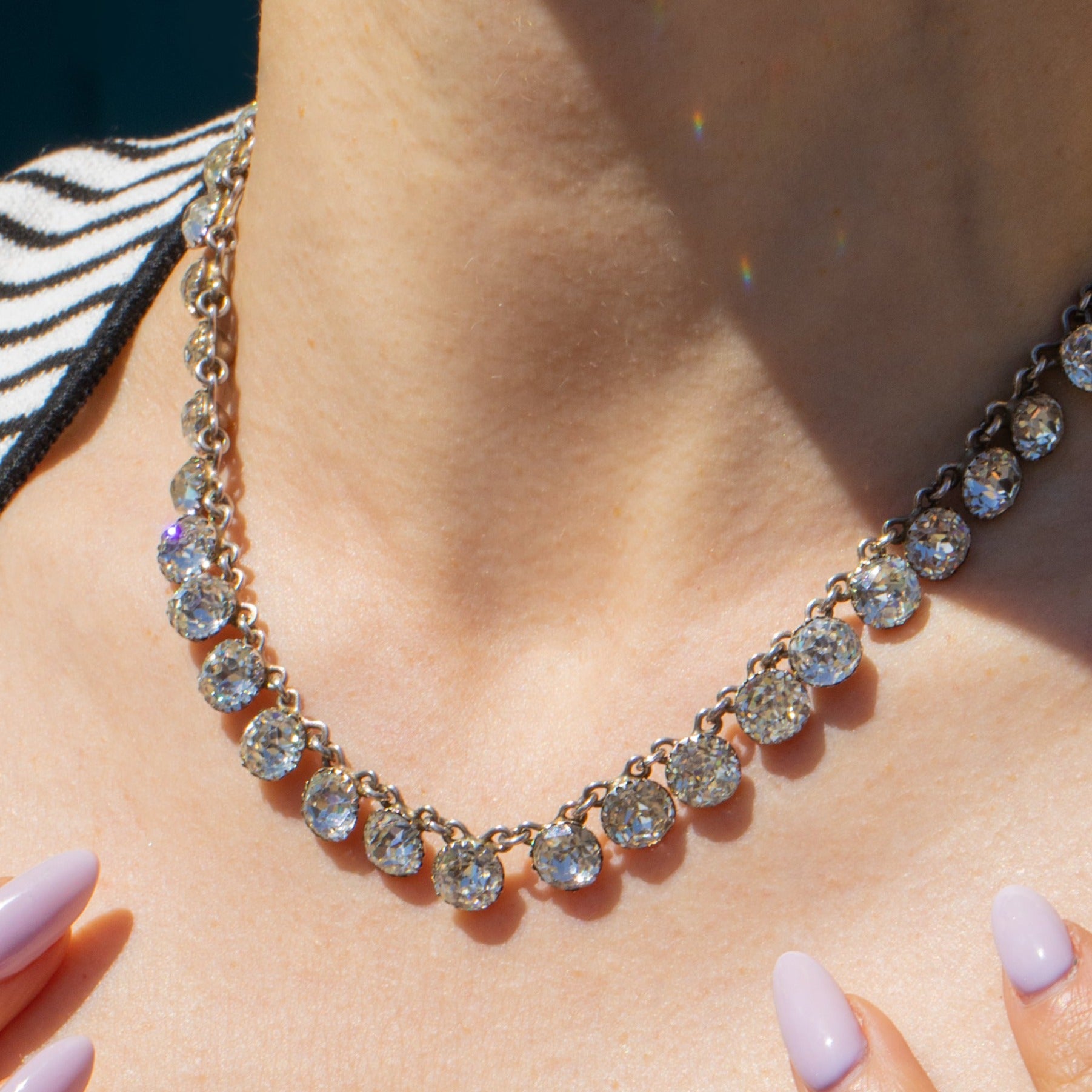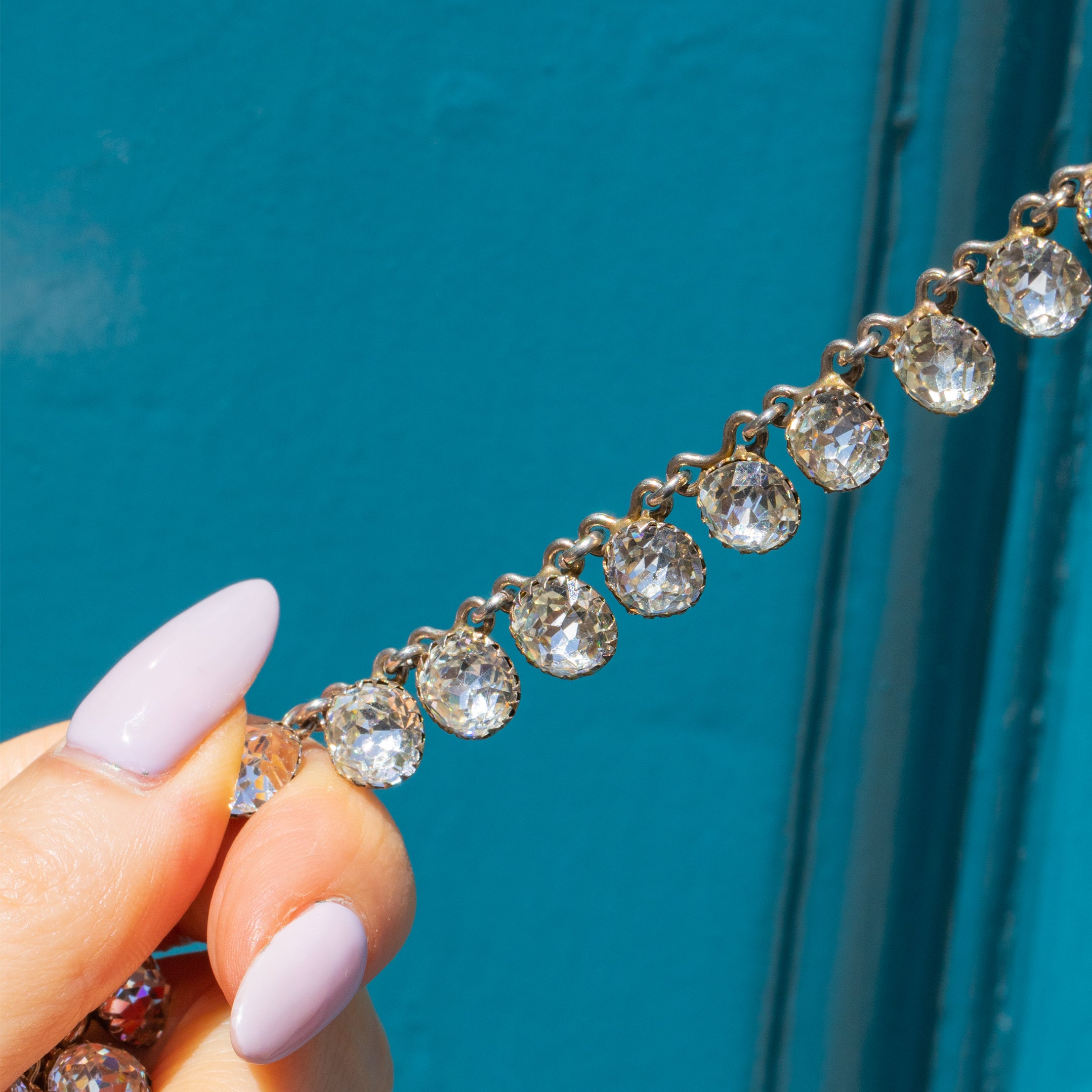 This antique Silver Paste riviere style necklace will bring a sea of sparkle to your collarbones! Fit for a ball, her 44 Paste gemstones dance beneath the light, flaunting crisp white glistens tracing all away around your neck in a classic riviere style.