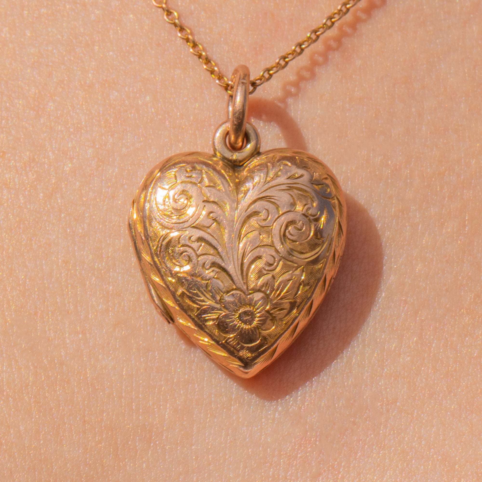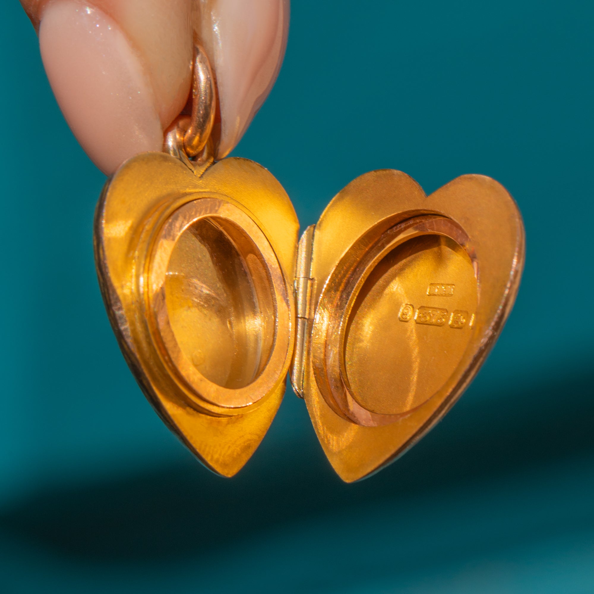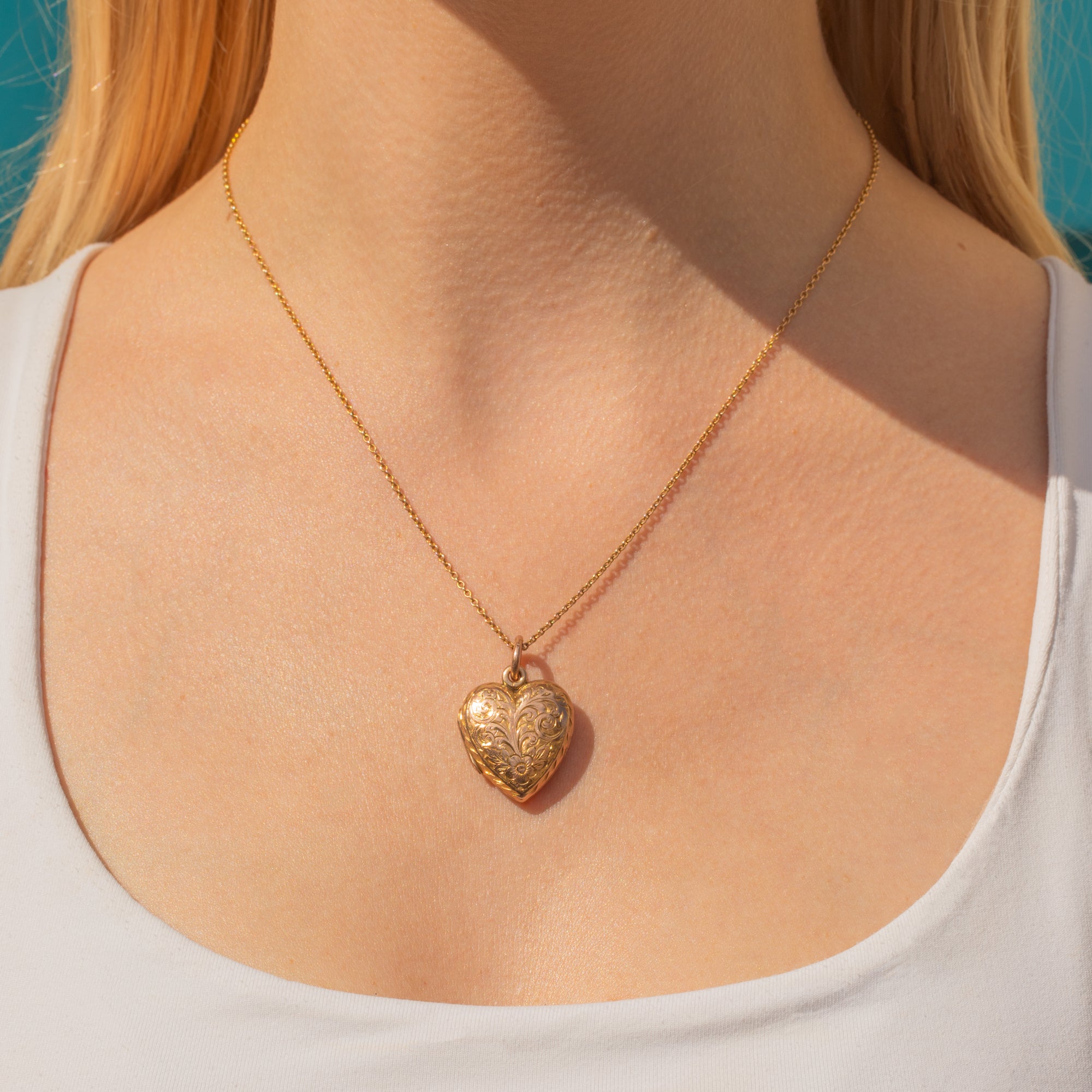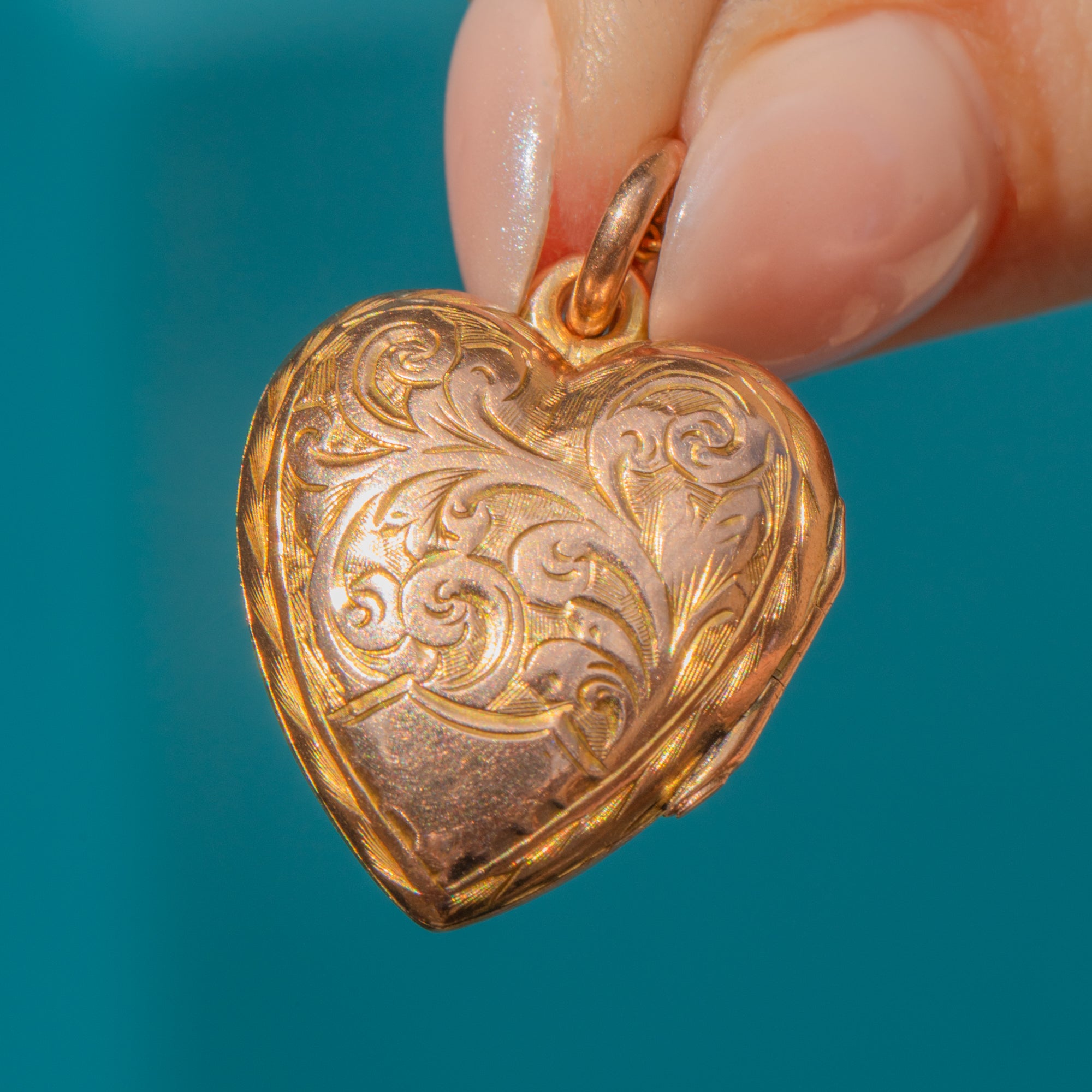 VERY GOOD. This antique solid 9ct Gold engraved heart locket is in superb condition! The 9ct Gold has glorious engravings adorning both sides, making her beautiful from every angle. The locket door closes tightly, and both frames are present inside so you can have complete confidence that this piece will keep your photos safe! While there is a small non-professional engraved mark on the inner side of the locket, this will not be visible once a photo has been placed inside the locket.