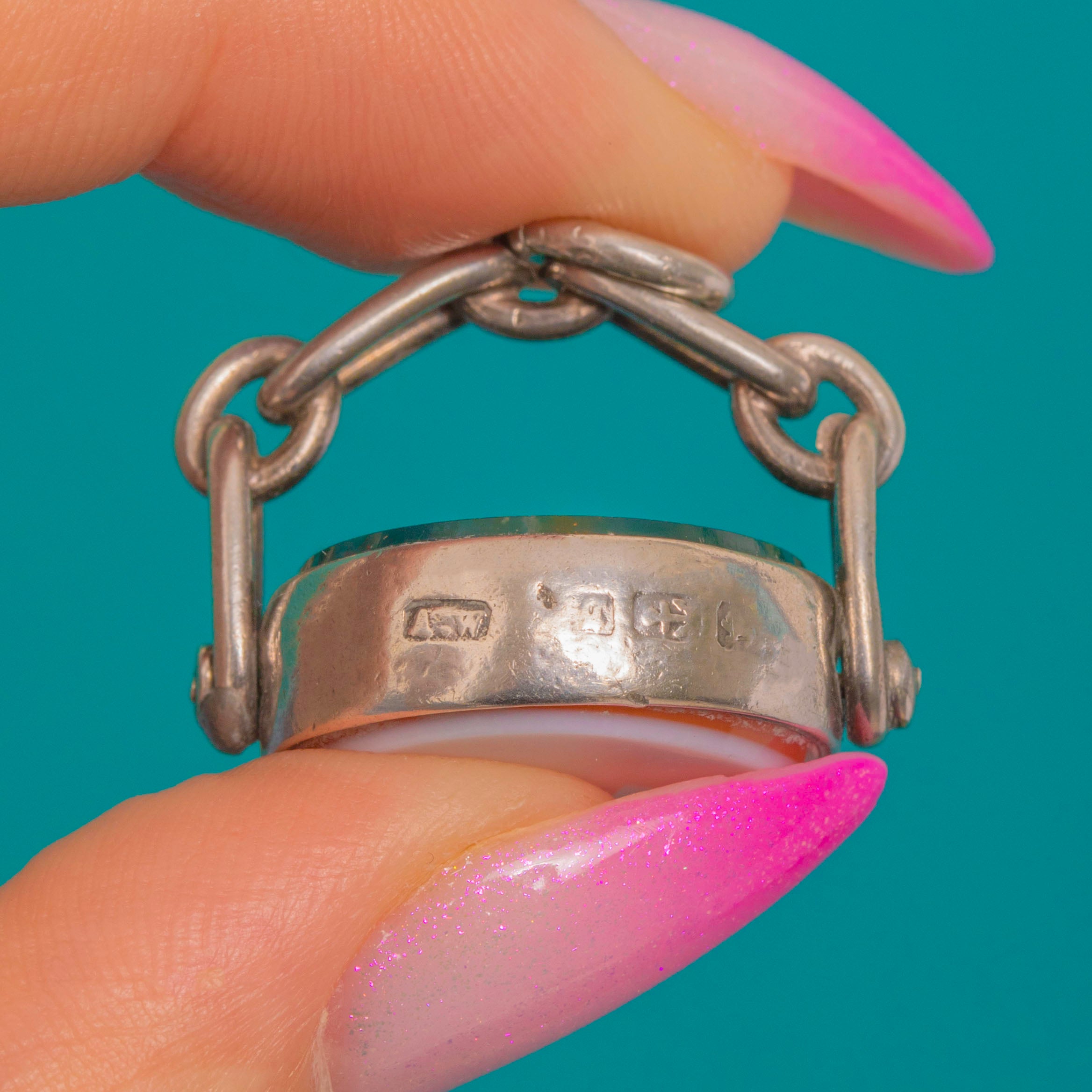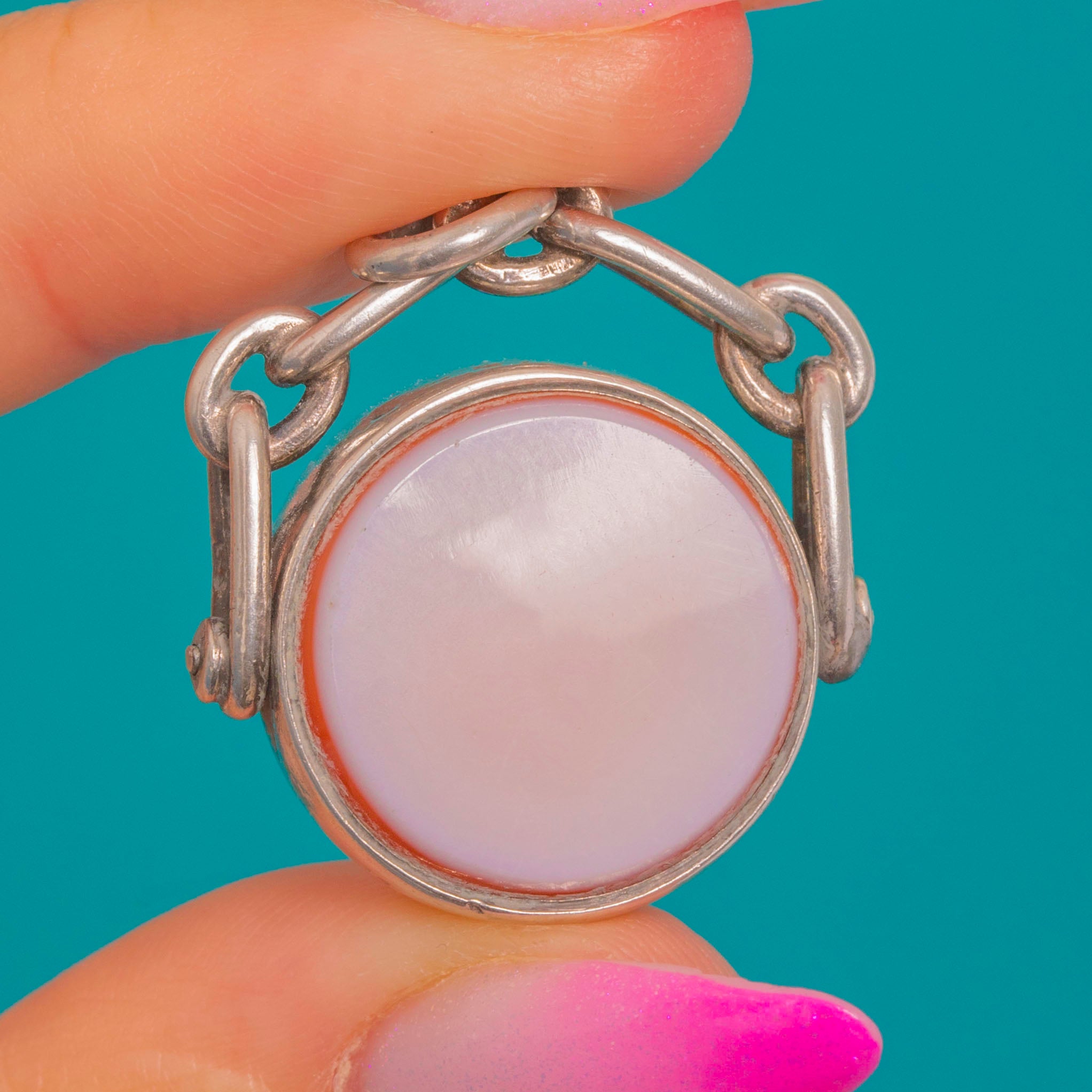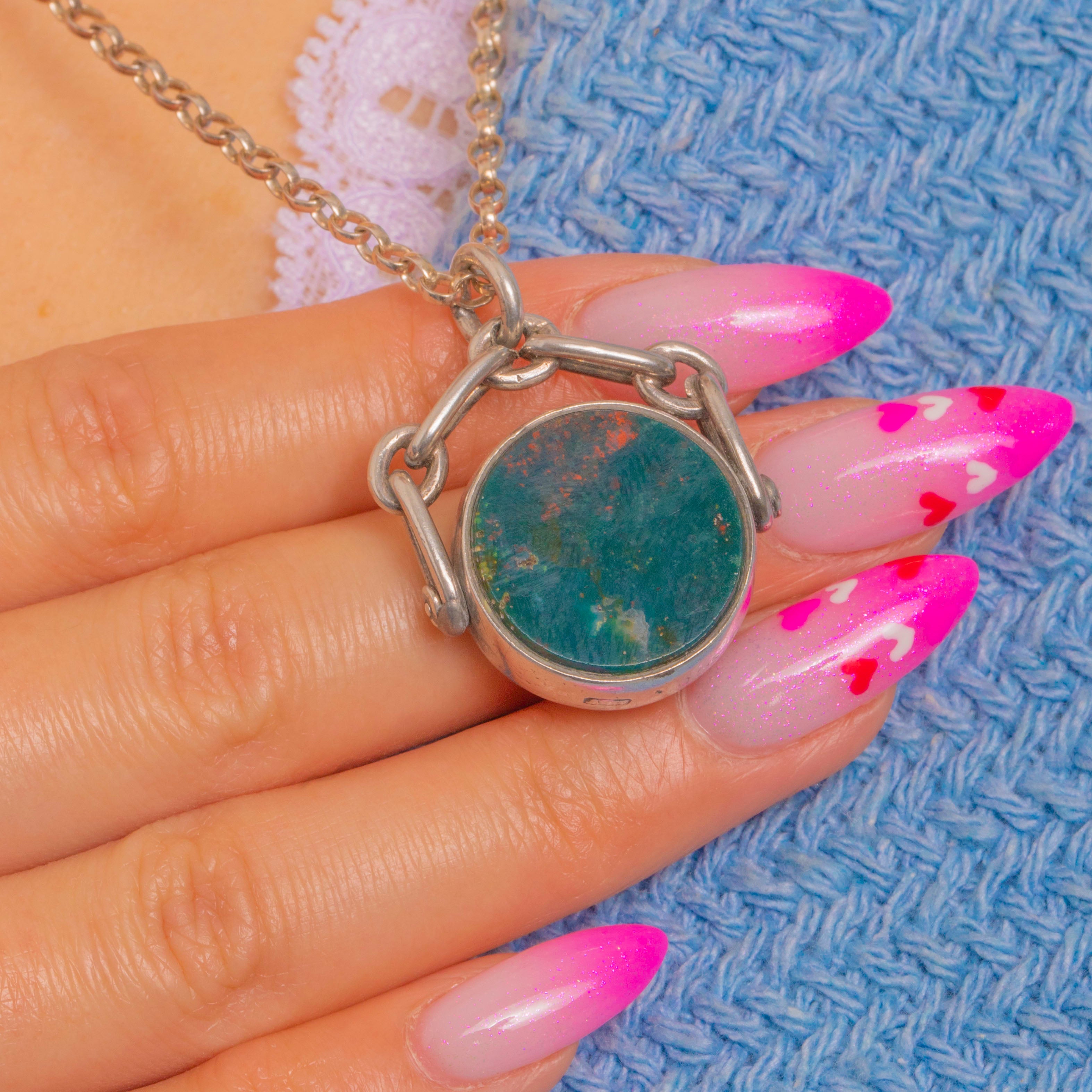 A timeless Victorian swivel fob, crafted in Sterling Silver and set with two beautiful Agates: a deep green Bloodstone peppered with lively red flecks, and a warm, banded Sardonyx in creamy white and caramel tones. Each domed cabochon is smoothly bezel-set within a closed-back frame, creating a refined, tactile presence.