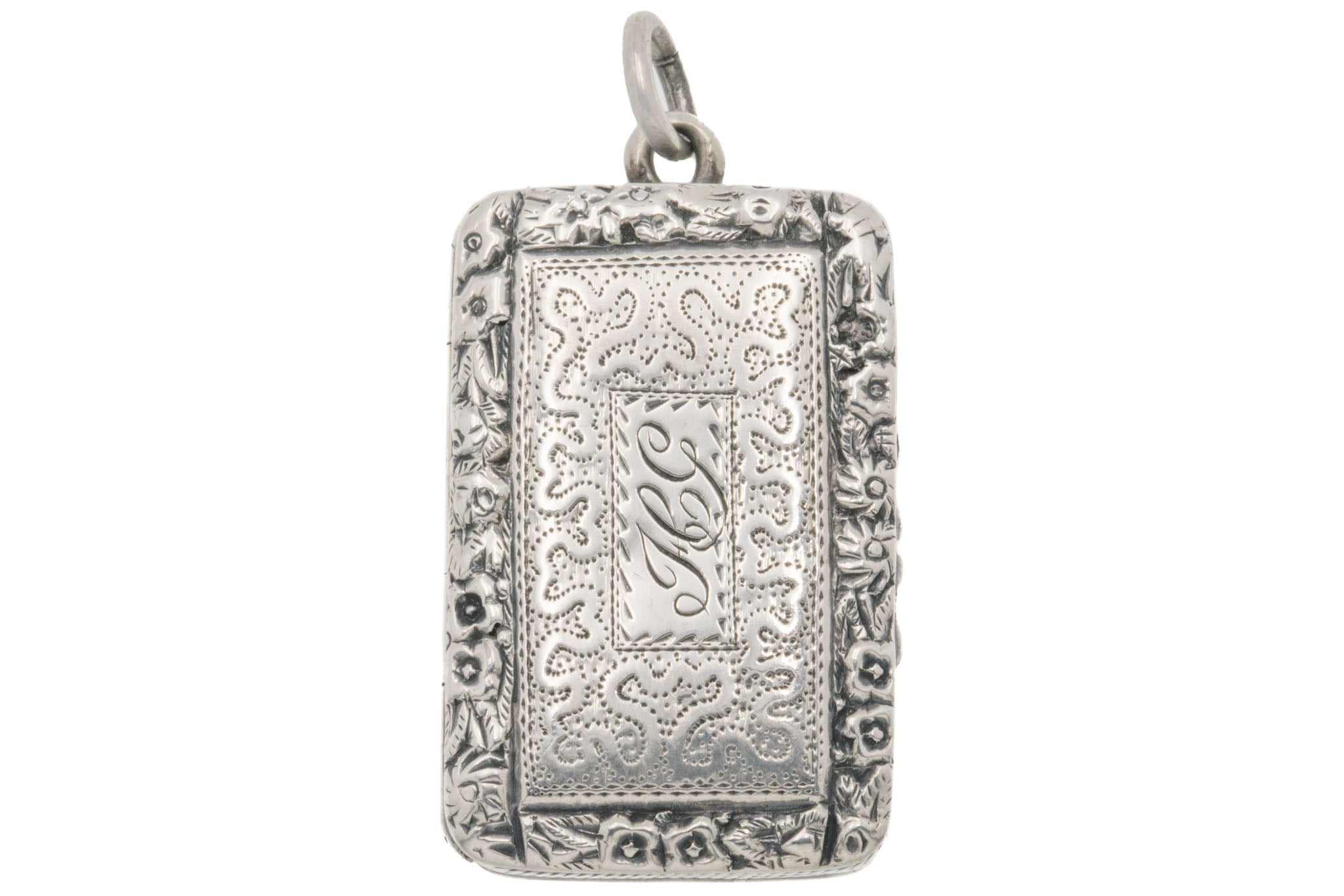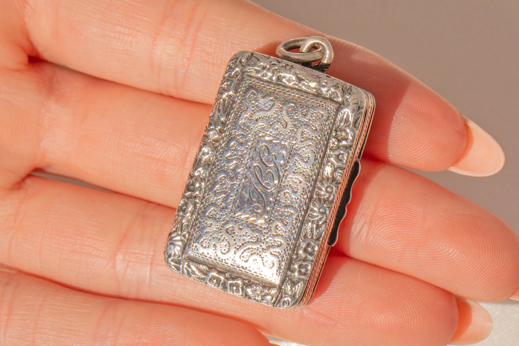 VERY GOOD. This antique Silver engraved vinaigrette pendant is in very good condition. Externally, she is in lovely condition, with both her repoussé details and engravings crisp. The Silver has a gorgeous lustre with an admirable patina to compliment. There is one small dent on the top left corner at the back, but you can't see this when she is suspended around your neck. Inside, there are a few scratches and wear, commensurate with age, to the Gold. Her English hallmarks have remained crisp allowing us to accurately date her to 1822. She's definitely a good pick to add a touch of intrigue to your repertoire!