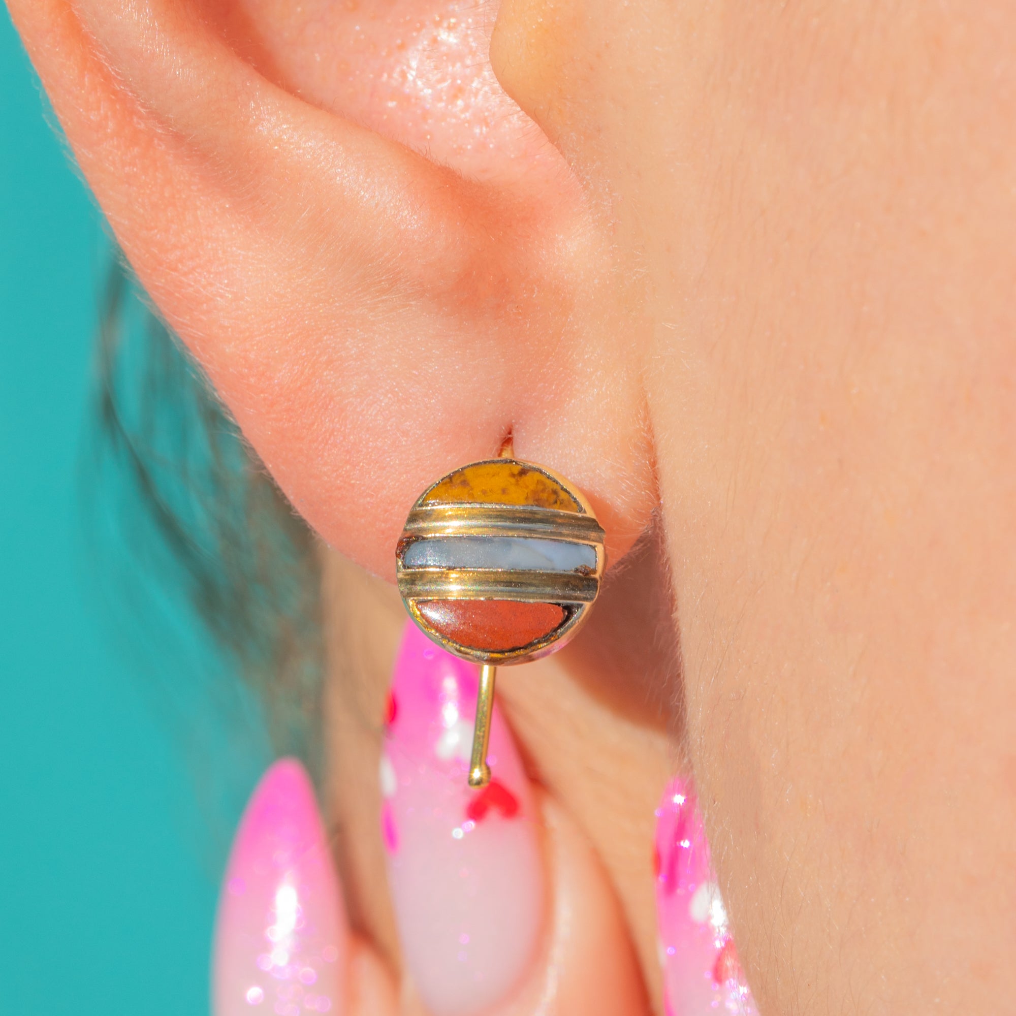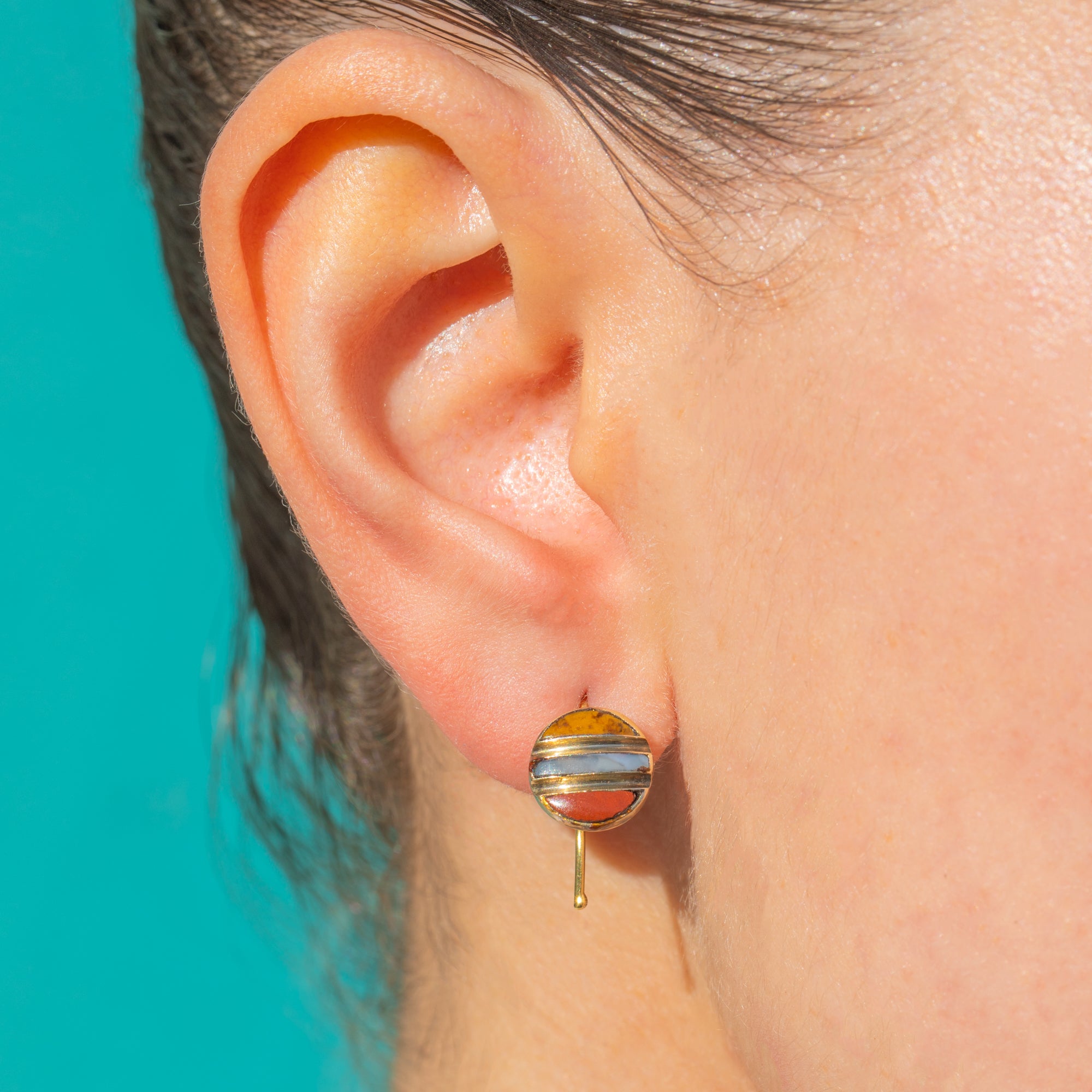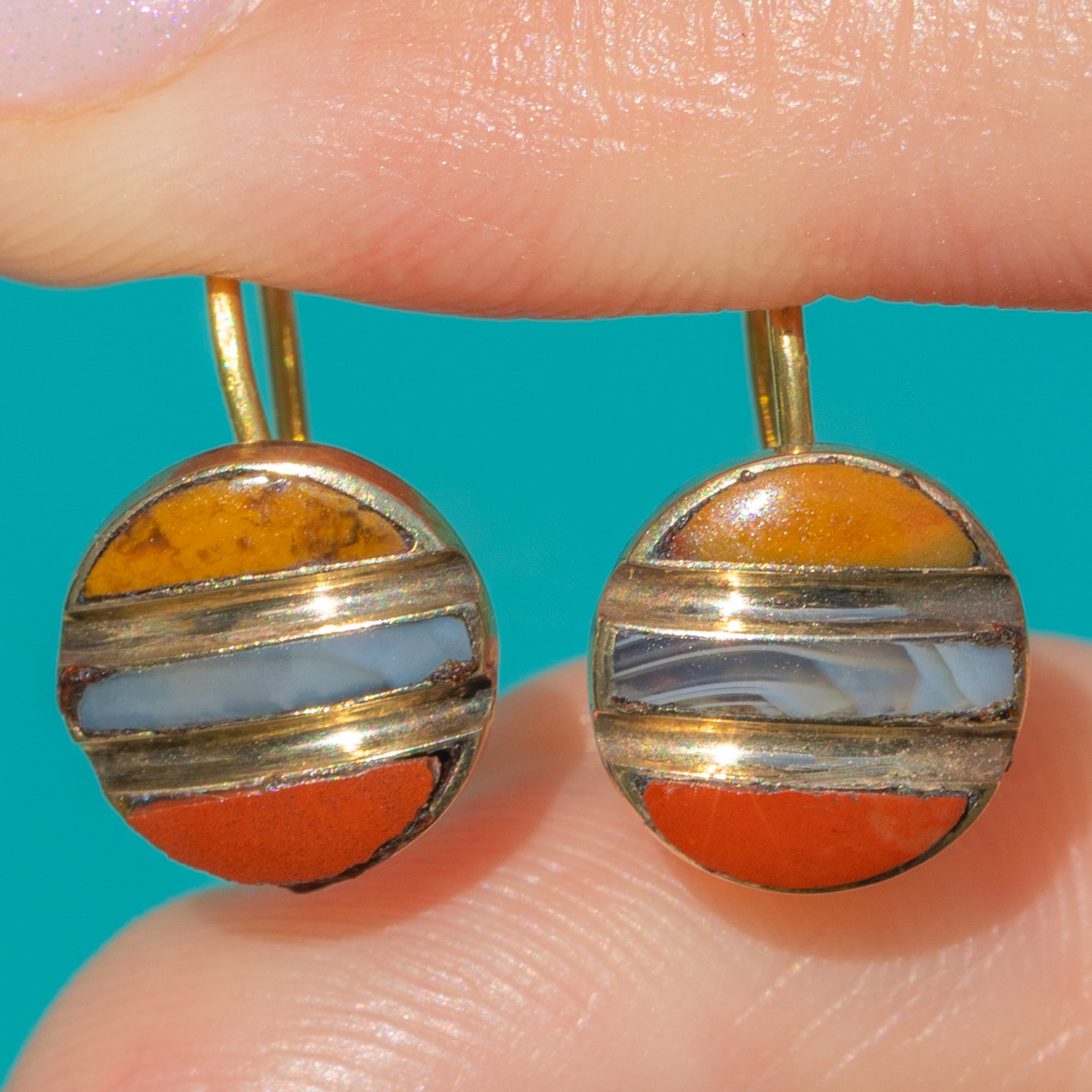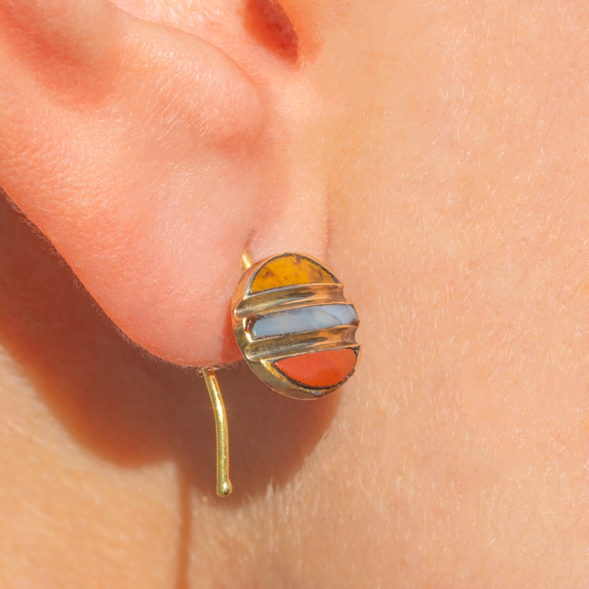 Diese antiken Victorian Ohrringe sind ein reizvolles Spiel aus Farbe und Harmonie. Gefertigt aus edlem 18-karätigem Gold, präsentieren sie dreifarbigen Achat, der in klaren, waagerechten Bändern innerhalb kompakter, runder Anhänger angeordnet ist. Jedes Element – zwei schmale Mondsicheln, die ein zentrales Rechteck flankieren – liegt passgenau in feinen Goldkanälen und bildet einen eleganten Streifen, der in warmen Honig-, zarten Creme-Blau- und Rosttönen leuchtet.