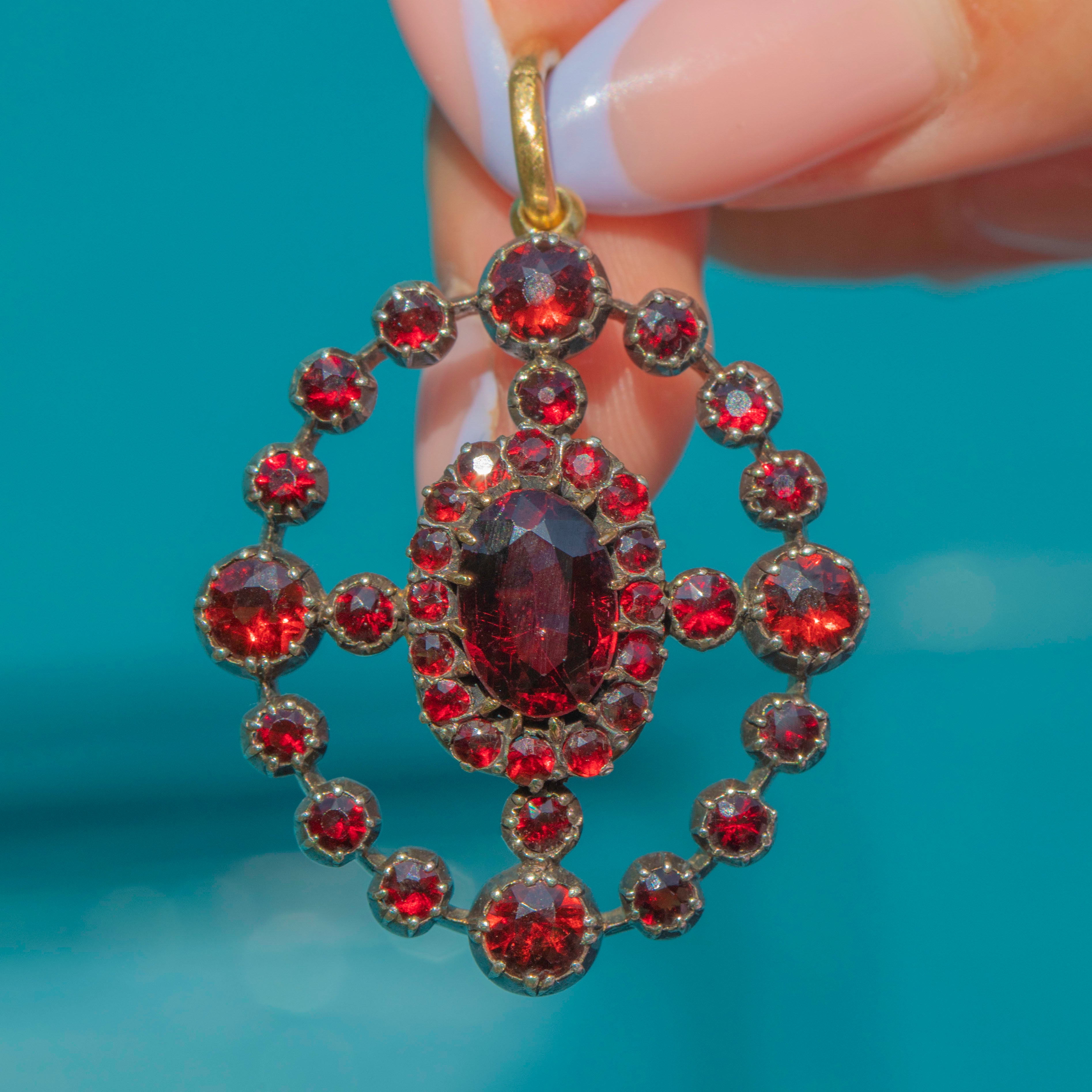 The pendant has been crafted from Sterling Silver and backed with 18ct Gold, as was common during the 19th century. Garnets were a favoured stone during the Victorian era, desired for their delectable berry red hue!