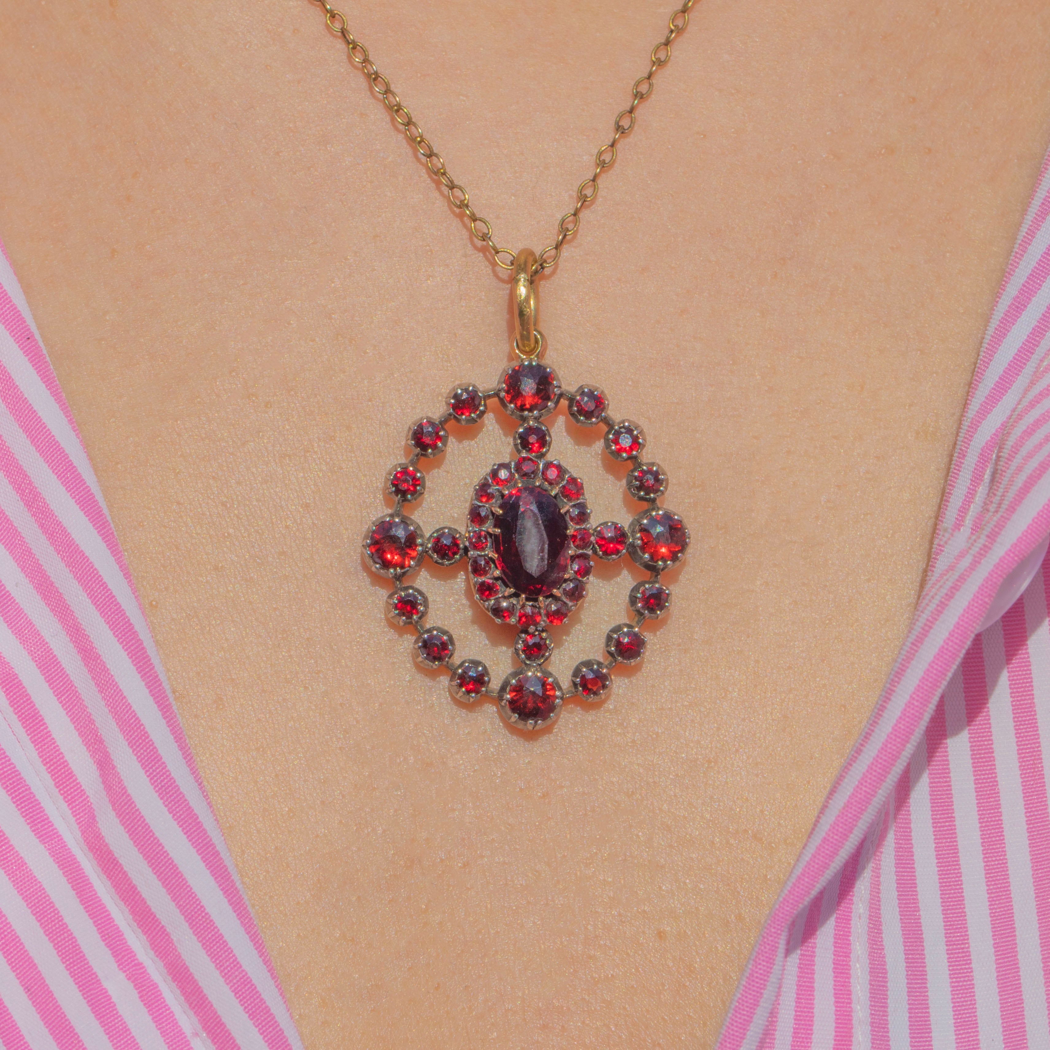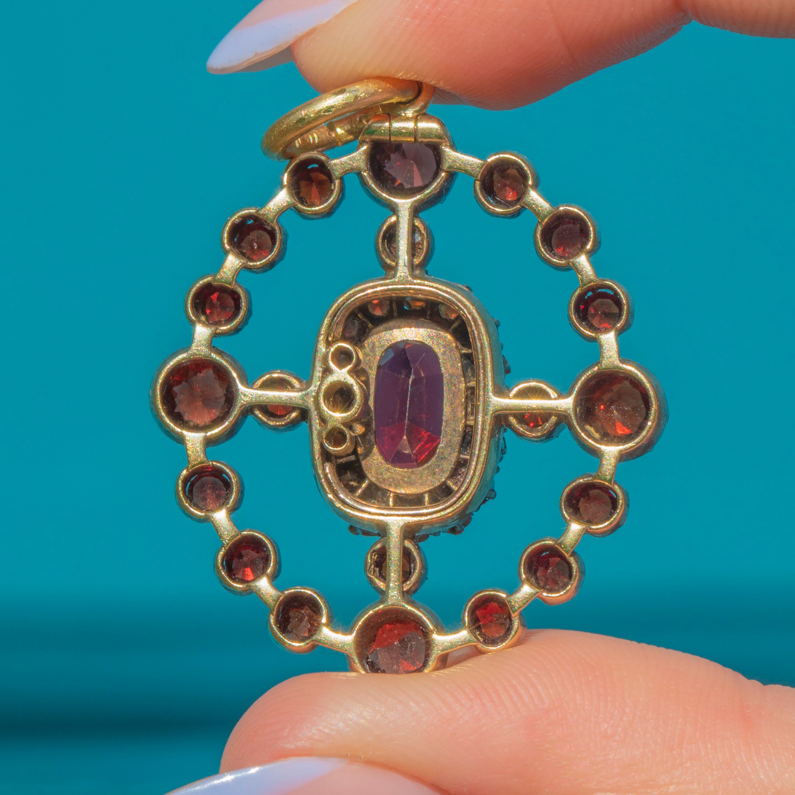 VERY GOOD: This antique Victorian Garnet cluster pendant is in very good condition! Starting life as a brooch, this piece has been converted into this highly wearable pendant. The work has been carried out very well, with only mild evidence of this on the back. The Garnets are crisply faceted, deeply saturated, and securely set! The Silver settings have accrued gorgeous patina and the 18ct Gold is buttery and smooth. The chunky jump ring is securely soldered allowing you to suspend this outstanding Victorian pendant from a chain of your choice with absolute confidence!
