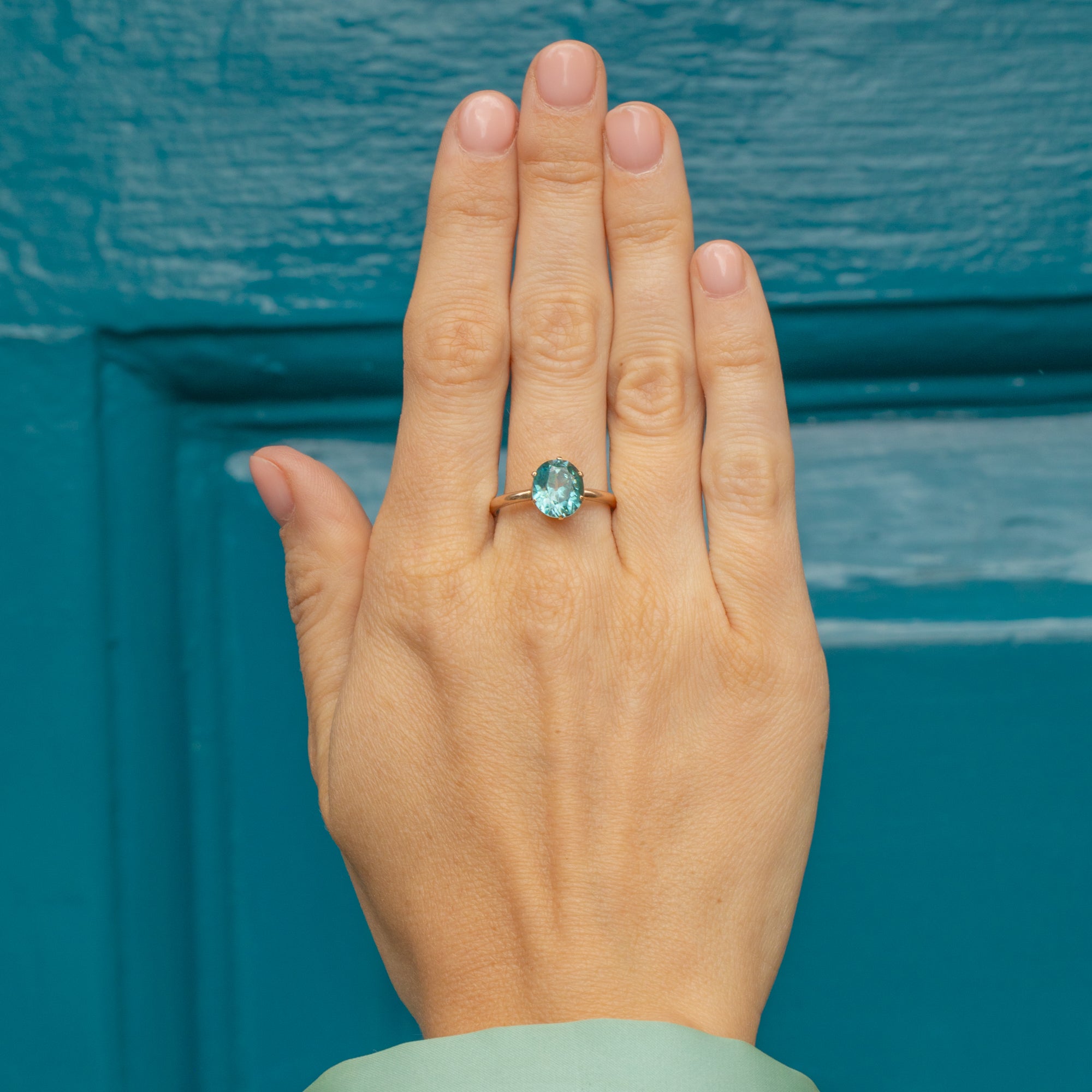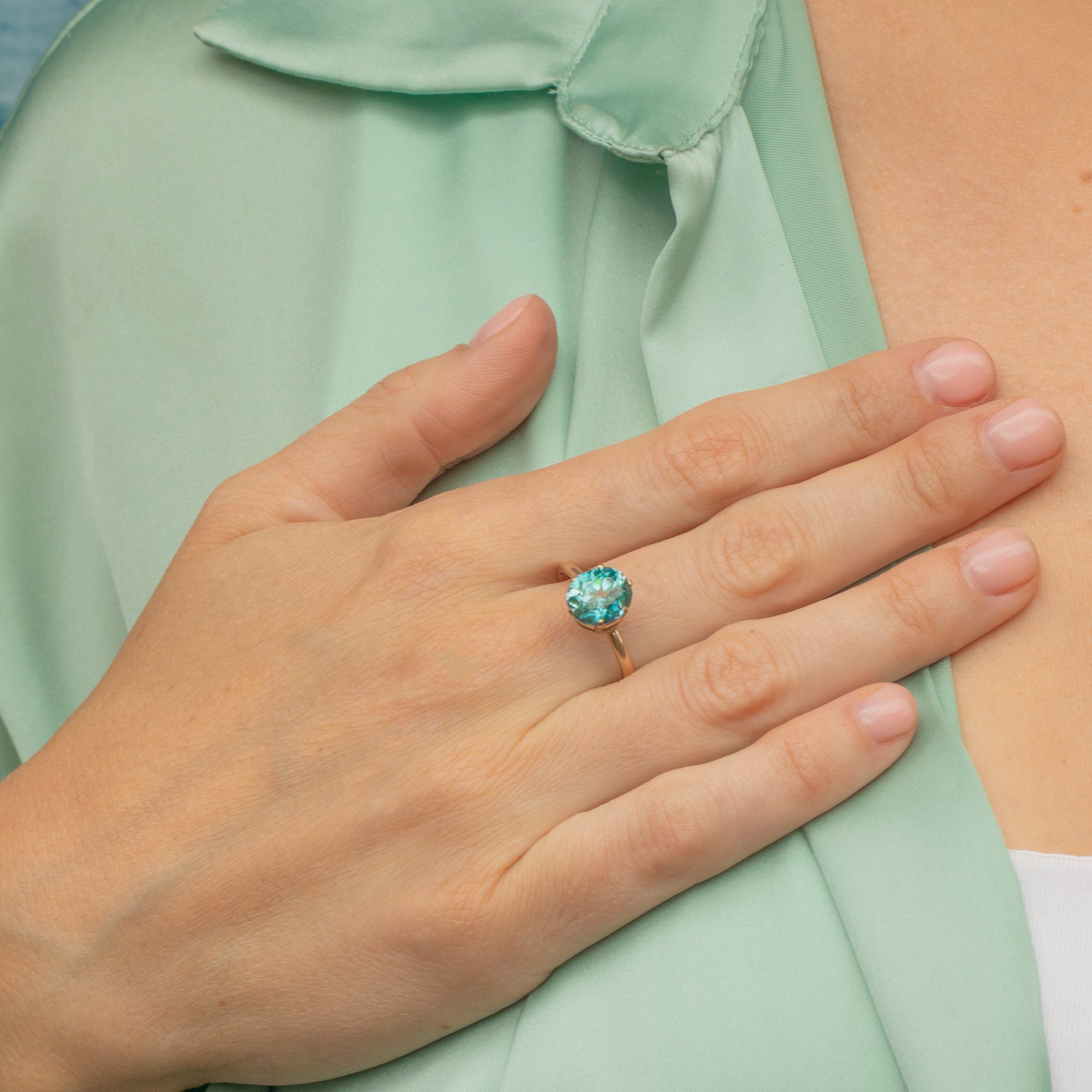 Taking centre stage is a breathtaking sky blue Zircon that will add a joyful pop of colour to any attire. An impressive 2.25ct Blue Zircon, her facets glistens in the light resulting in the perfect piece to transition piece from day to night.