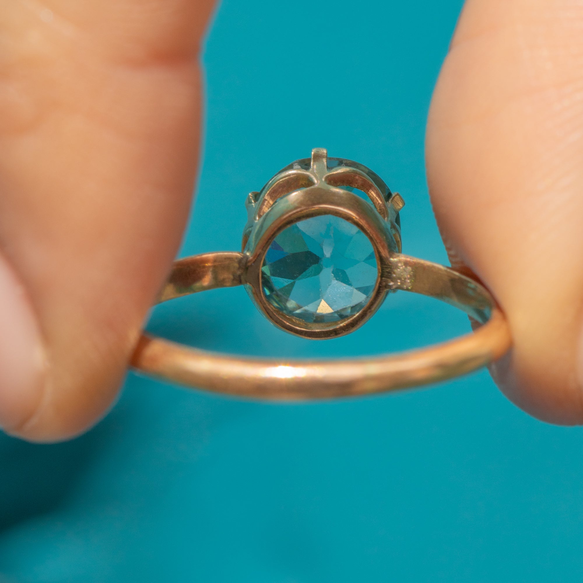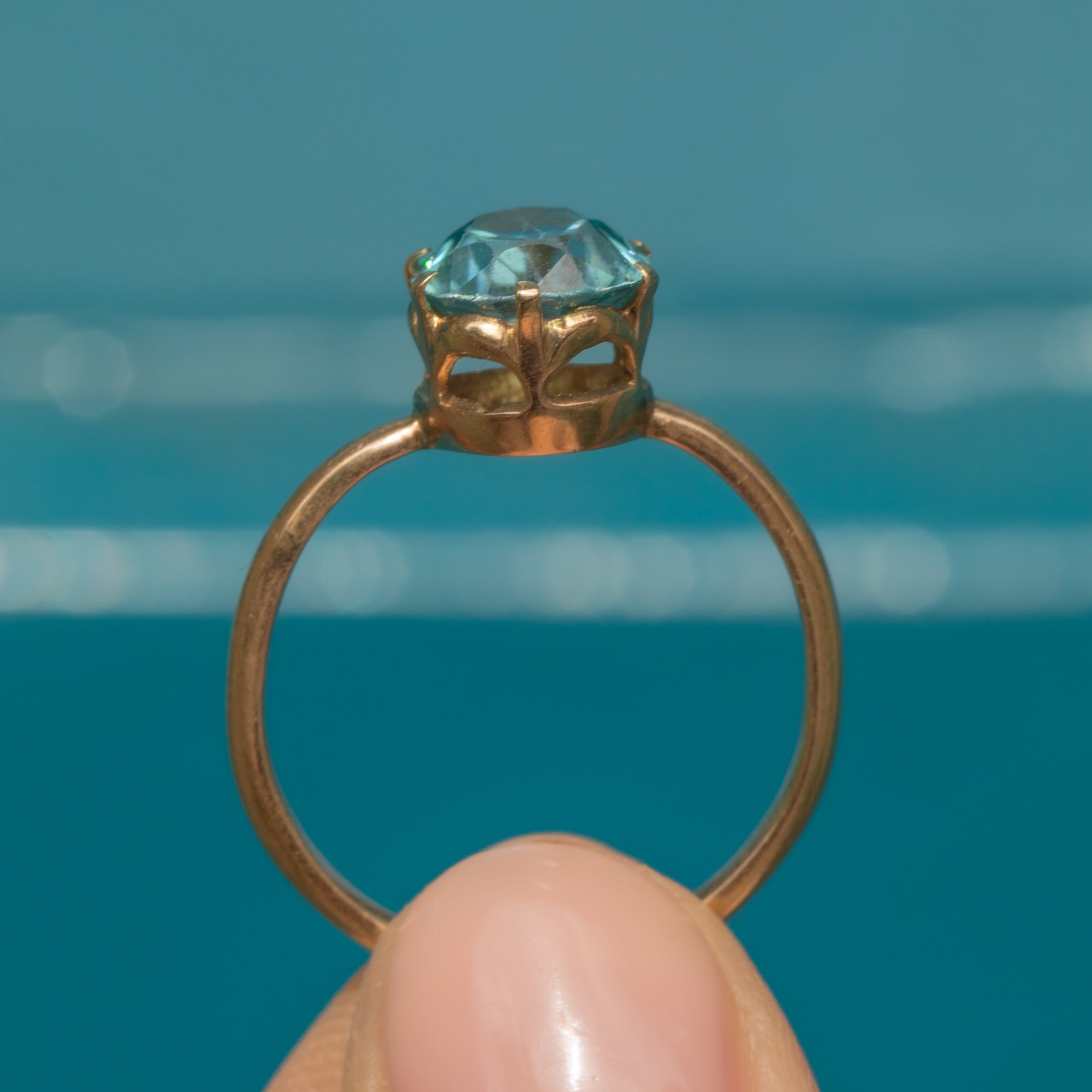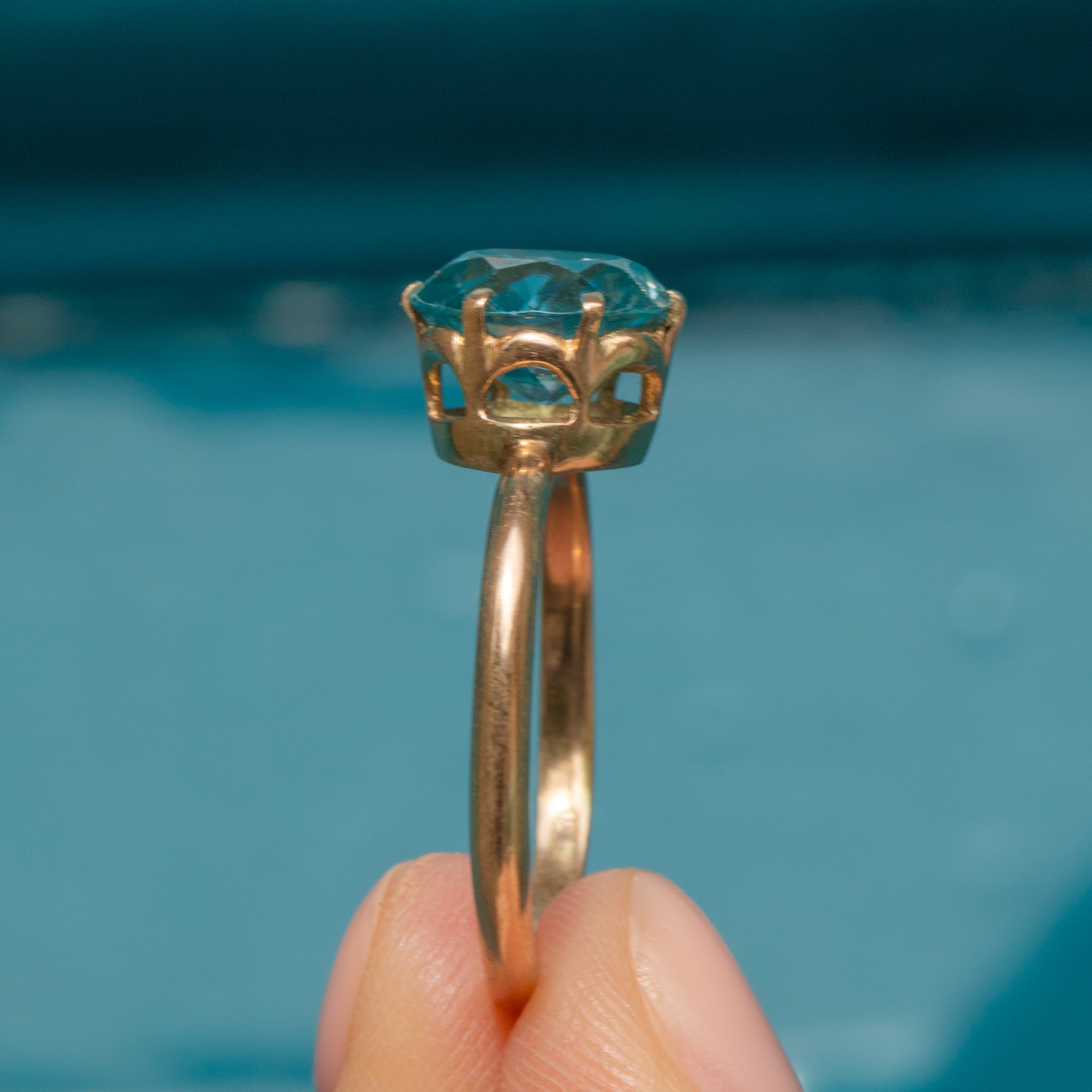 This Art Deco 14ct Blue Zircon ring is a sight to behild, with her glossy golden glow and intricate settings!