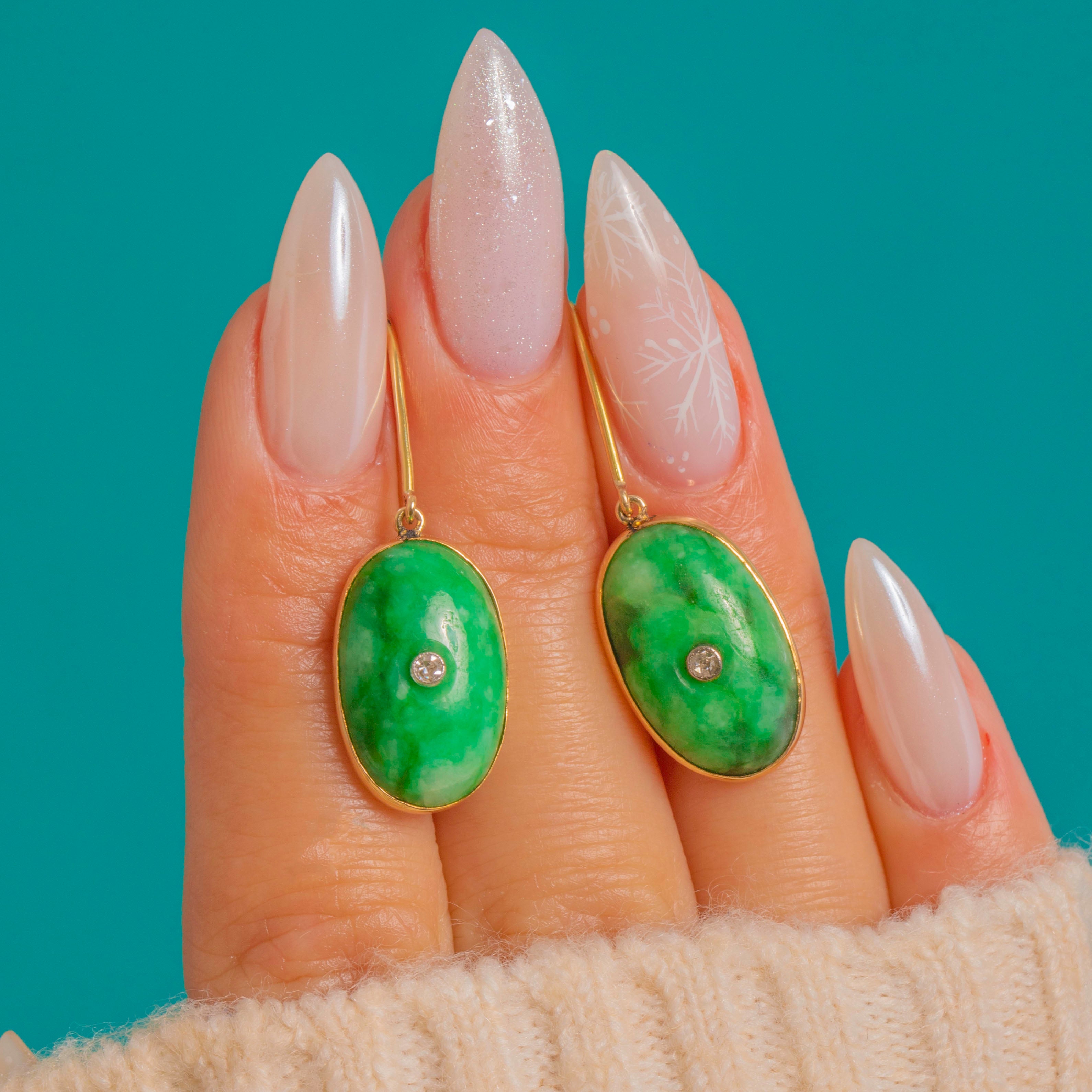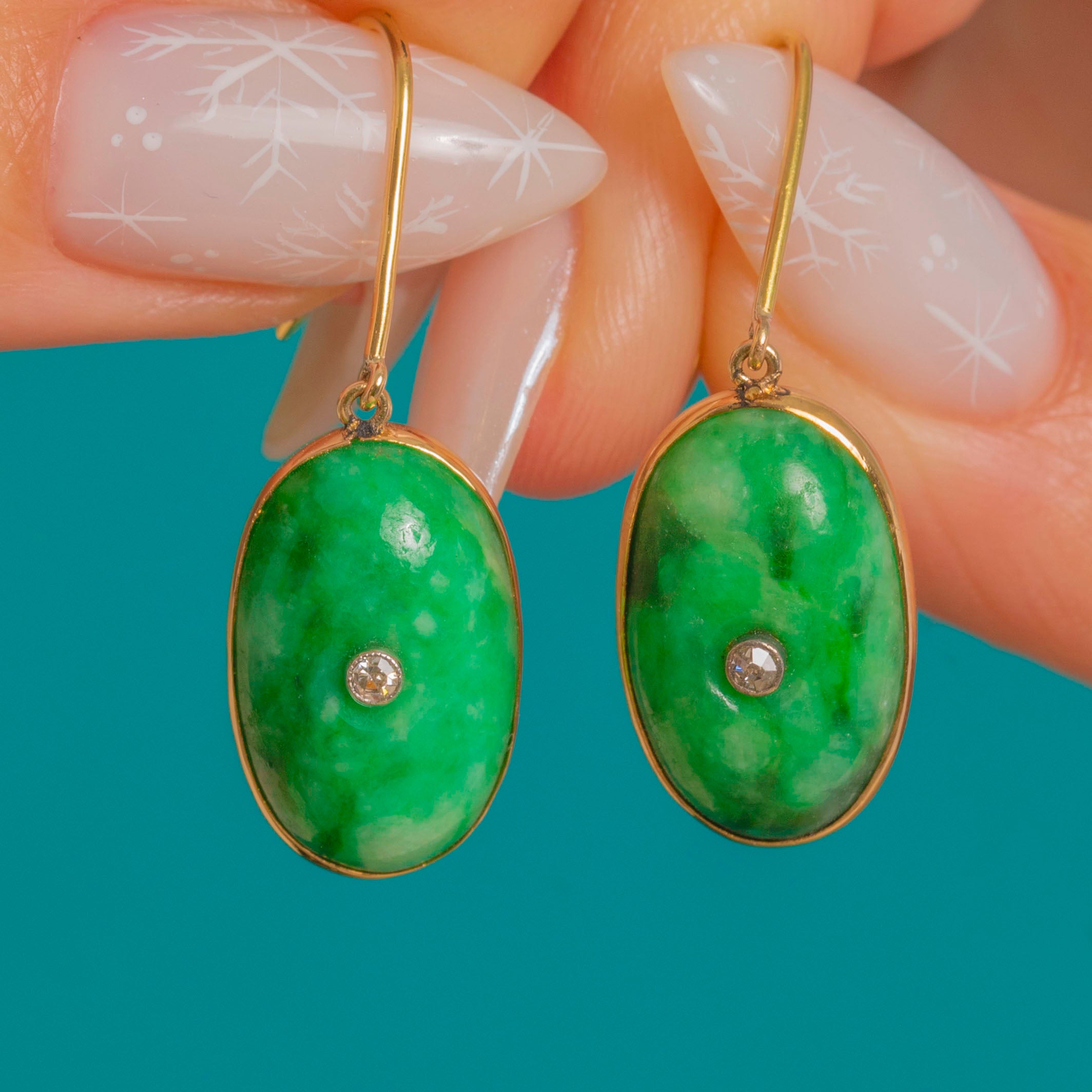 A striking Art Deco pair, these earrings marry vivid apple-green natural Jade cabochons with the warm glow of 15ct Gold. Each oval is punctuated at the centre by a single old mine cut Diamond, a precise spark of light that draws the eye to the heart of the stone.