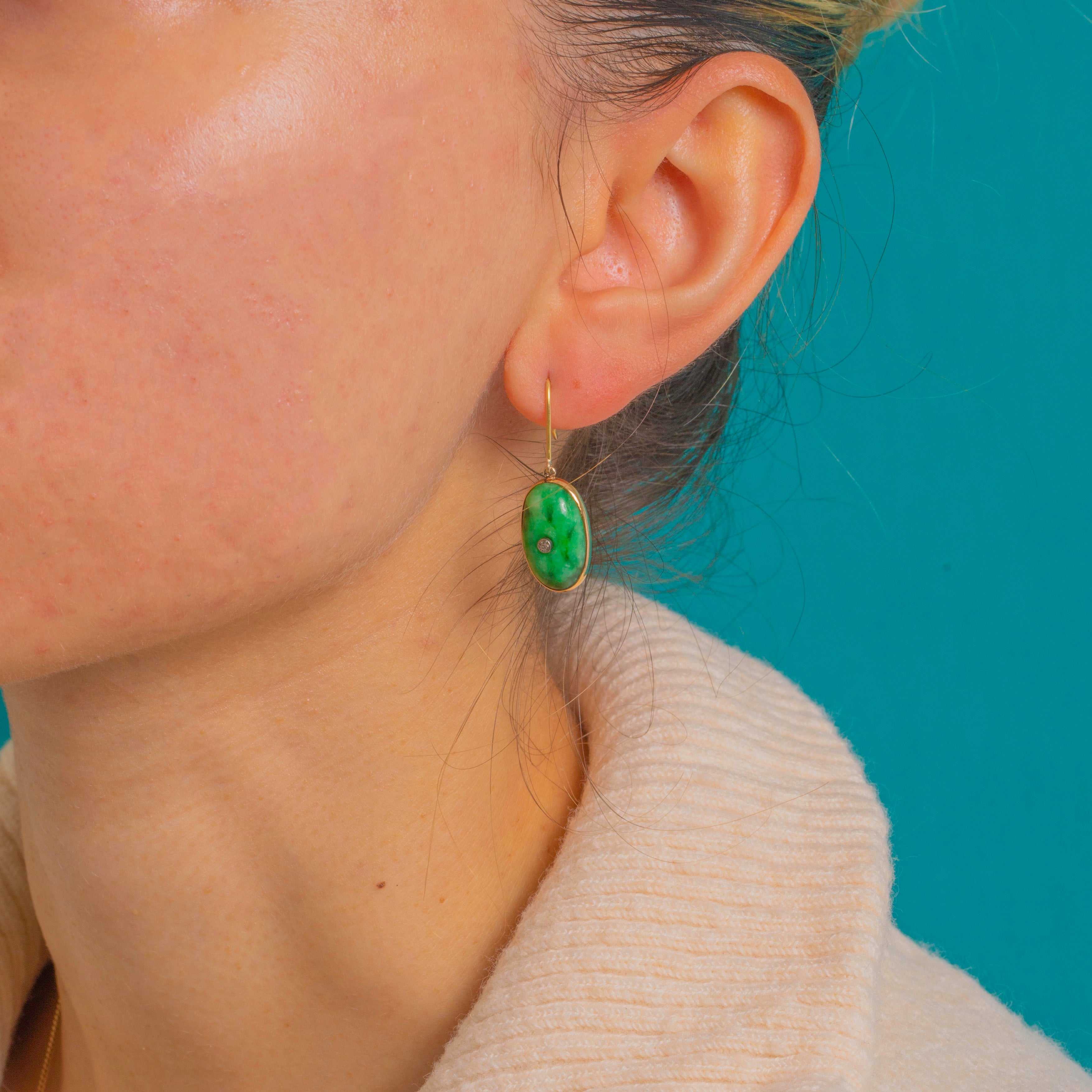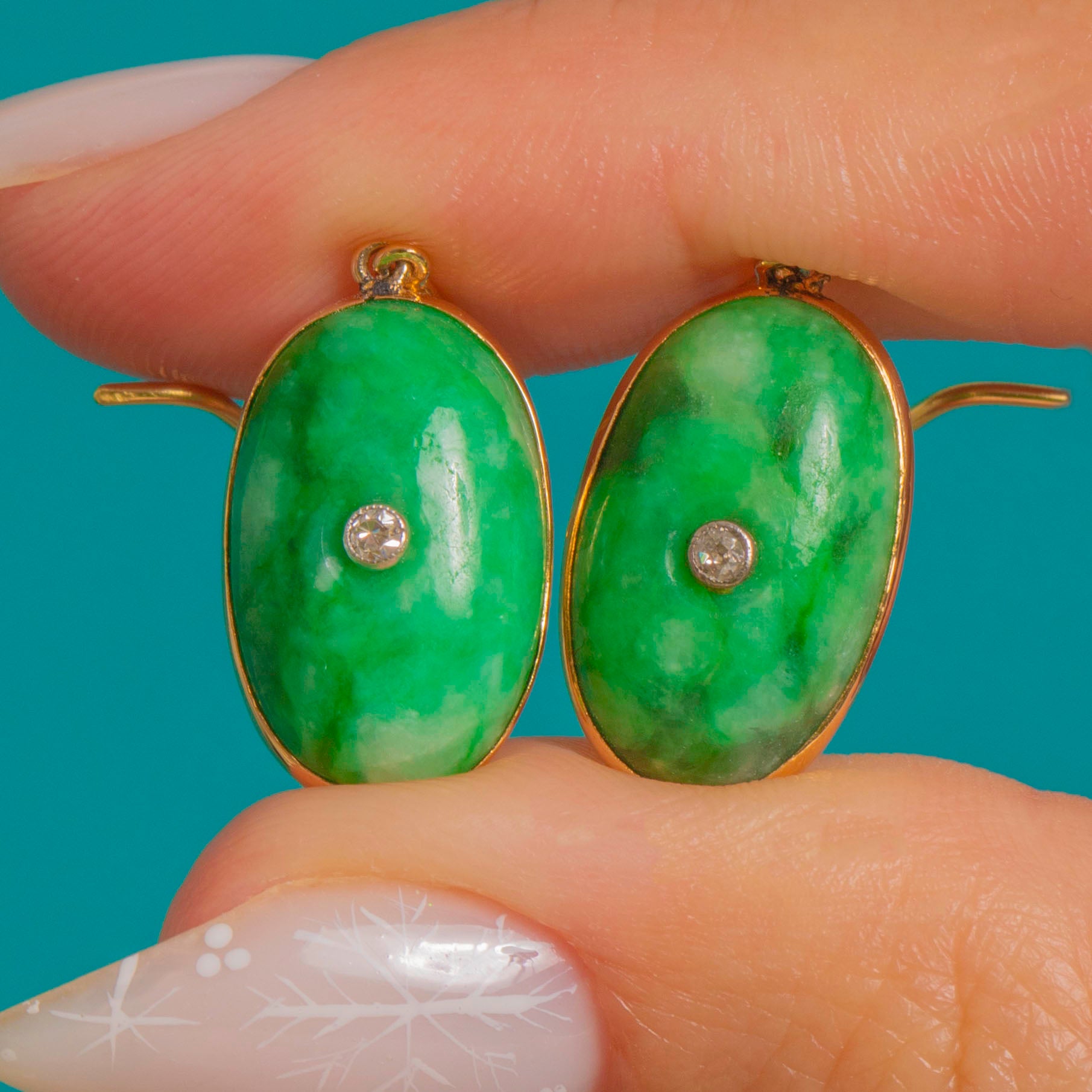 EXCELLENT: The Jade cabochons are crisp and glossy with only minimal surface wear visible under close inspection; the Diamonds are bright and well-set. The 15ct Gold bezels and hooks are clean with light, age-appropriate wear, and the settings are secure.