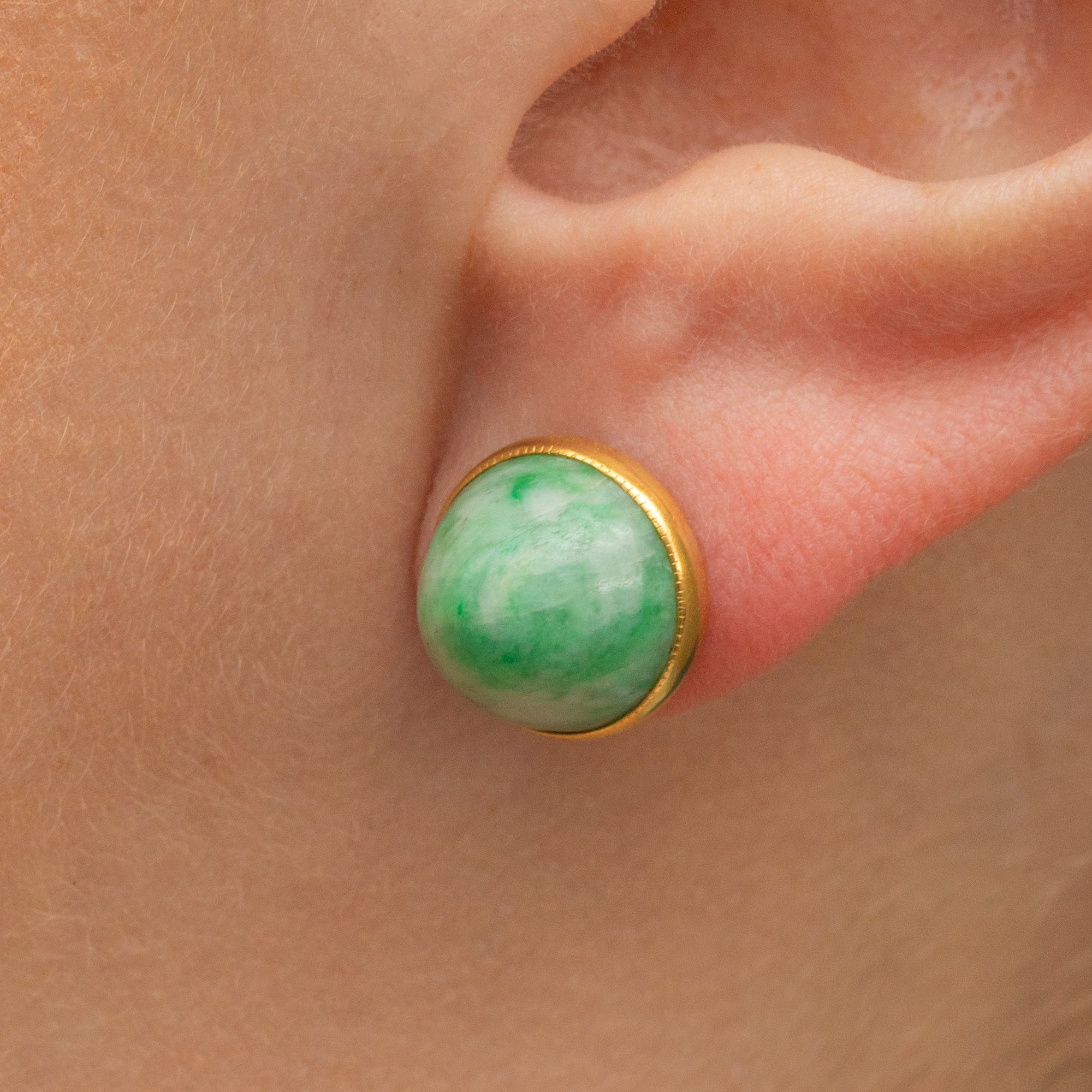 Marbling mint green and cream hues swirl across their plump cabochon form, creating a striking contrast against their buttery 18ct Gold bezel settings. We adore the high sugarloaf style domes on the cabochons that are synonymous with Art Deco 1920's era jewellery!
