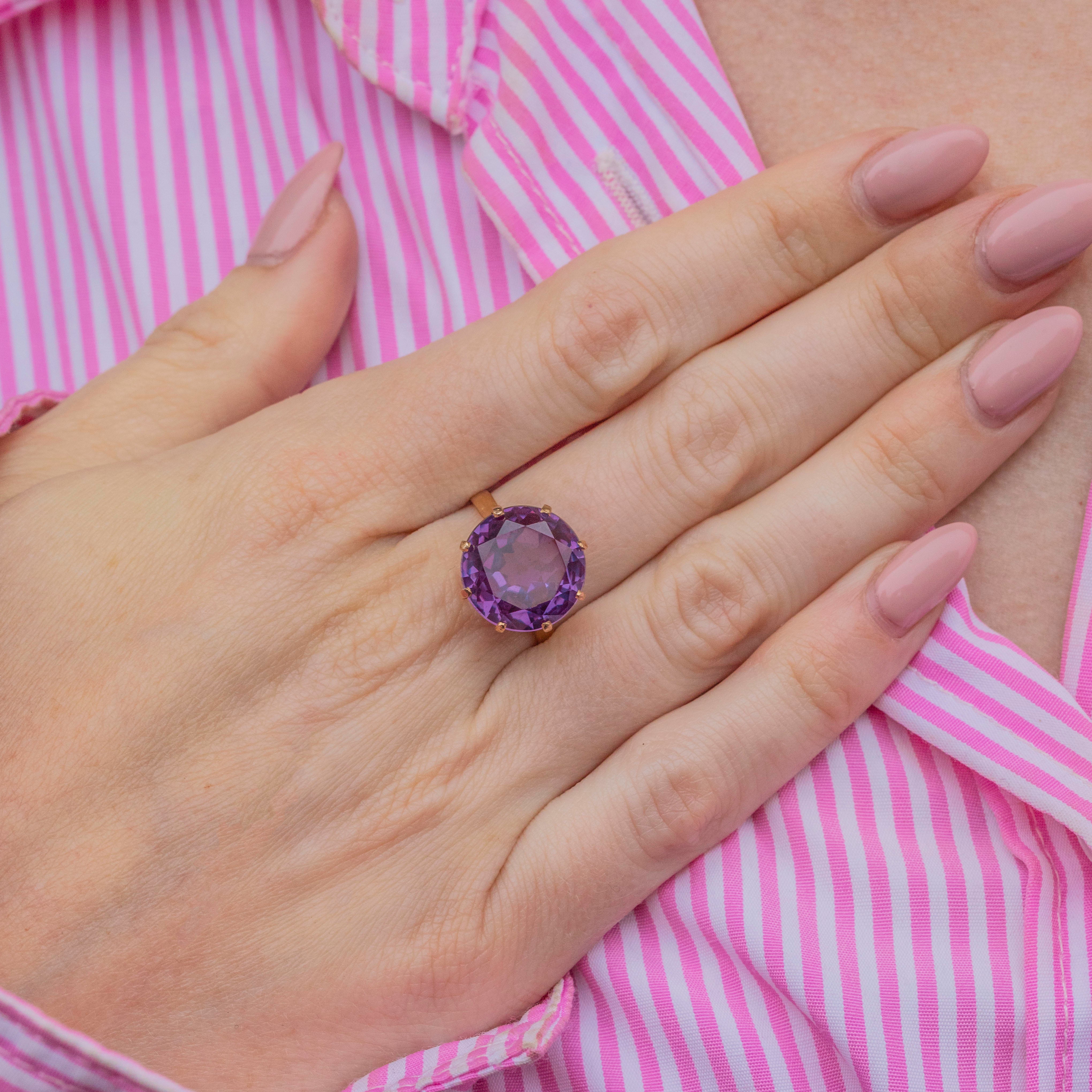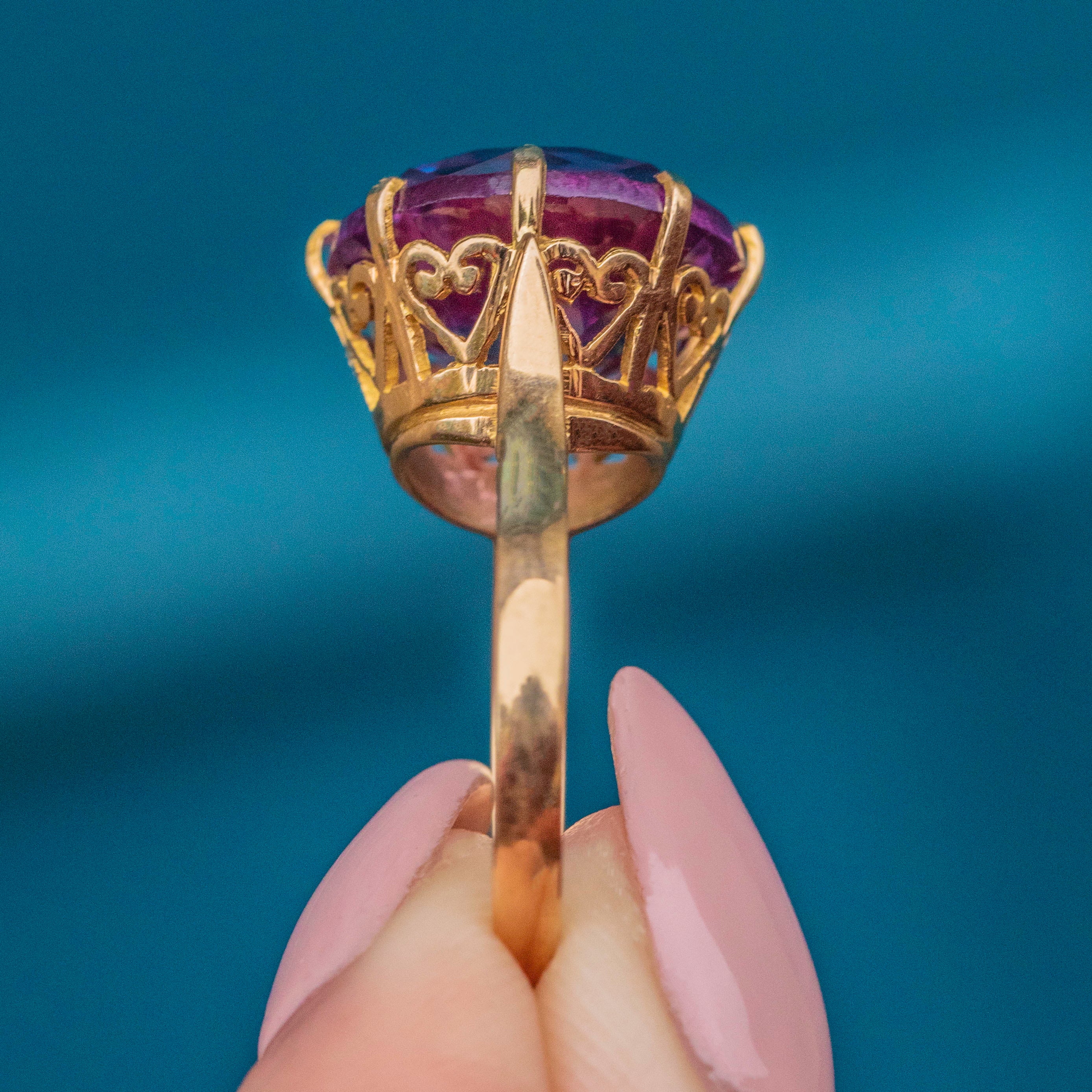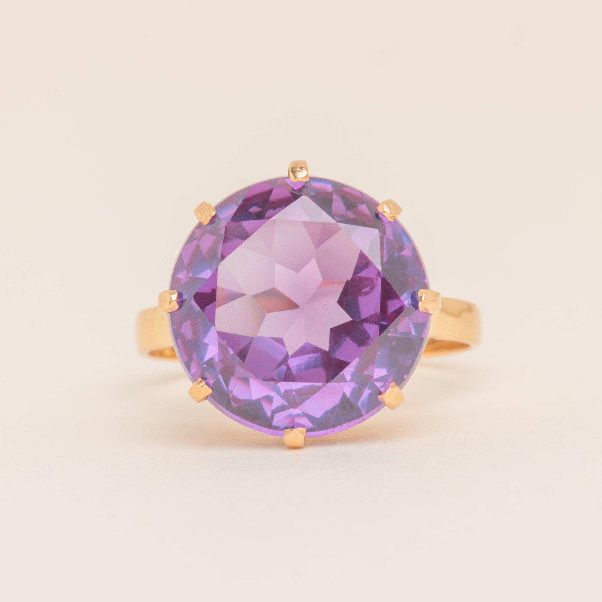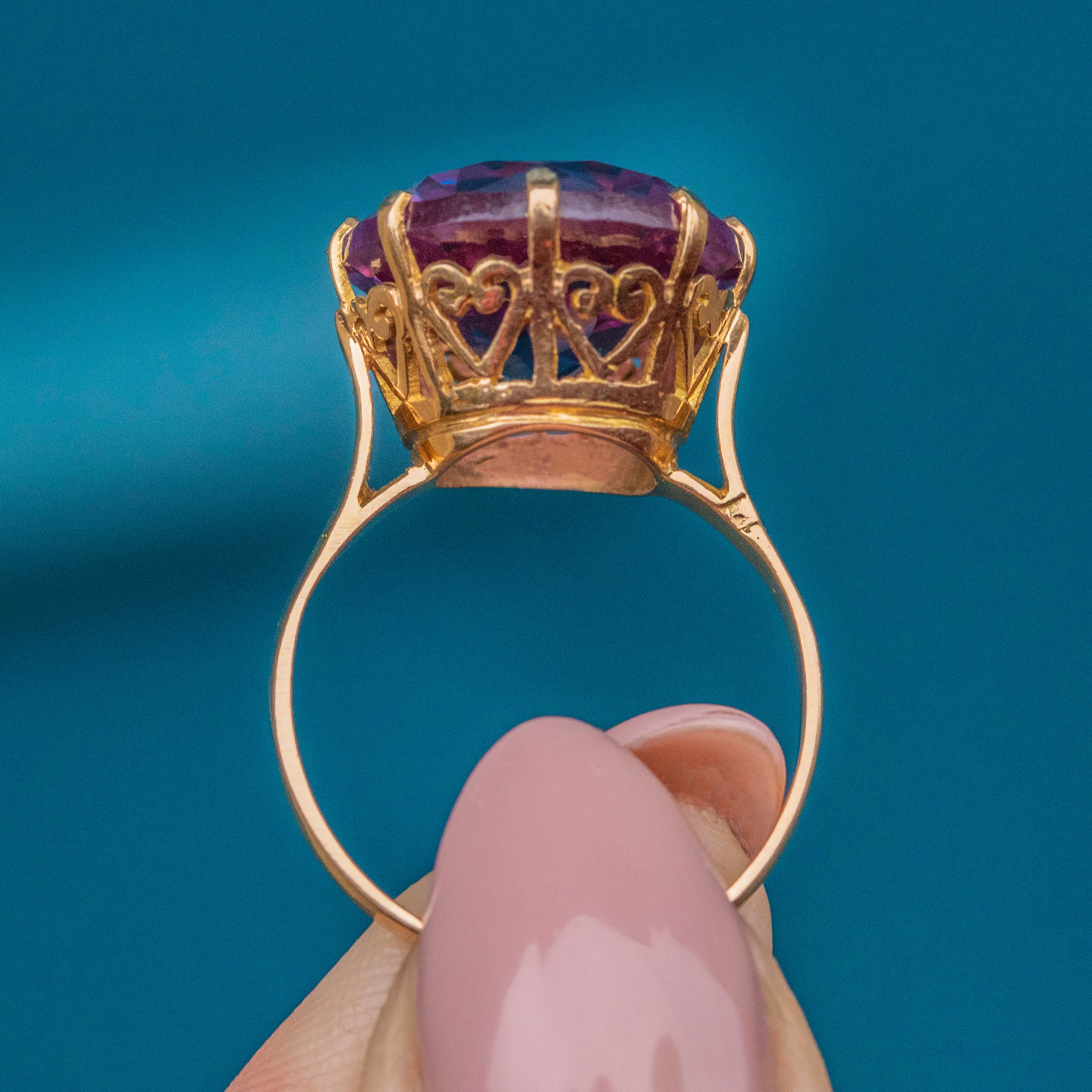 EXCELLENT. This Art Deco 18ct Gold colour change Sapphire cocktail ring is in pristine condition. Her Sapphire is immaculate, displaying a beautiful purple glow through her facets under the light with no visible scuffs or chips. Her 18ct Gold band has a gorgeously rich tone and is free from resize marks. All in all, she's a tantalising treat!