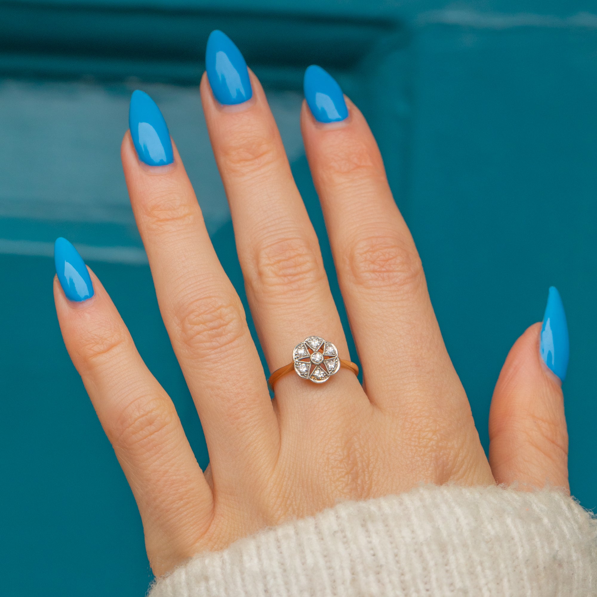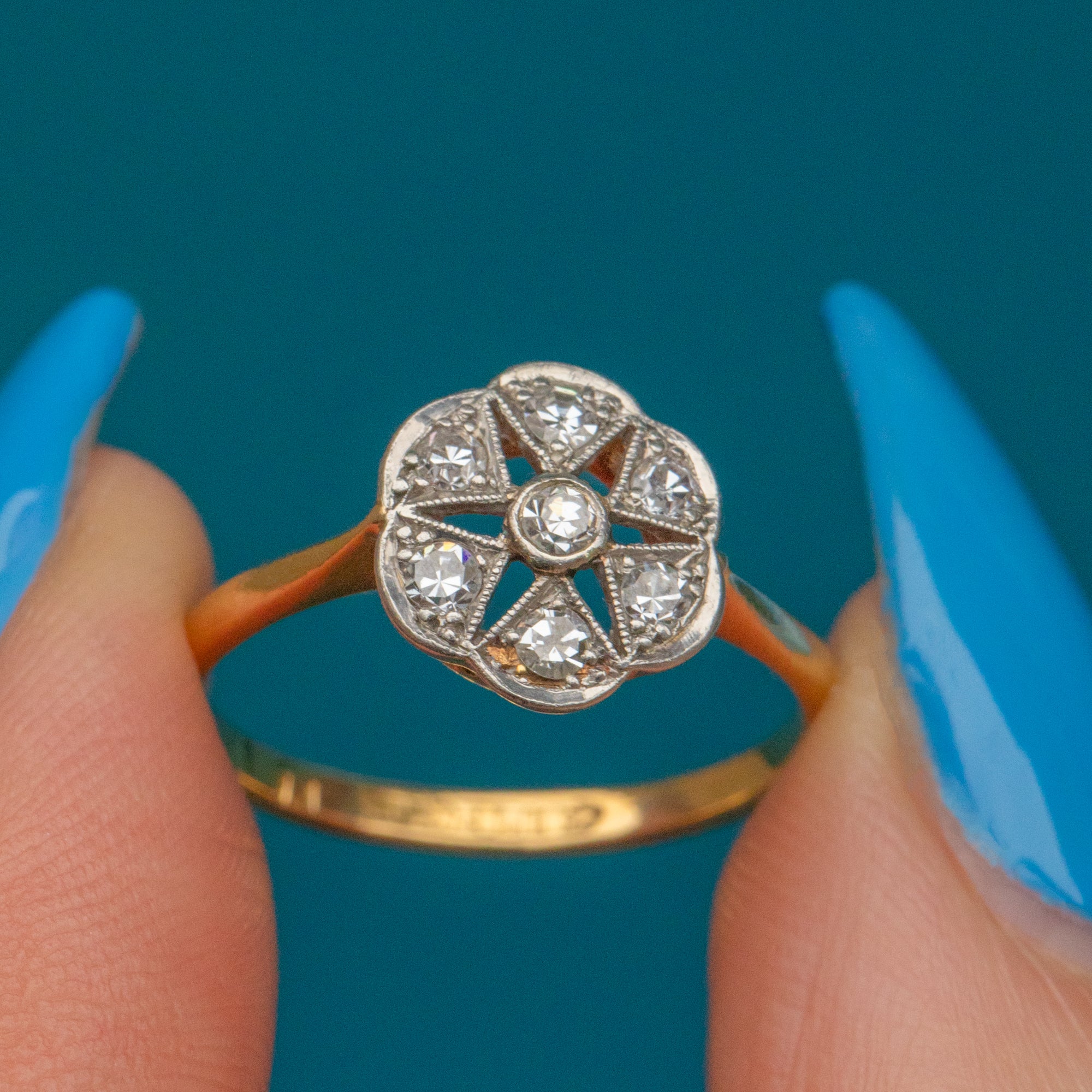 This is a gorgeous Art Deco 18ct Gold Diamond Flower cluster ring, perfect for everyday wear! This feminine ring will look gorgeous on the finger, with her total spread of 0.45ct sure to impress.