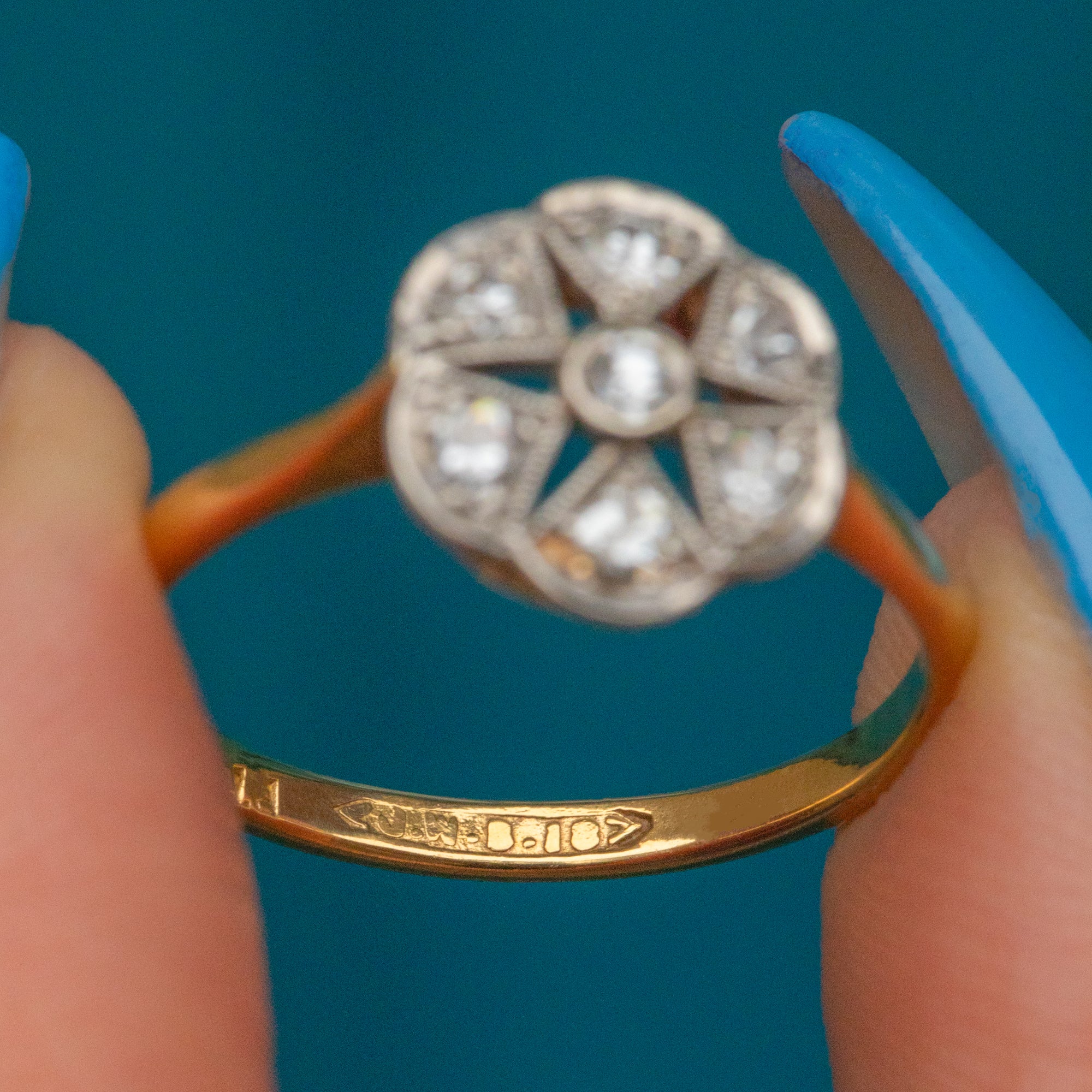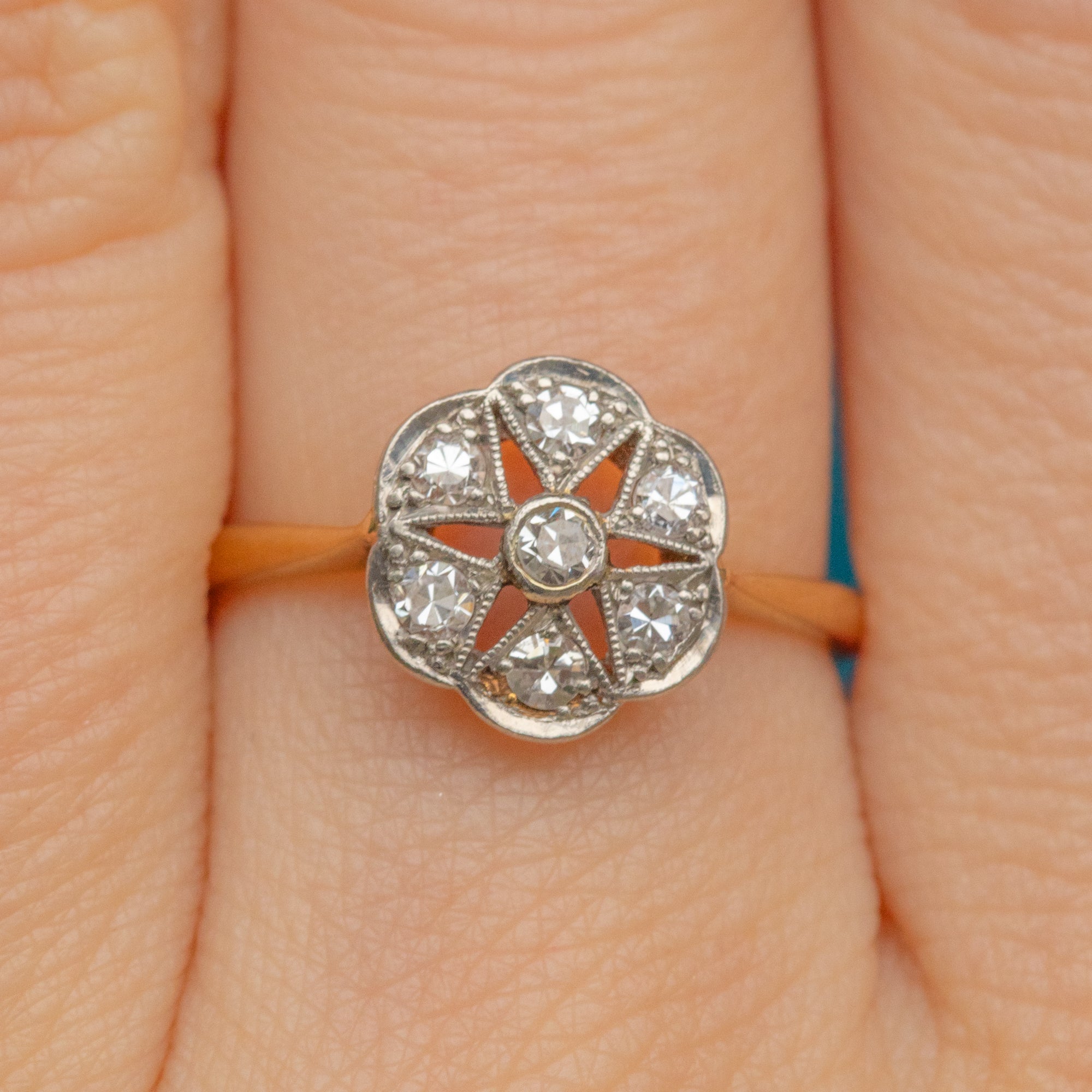EXCELLENT. This Art Deco 18ct Gold Diamond flower cluster ring is in fantastic condition. The Diamonds are all securely set and free from fleabites, emphasised by their White Gold illusion settings. The Gold is bright and buttery and the band is robust, promising you many more years of wear and enjoyment.
