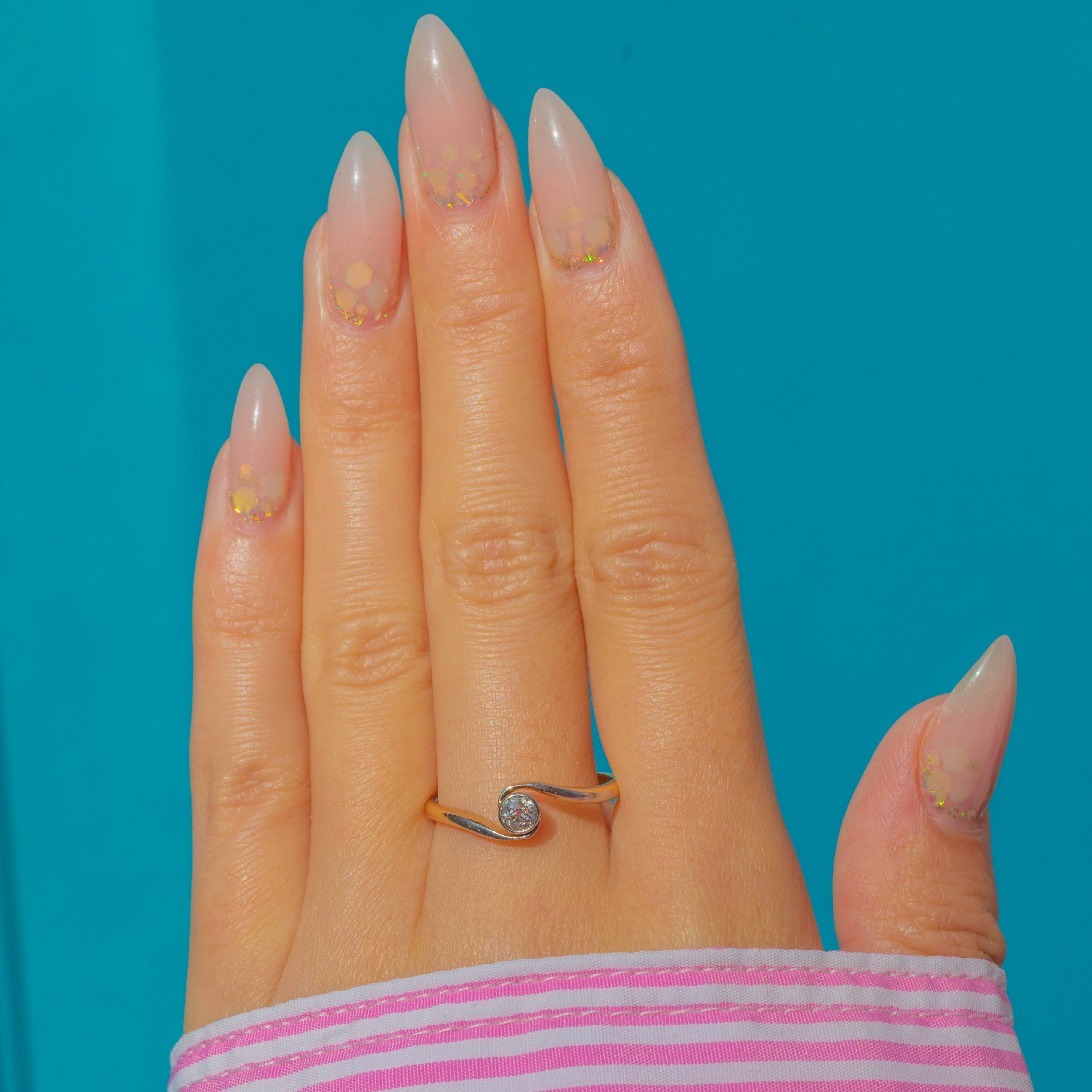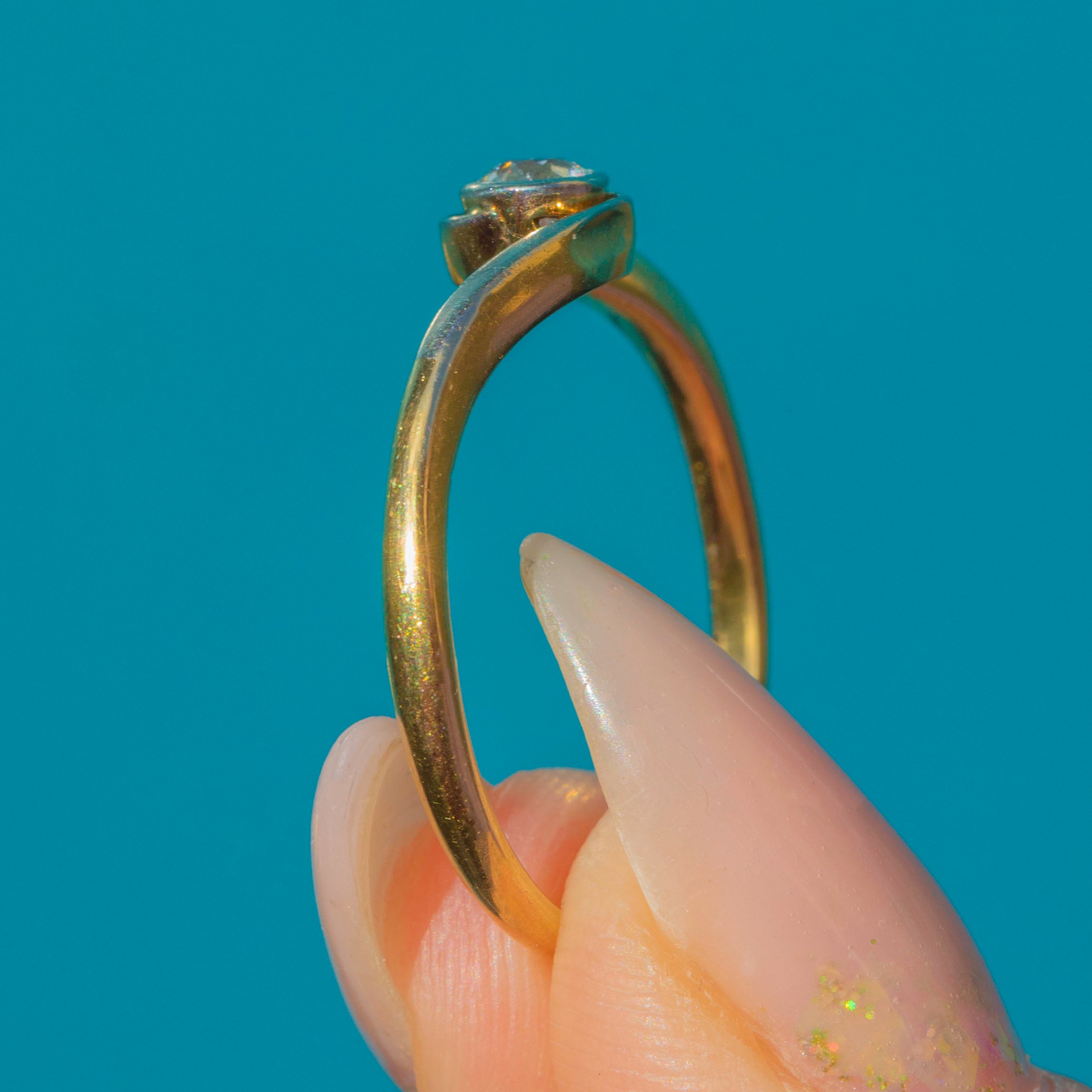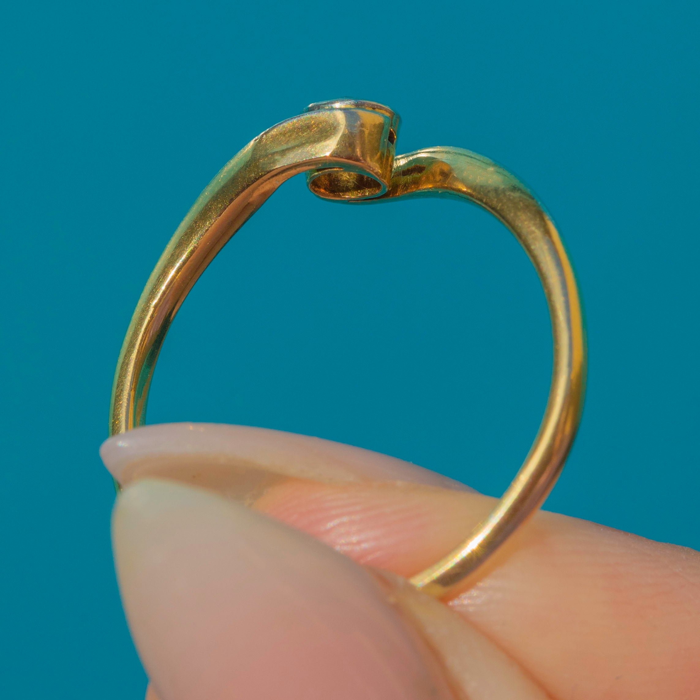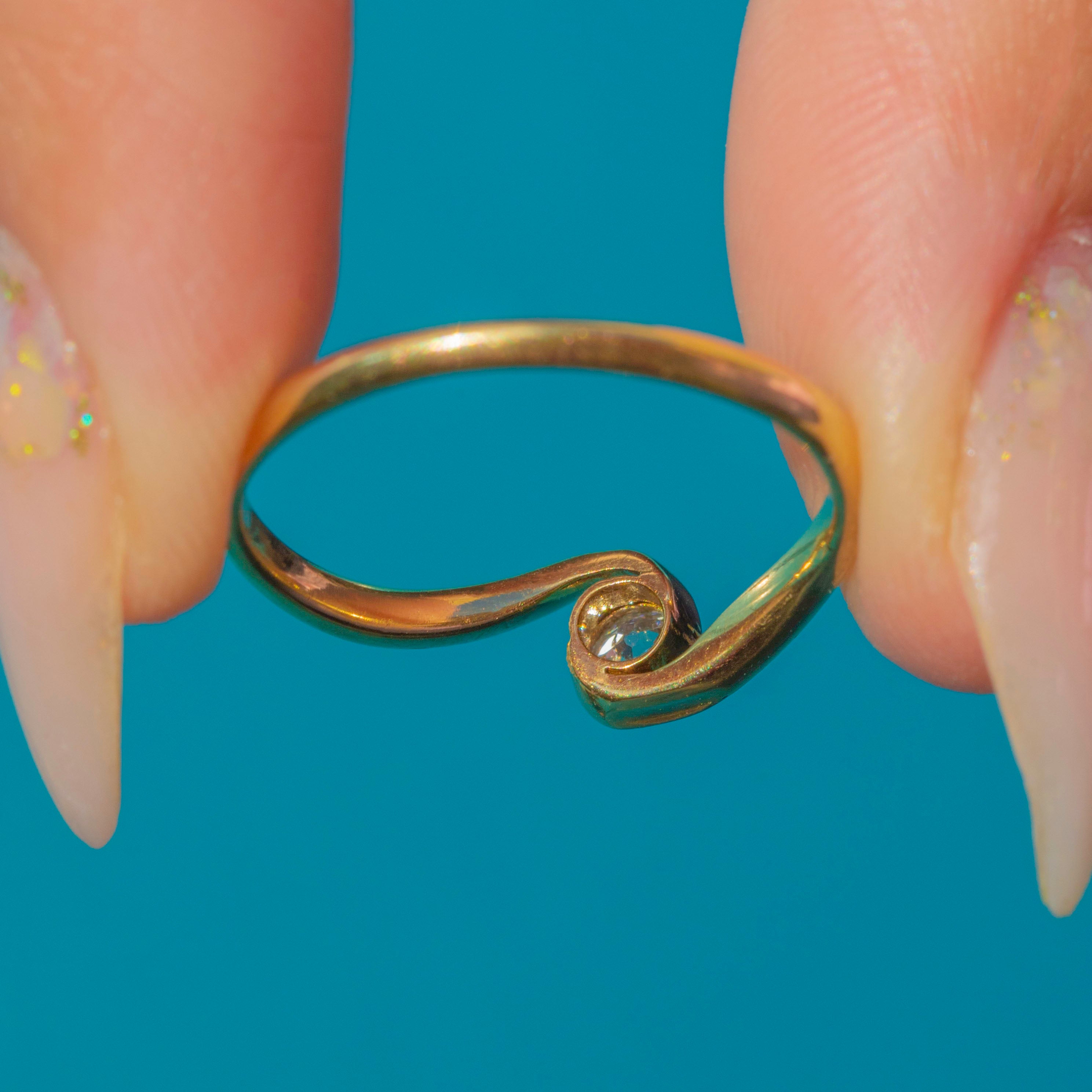 This elegant Art Deco solitaire ring features a sparkling old cut Diamond in a stylish twist setting, crafted in 18ct Gold. The fluid design gently curves around the finger, drawing the eye to the central stone and giving the ring a refined, timeless silhouette.
