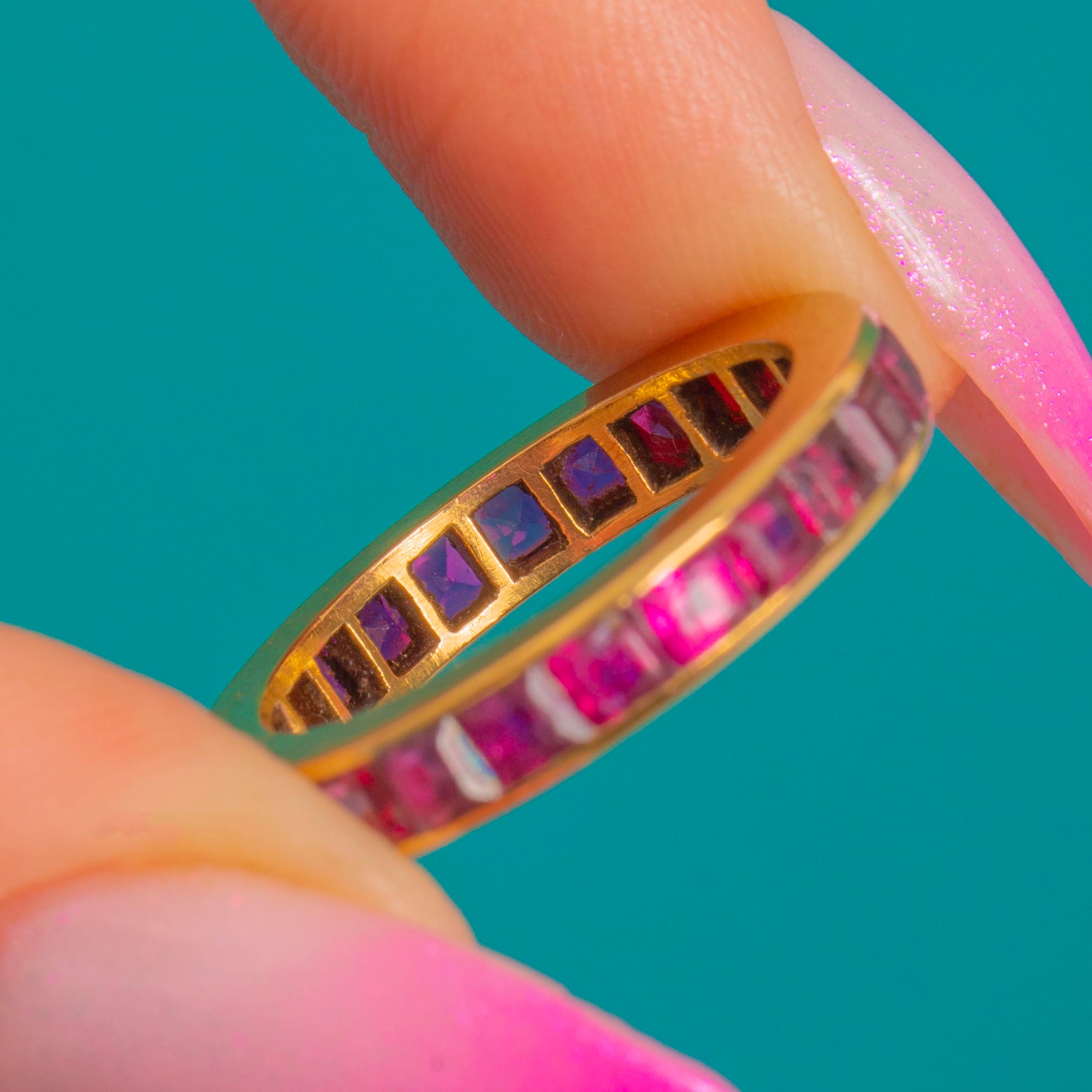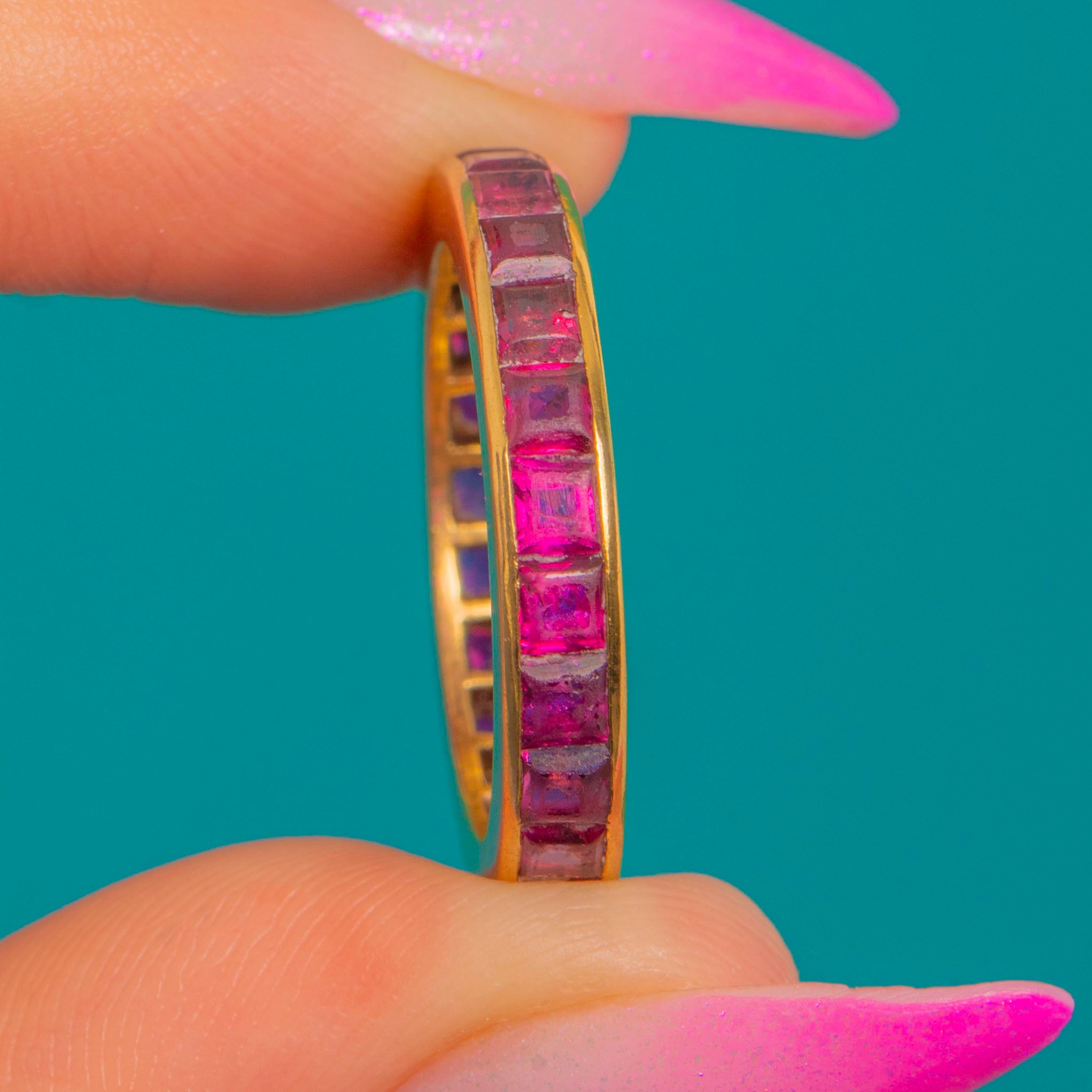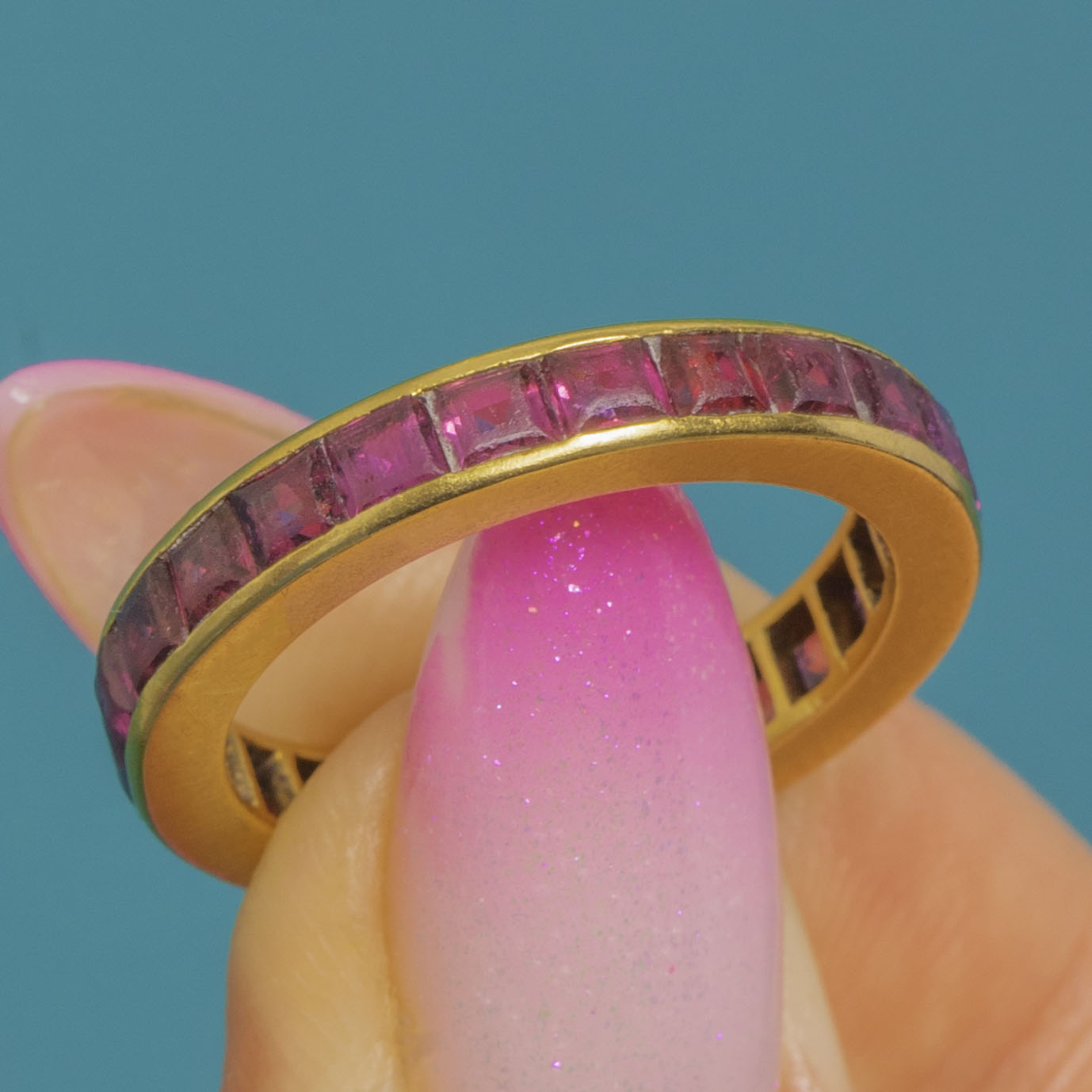 A sleek Art Deco treasure, this full-eternity ring is crafted in rich 18ct Gold and set with a seamless ribbon of Natural Rubies. The channel-set, geometric line of Ruby squares creates a vivid pink-red glow all the way around the finger, delivering that coveted Deco poise with a fresh, modern feel.