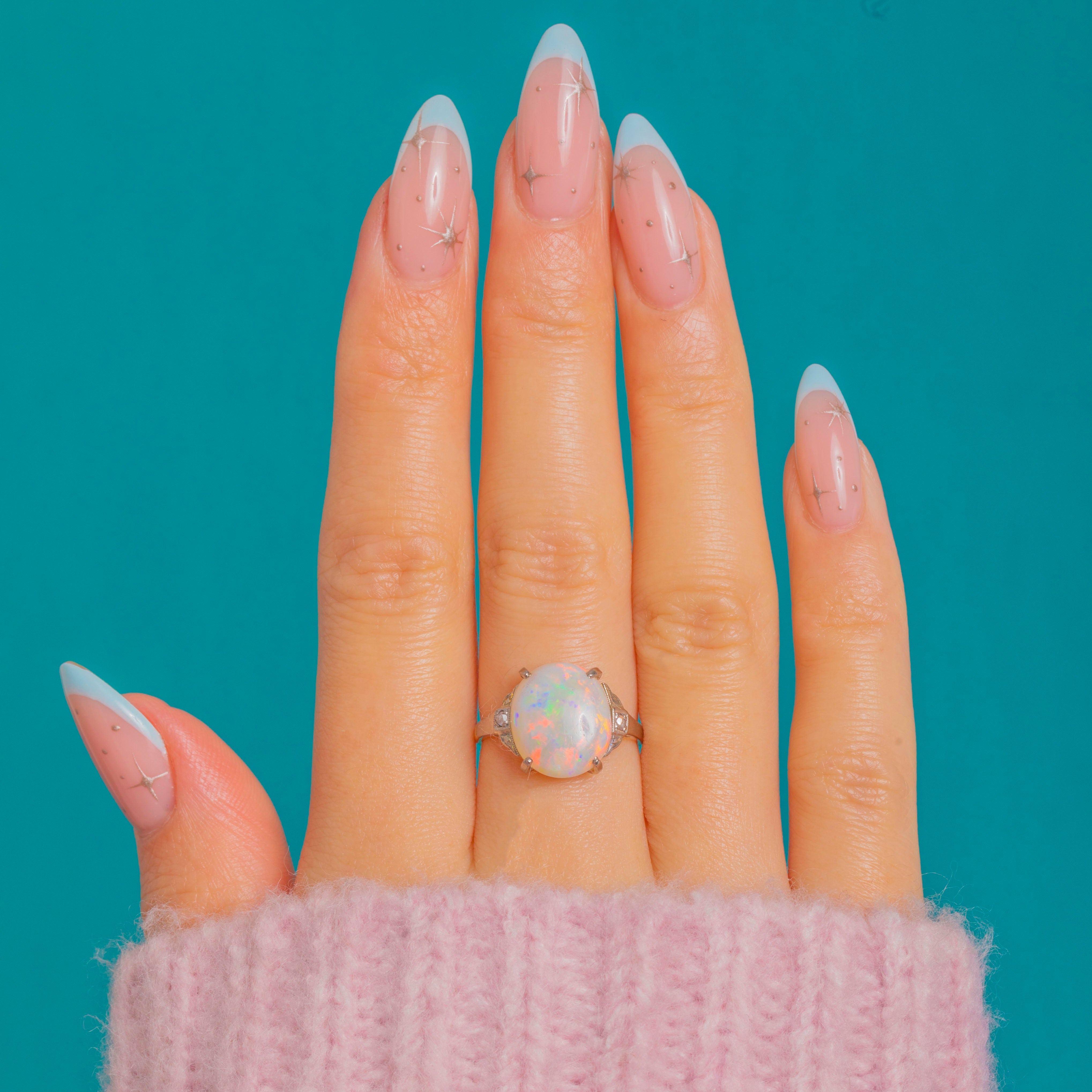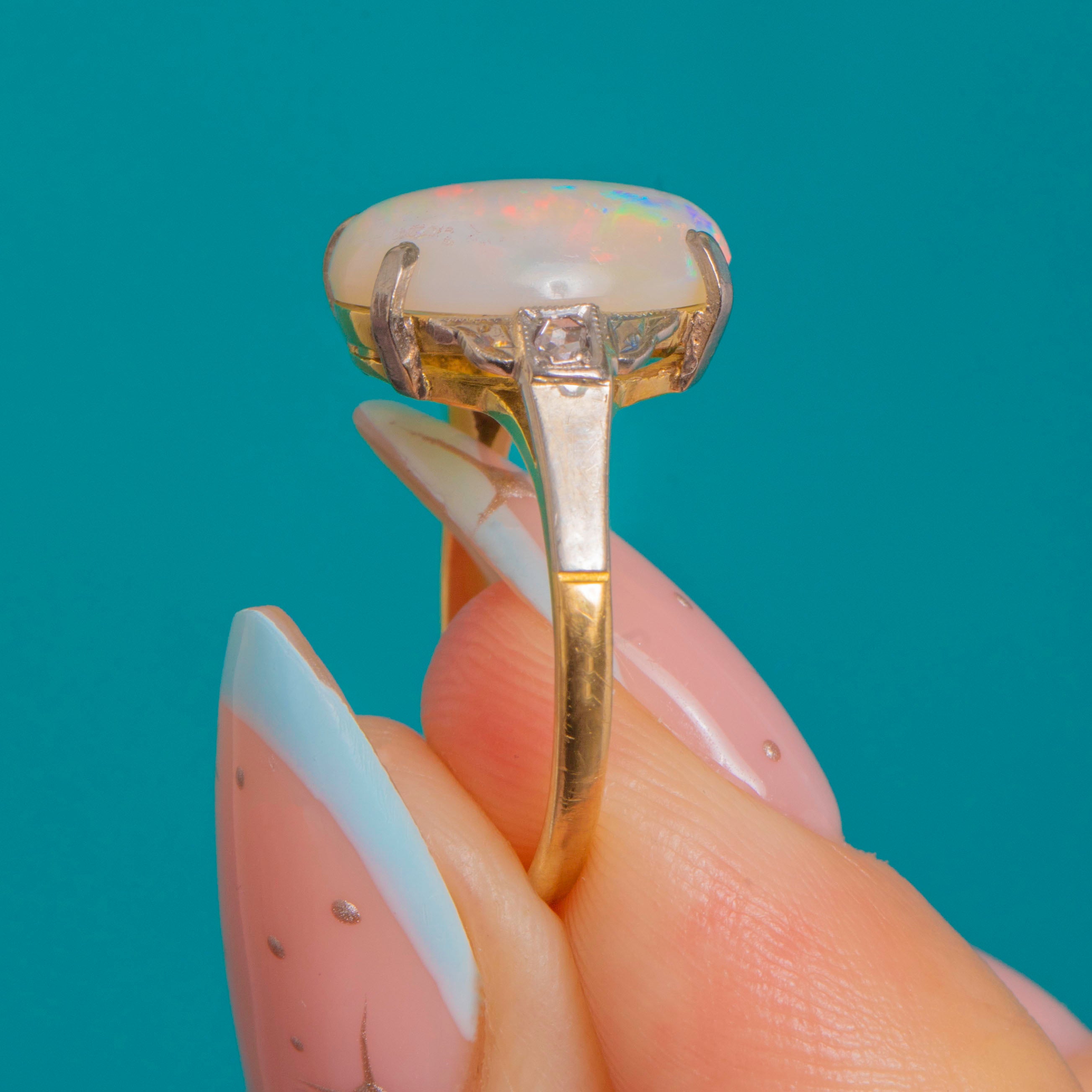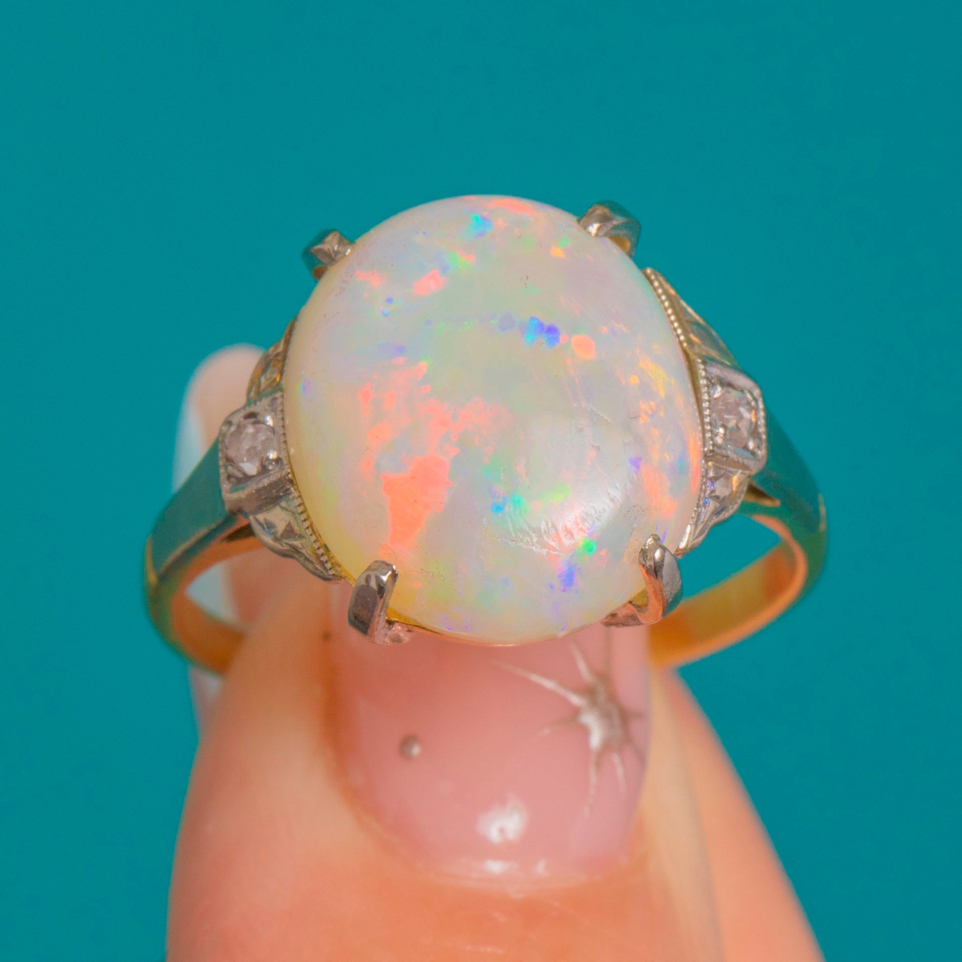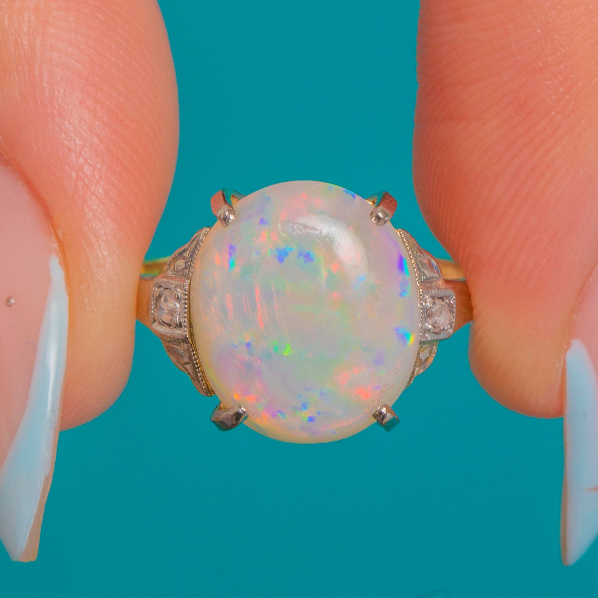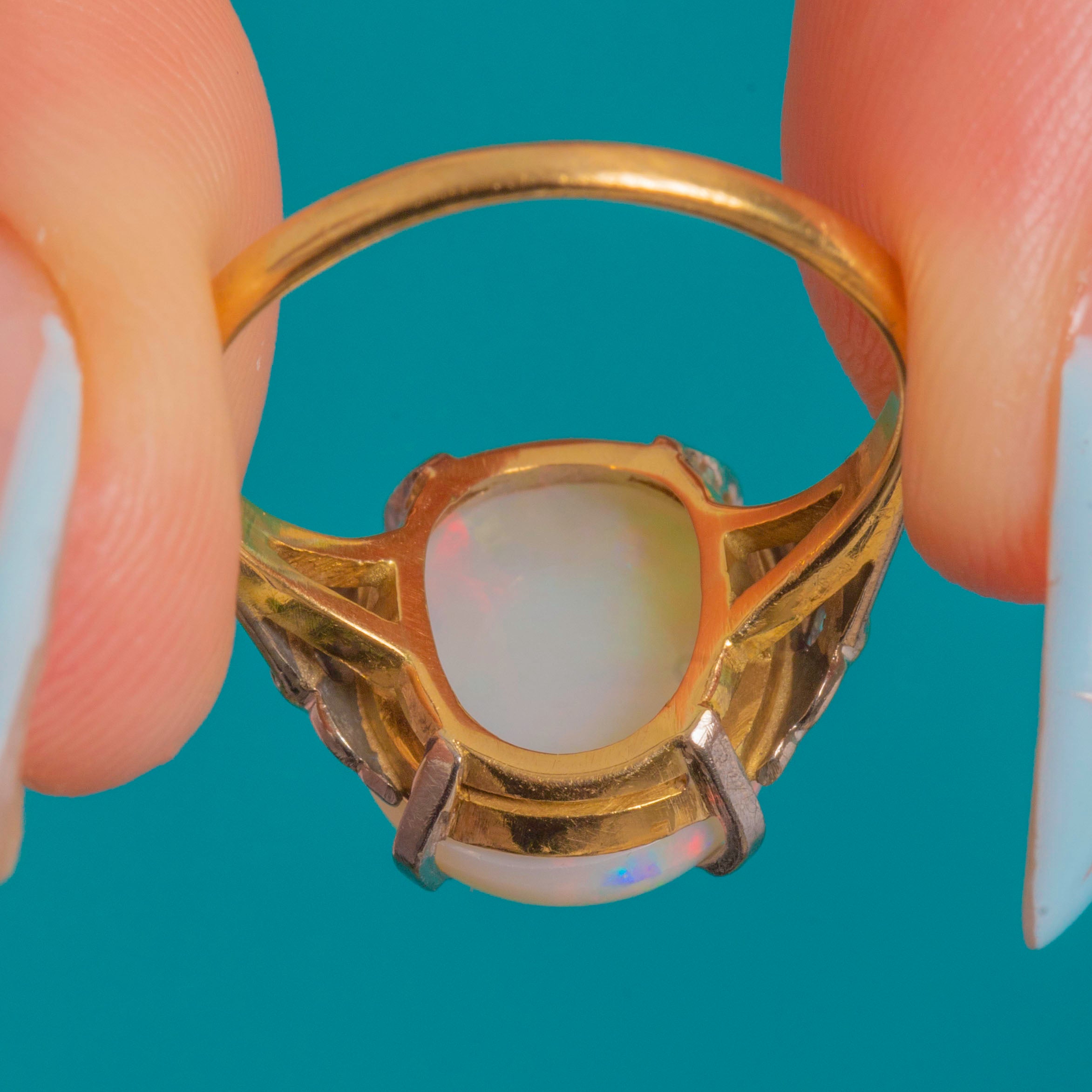 VERY GOOD-EXCELLENT: The Opal is smooth and glossy with vibrant play-of-colour and no chips observed; only light, age-appropriate surface wear. The White Gold settings are crisp with secure claws and fine milgrain detail, showing gentle patina consistent with age. The Yellow Gold shank is strong with a neat previous sizing seam visible to the underside.