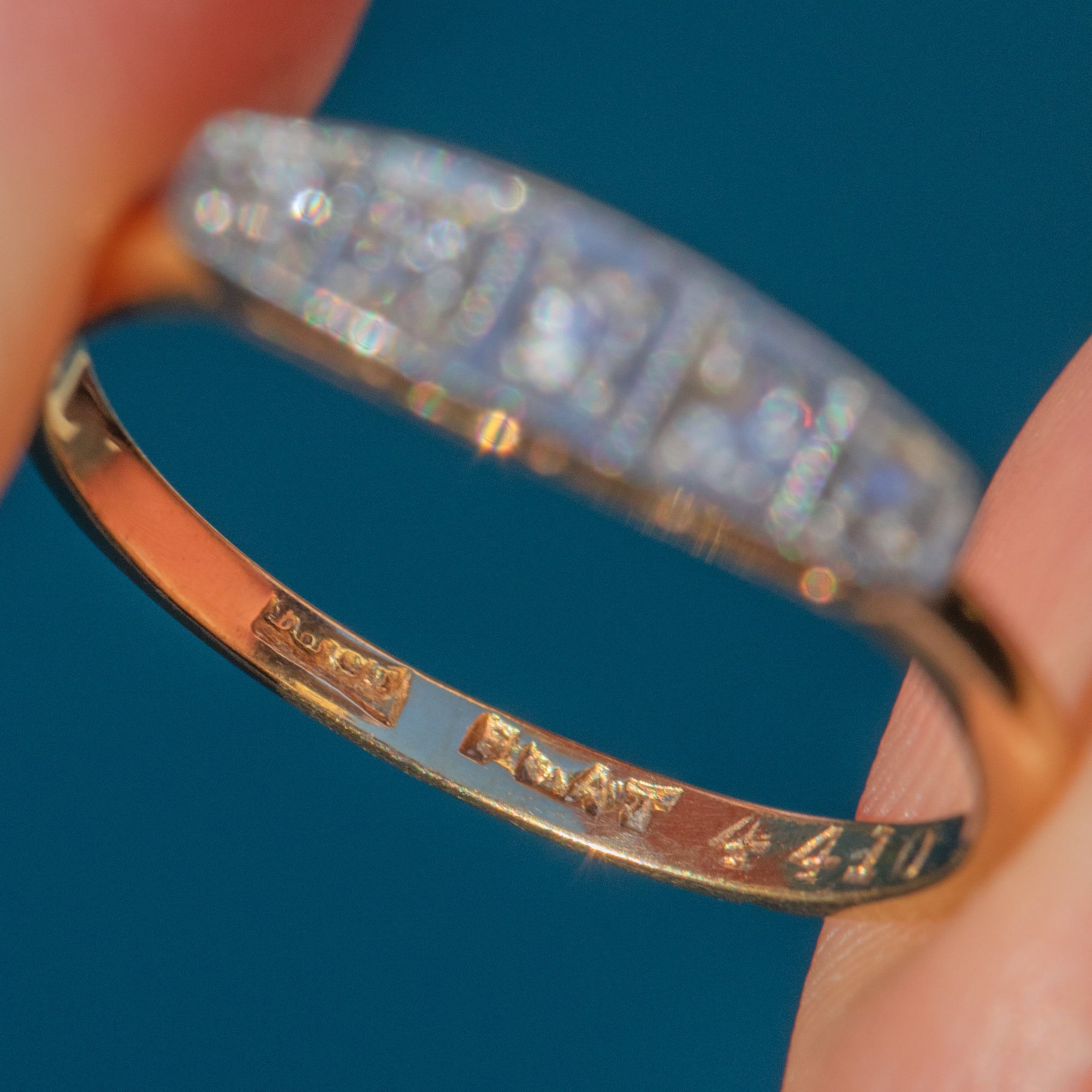 This elegant Art Deco 18ct Gold & Platinum Diamond five stone ring will make a splendid addition to your collection! The band is crafted from saturated 18ct Gold and has lovely chunky Art Deco stamps inside, displaying the five glimmering Diamonds in Platinum illusion settings creating a refined and elegant look.