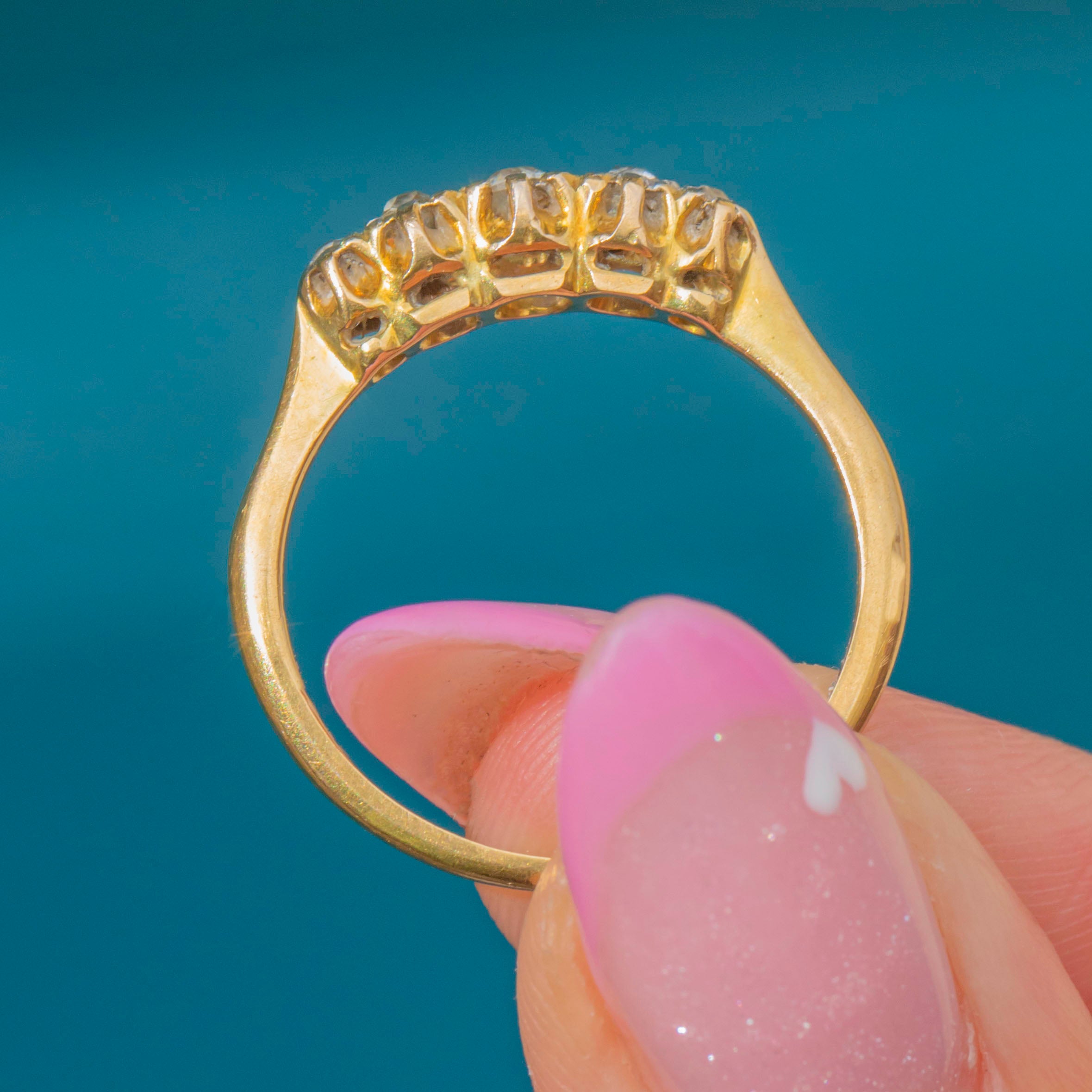 A classic Art Deco five-stone Diamond ring set in Platinum with a buttery 18ct Gold band. The bright, well-matched Diamonds are claw-set across the finger, their sparkle beautifully complemented by the warm yellow Gold band.