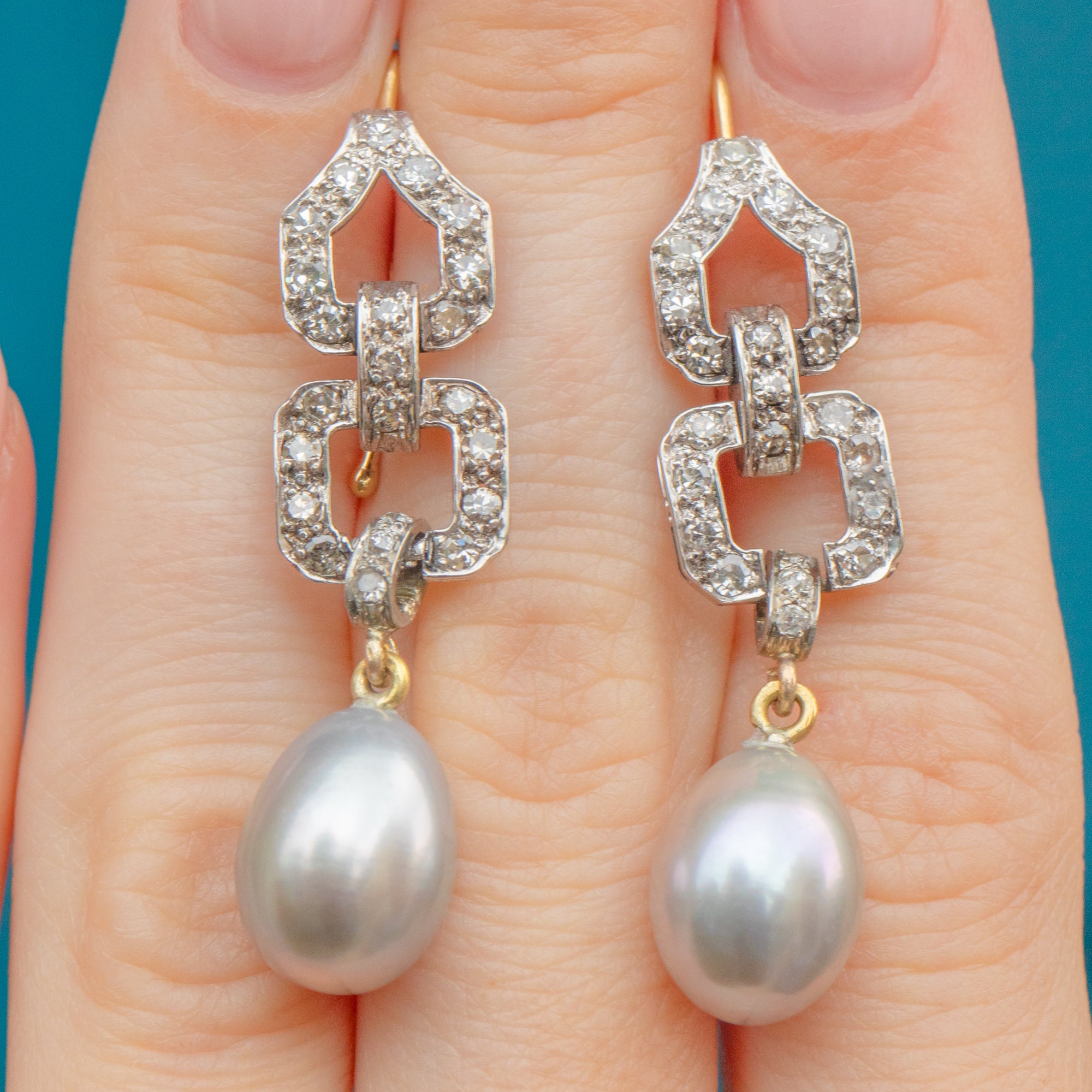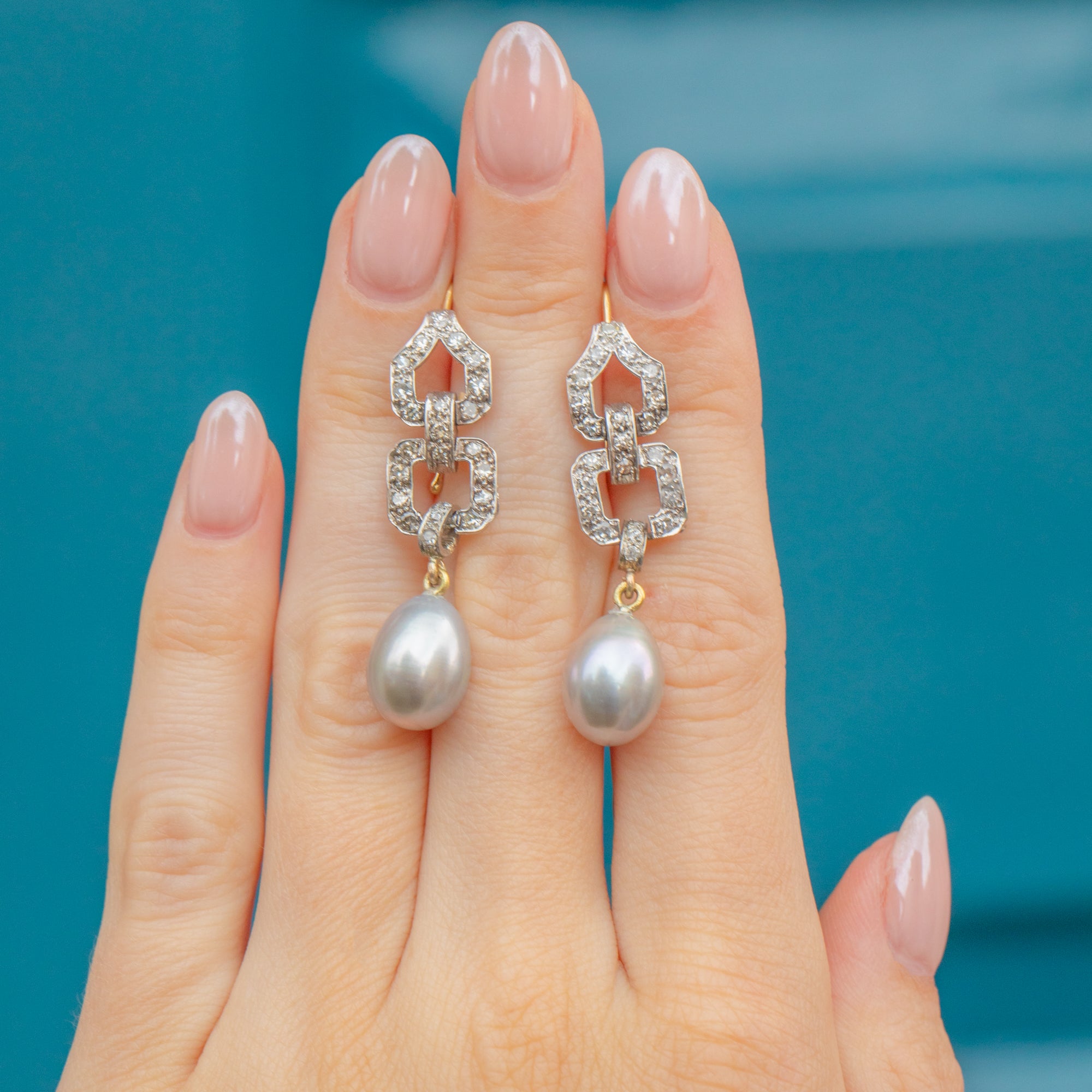 Each earring features shimmering Diamonds that dance with the light, with drops formed of Pear shaped Pearls with an exceptional silver shimmer, embodying classic beauty. Whether chosen for a special occasion or as a daily expression of elegance, these Art Deco earrings will elevate any outfit, showcasing exceptional craftsmanship and refined taste.