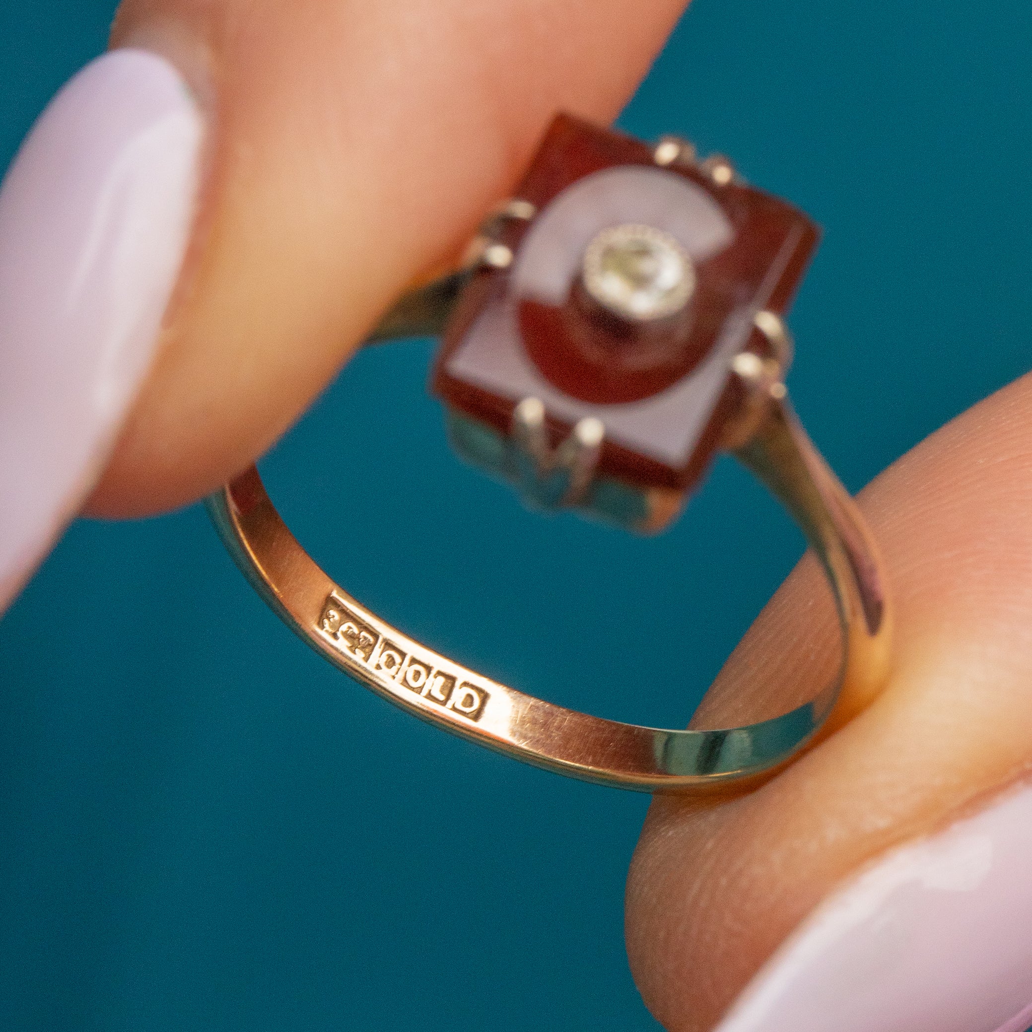 Add intrigue to your collection with this striking Art Deco 9ct Gold Agate panel ring! Unequivocally Deco in every way, the combination of Gold and Platinum with the unique design of this ring is what makes her so desirable.