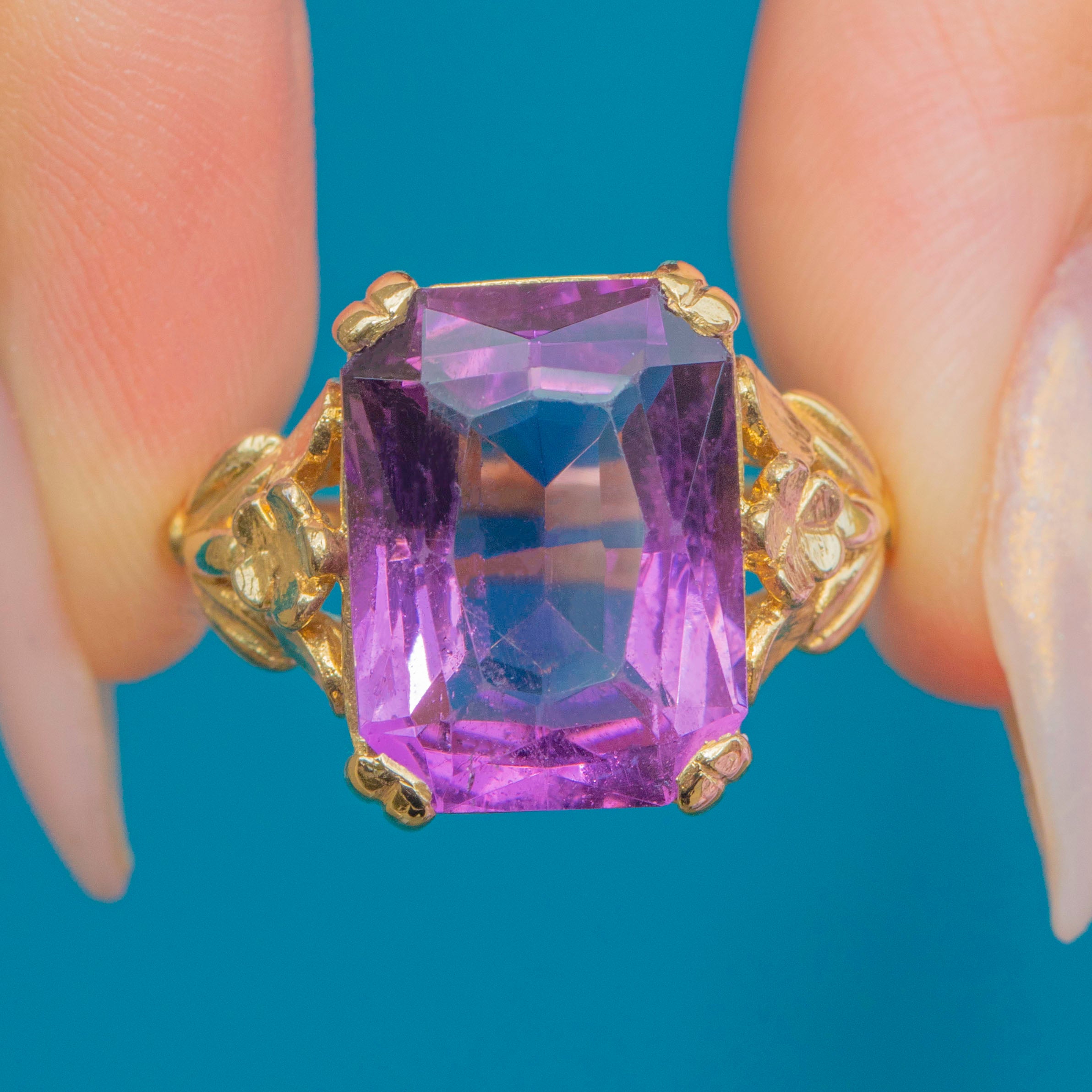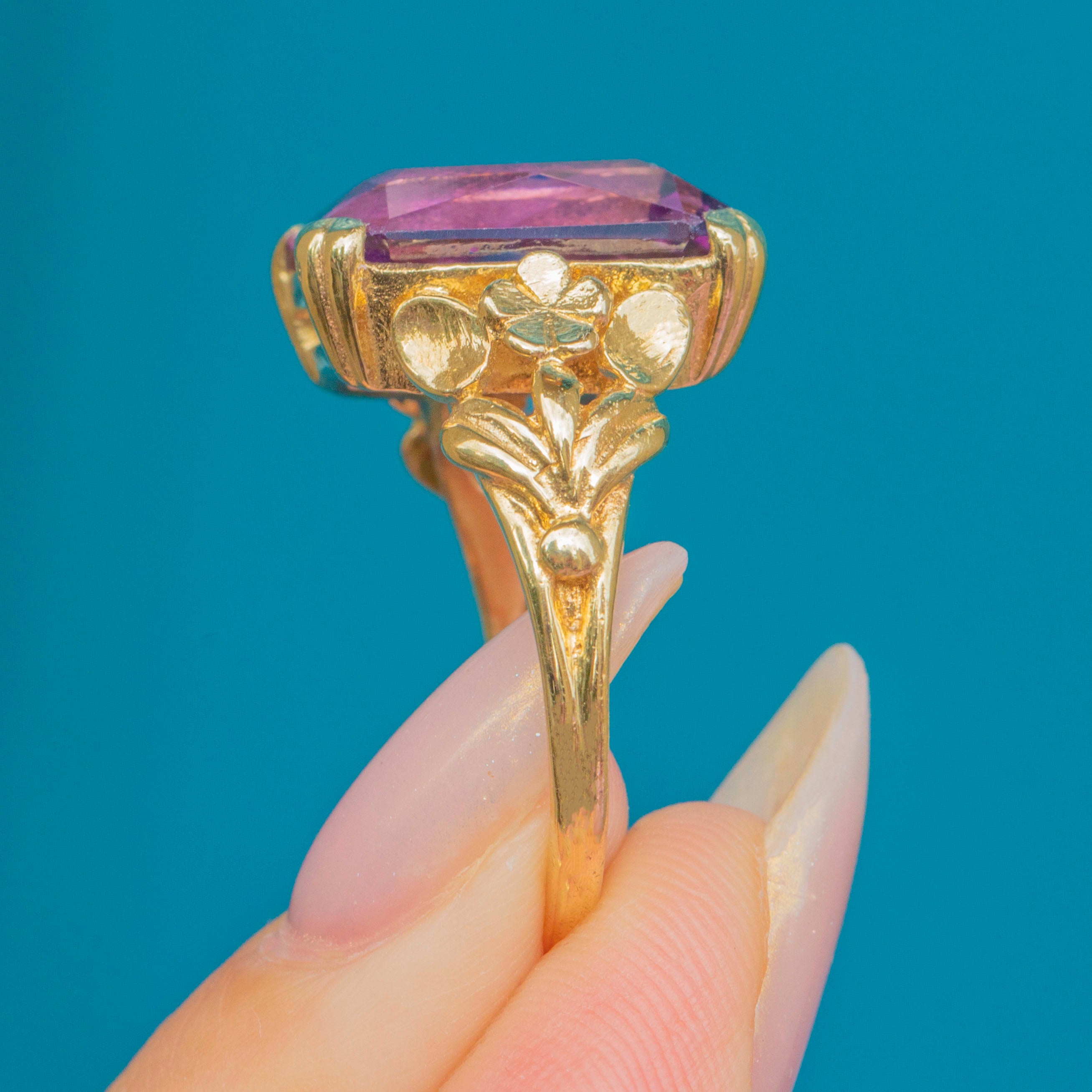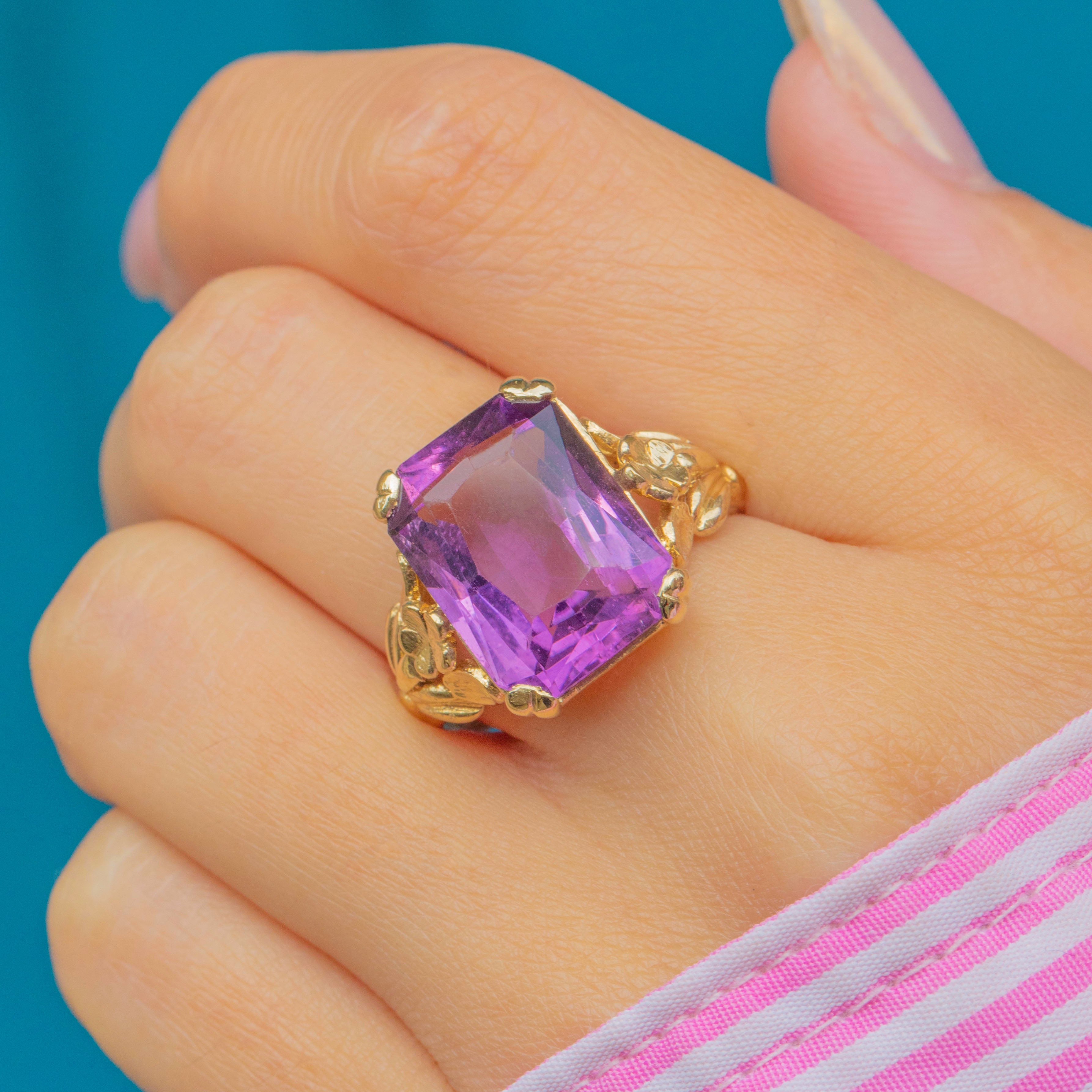 A striking Art Deco Amethyst ring, crafted in 9ct Gold with beautifully detailed floral shoulders. The bold emerald-cut Amethyst, weighing an impressive 15.00ct, radiates a rich purple hue with wonderful vibrancy and clarity. Its elongated rectangular cut catches the light with every movement, making it an eye-catching statement piece.