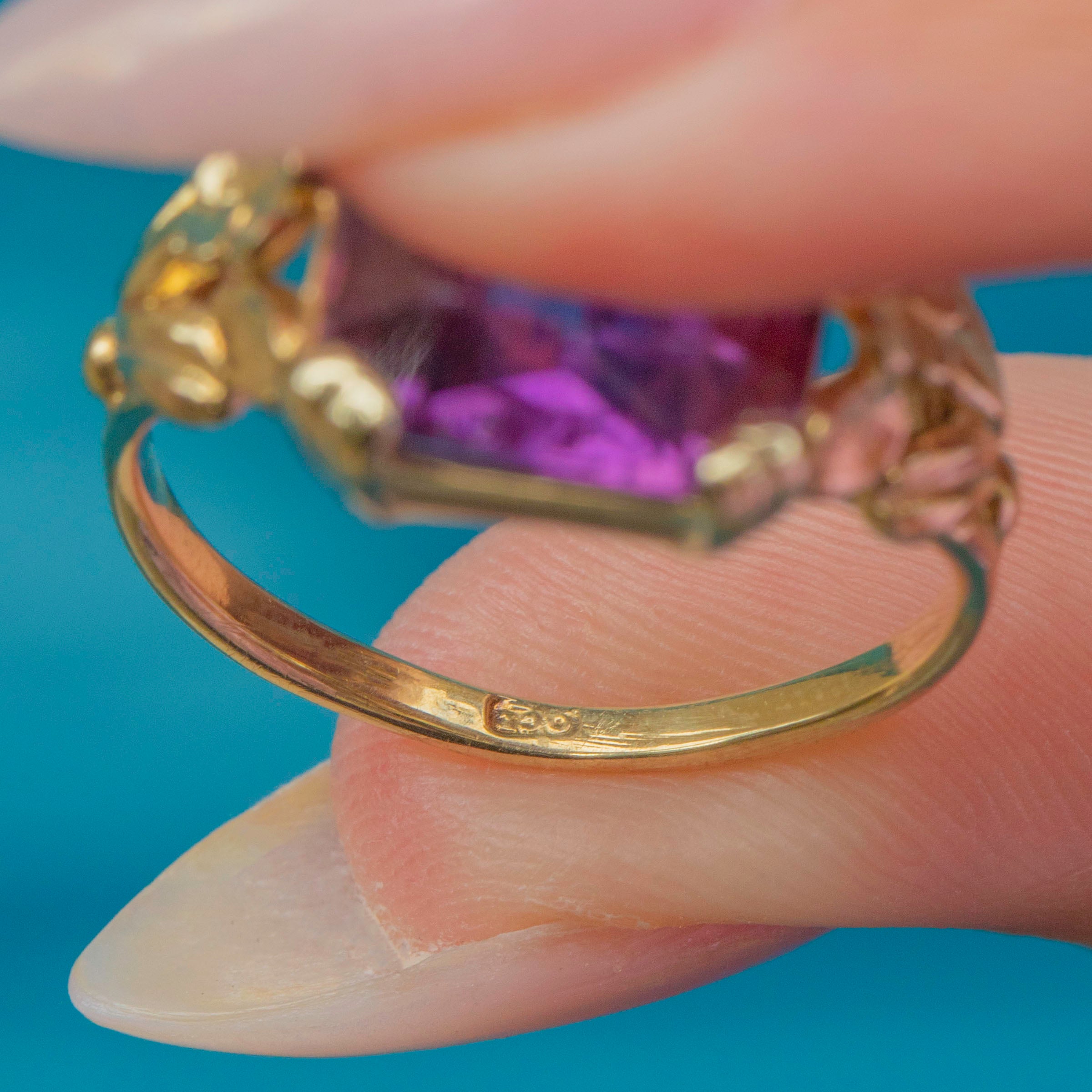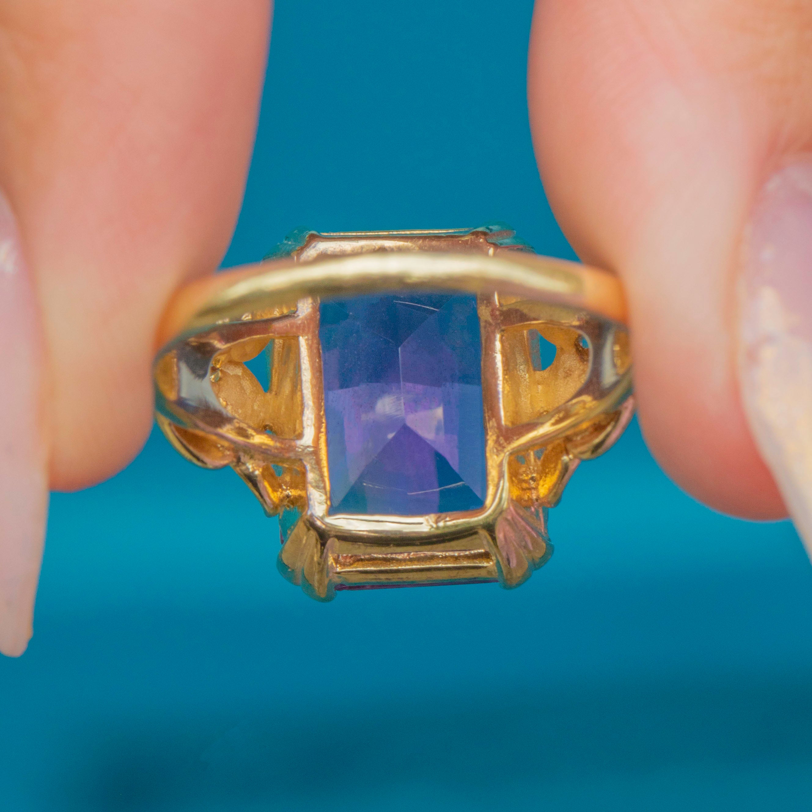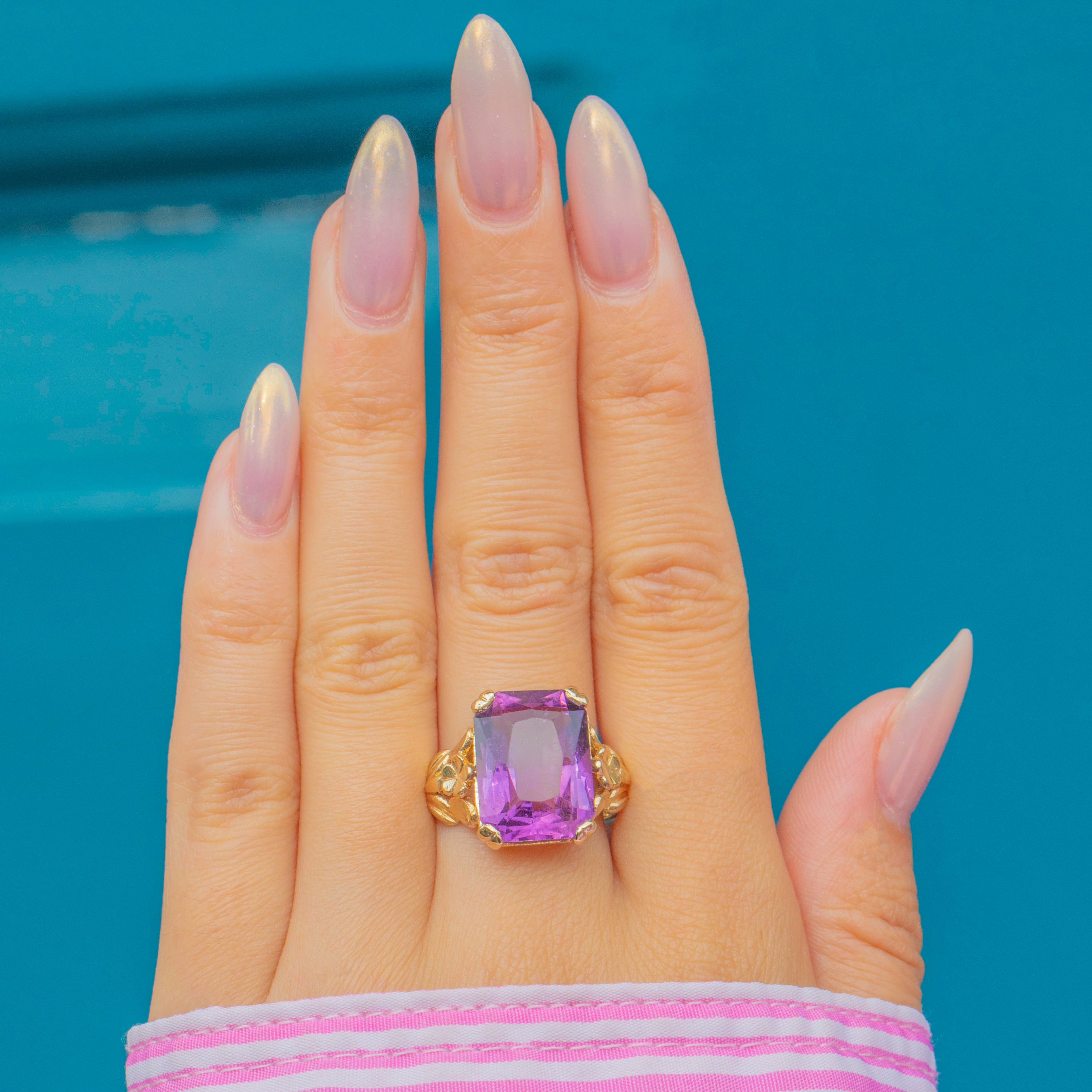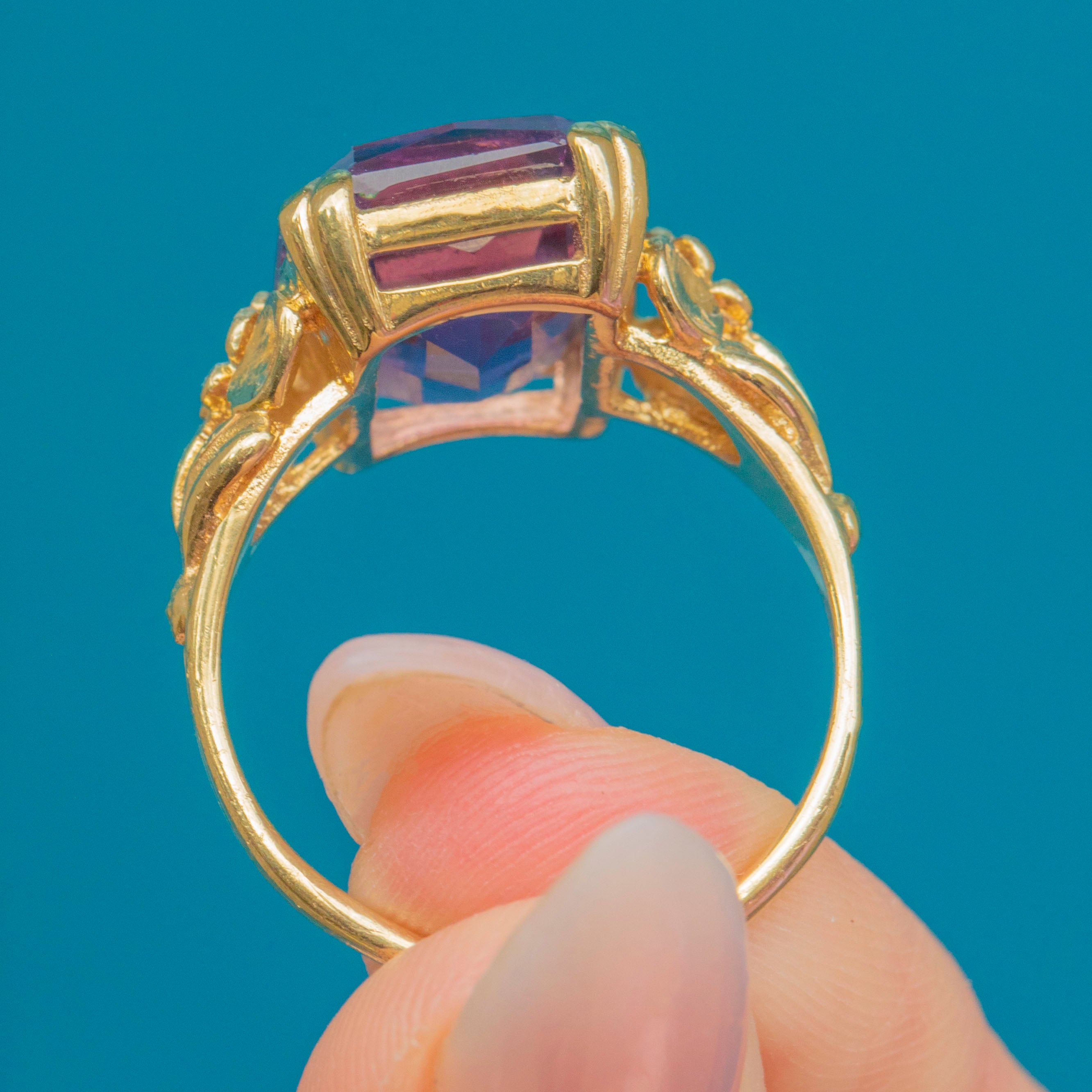 A striking Art Deco Amethyst ring, crafted in 9ct Gold with beautifully detailed floral shoulders. The bold emerald-cut Amethyst, weighing an impressive 15.00ct, radiates a rich purple hue with wonderful vibrancy and clarity. Its elongated rectangular cut catches the light with every movement, making it an eye-catching statement piece.
