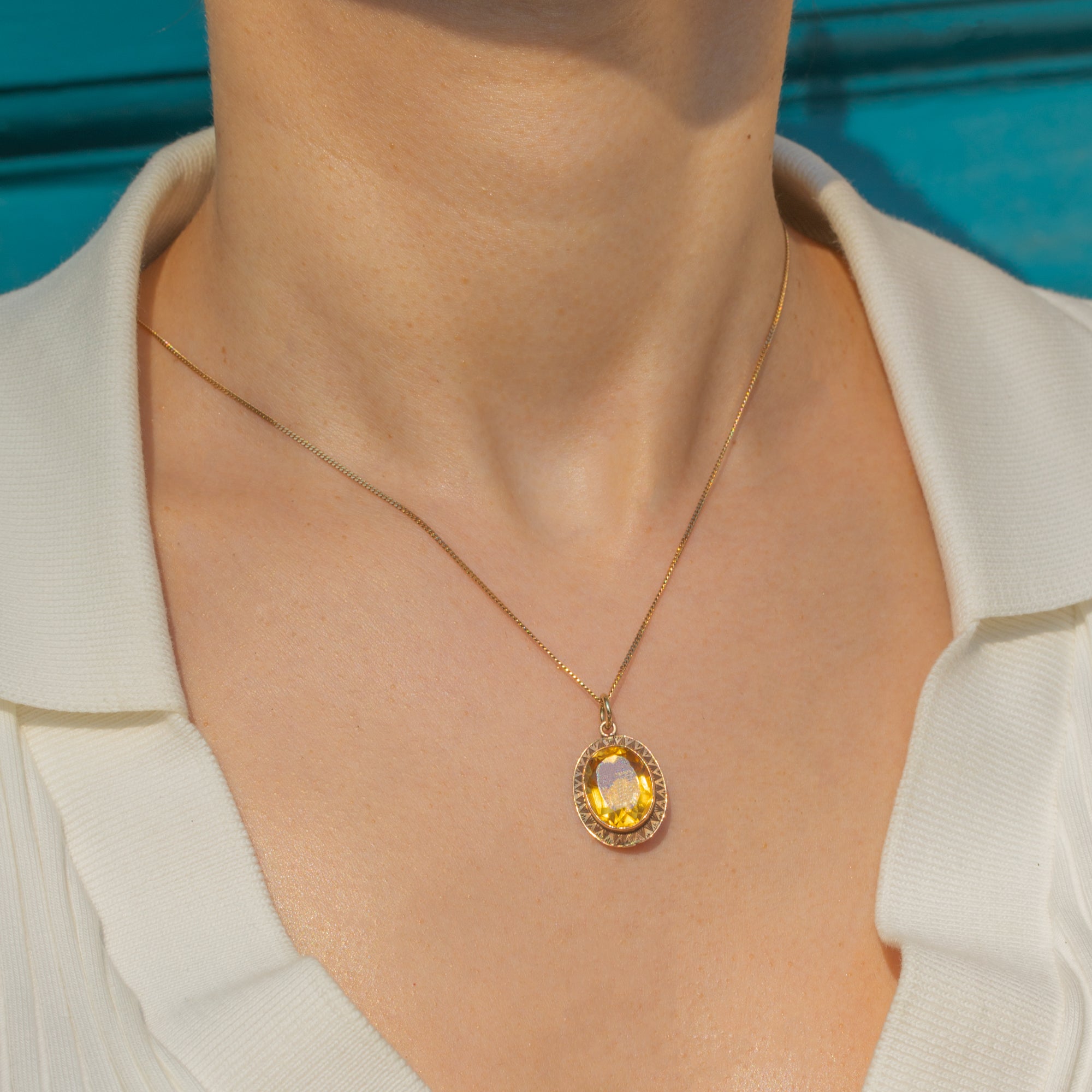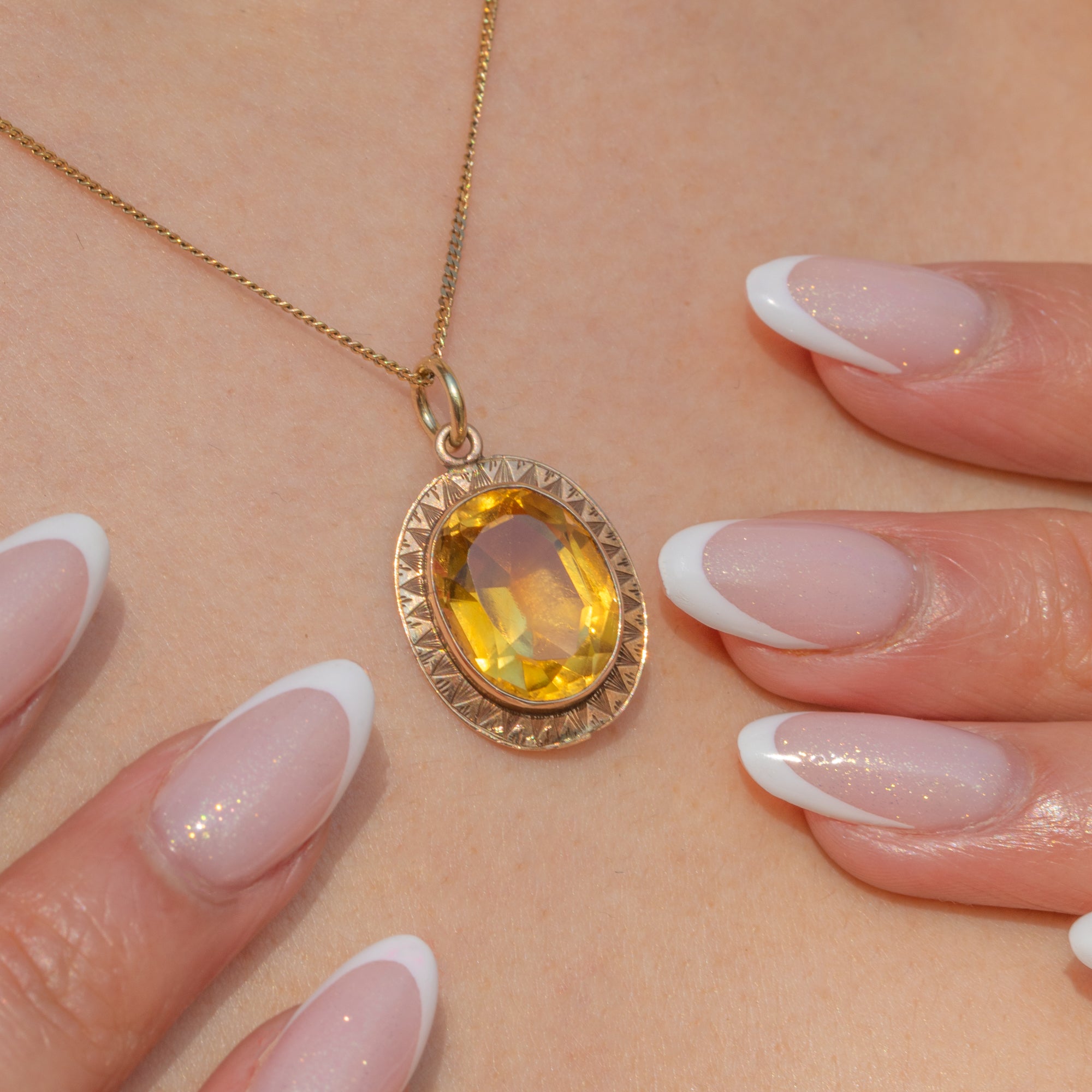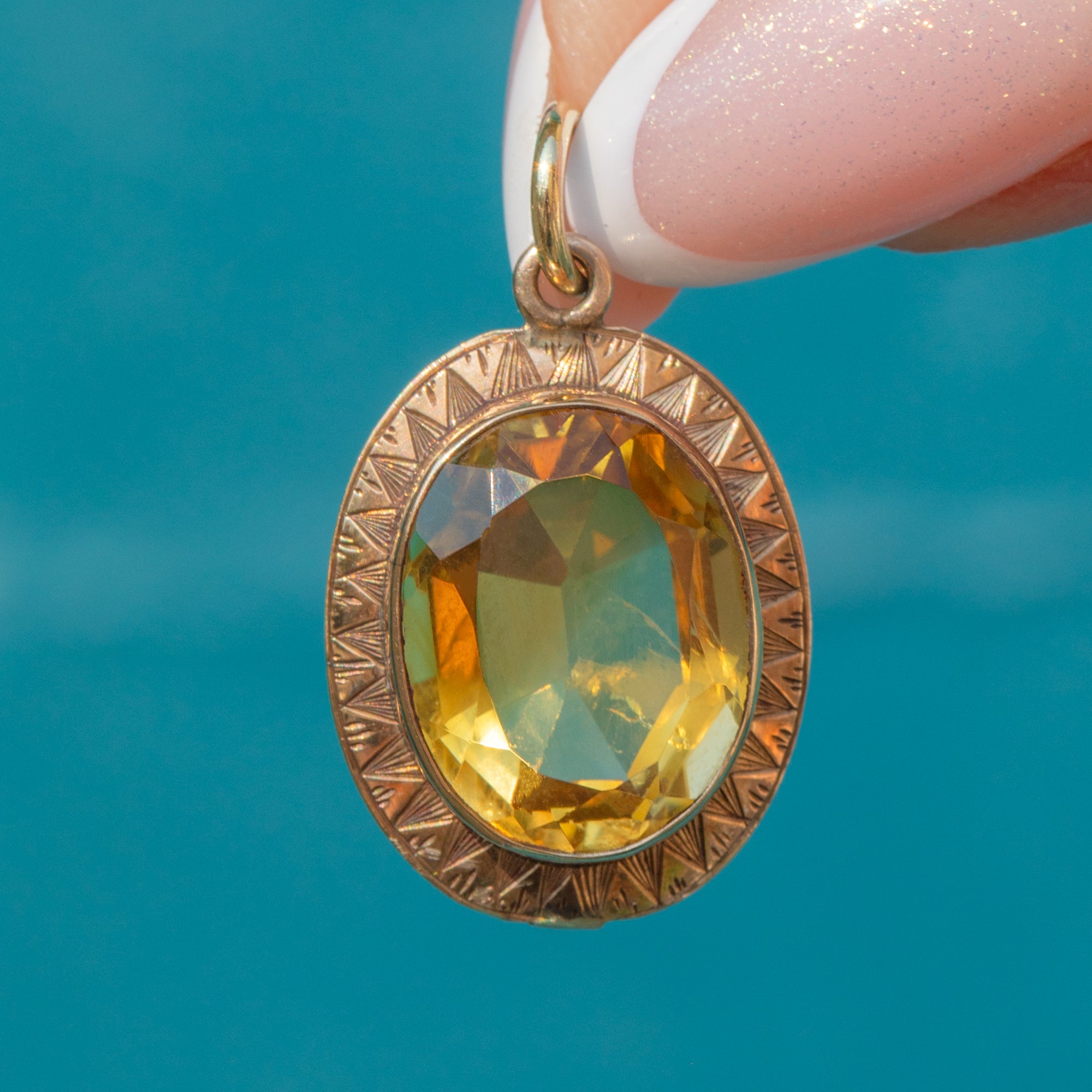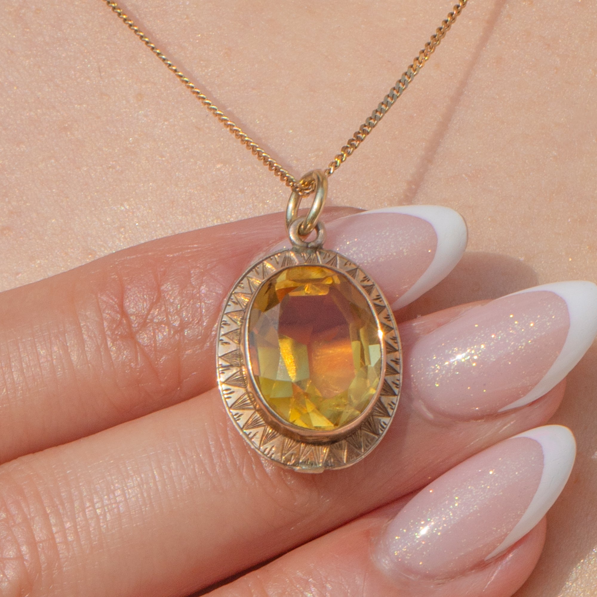 Faceted to perfection, the 4.50ct Citrine glimmers magnificently when she catches the light, haloed by geometric engravings that showcase the exquisite craftsmanship of the Art Deco era. This honey-hued pendant will add a luxurious accent of colour to your attire!
