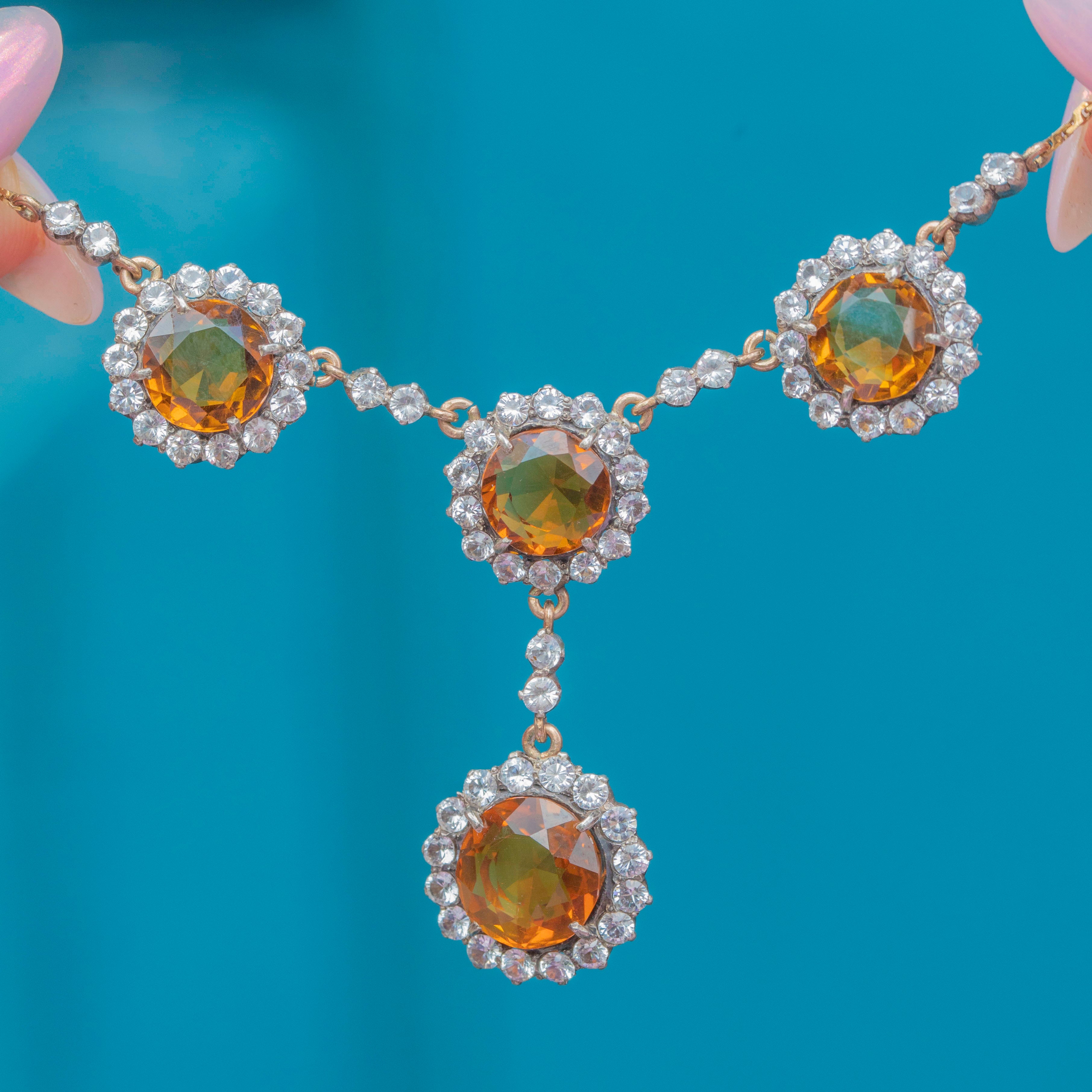 A radiant antique drop necklace, adorned with 7.25 carats of plump Citrine gemstones haloed by bright white Sapphires!