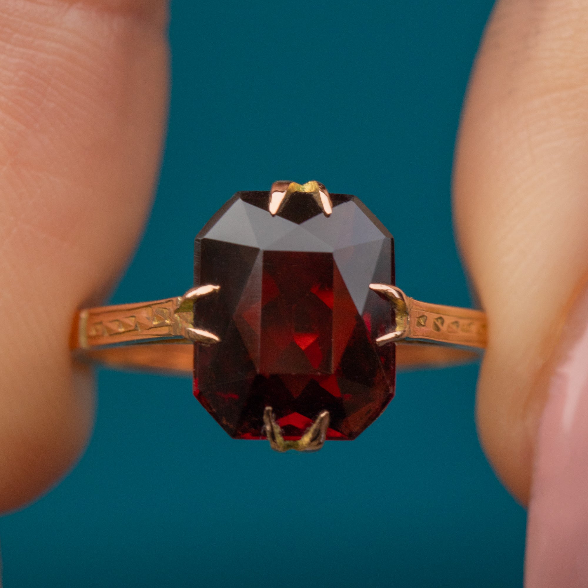 This splendid Art Deco 9ct Gold Garnet ring will instantly inject some timless elegance into your collection! The bold rectangular-cut 7.20ct Garnet is bound to grab your attention, with its deep red hue and large geometric facets that catch the light magnificently.