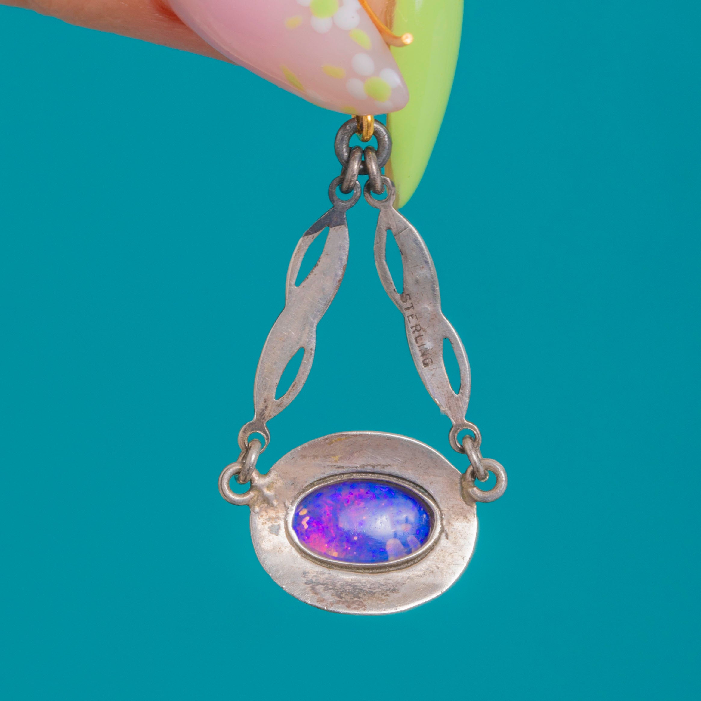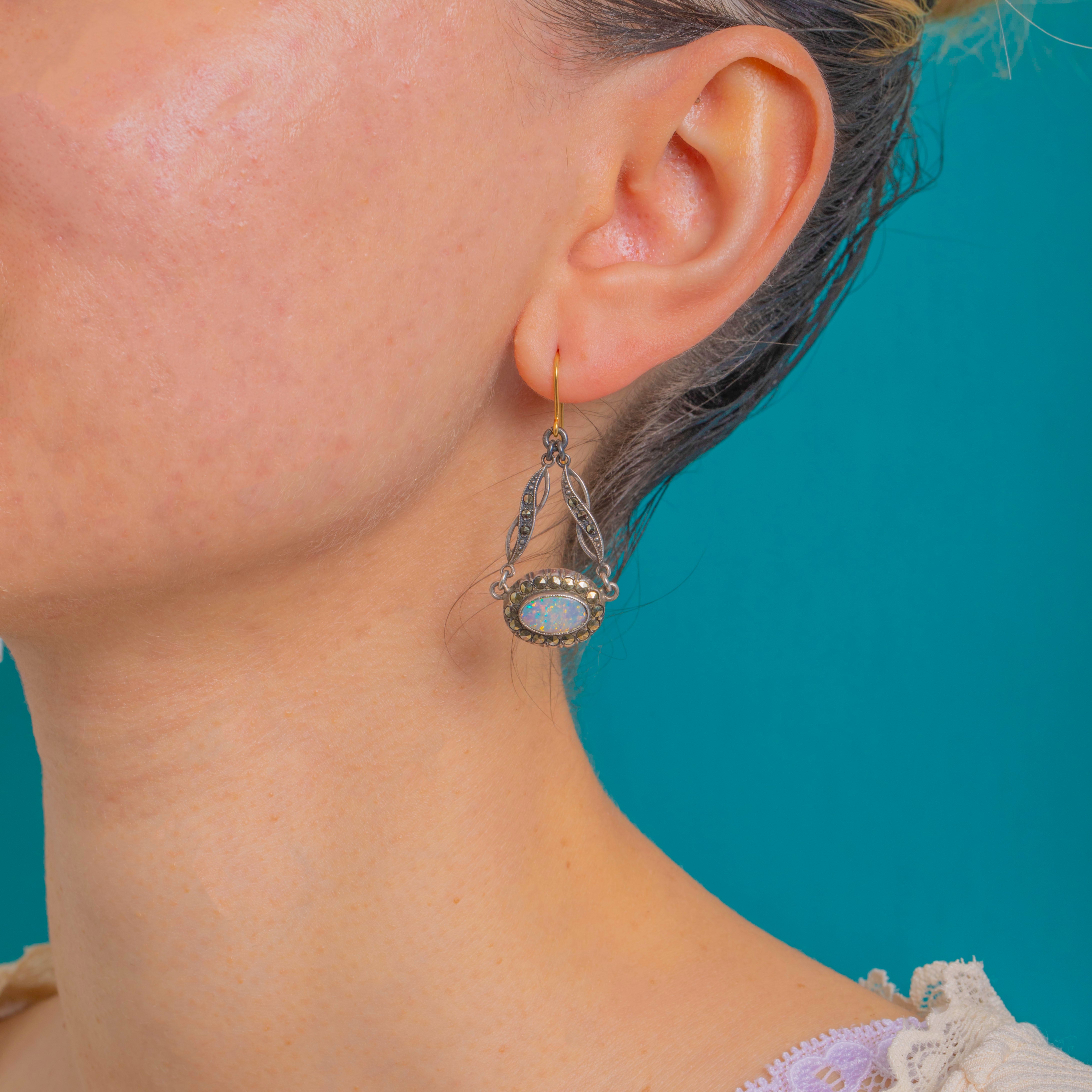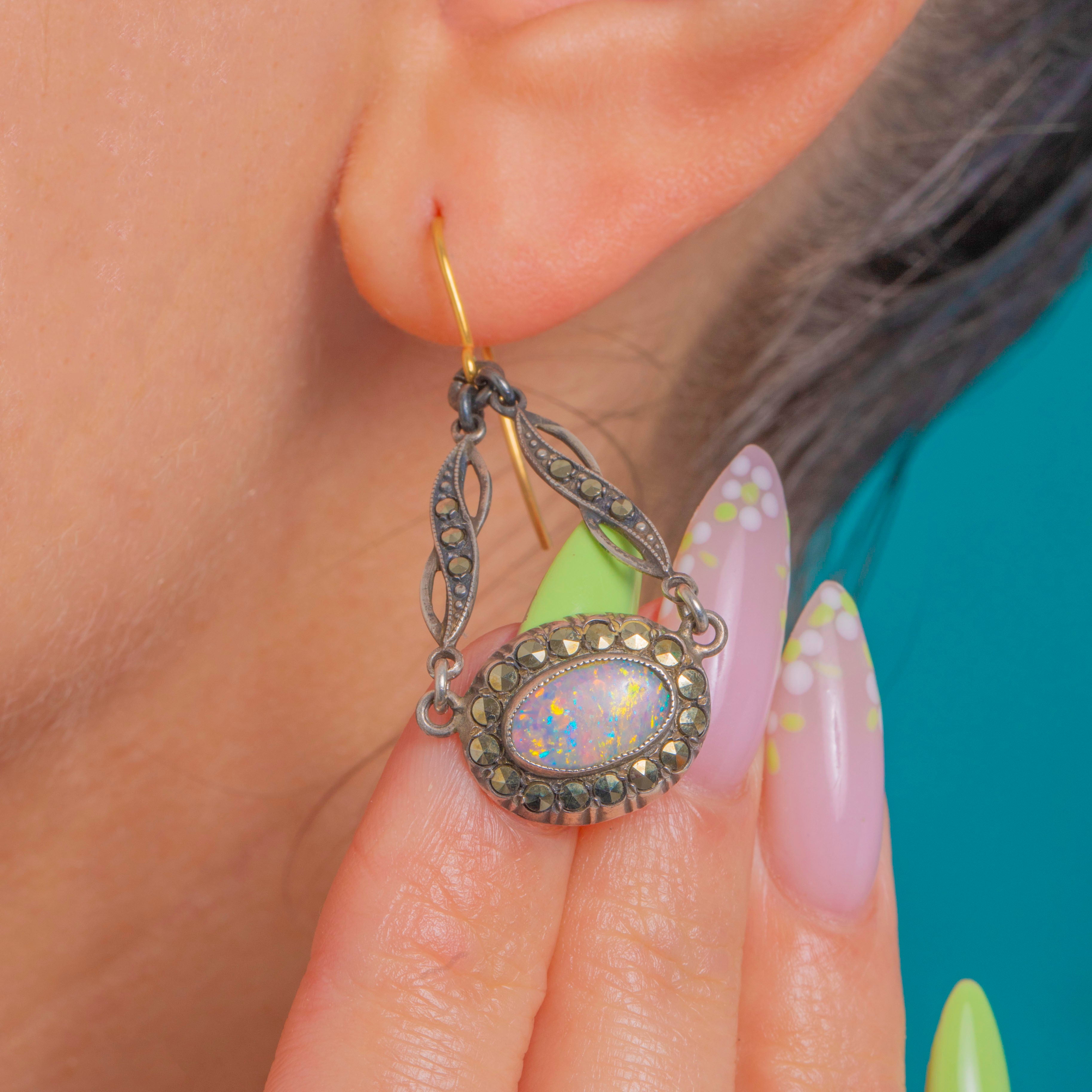 Die Opale leuchten mit blau-grünem und zartrosafarbenem Feuer auf dem sanft oxidierten Silber, während der Markasit das charakteristische Art Deco-Funkeln beisteuert. Gestempelt mit STERLING und vollendet mit Haken aus 9ct Gold, sind sie eine mühelos elegante Wahl vom Tag bis in den Abend.