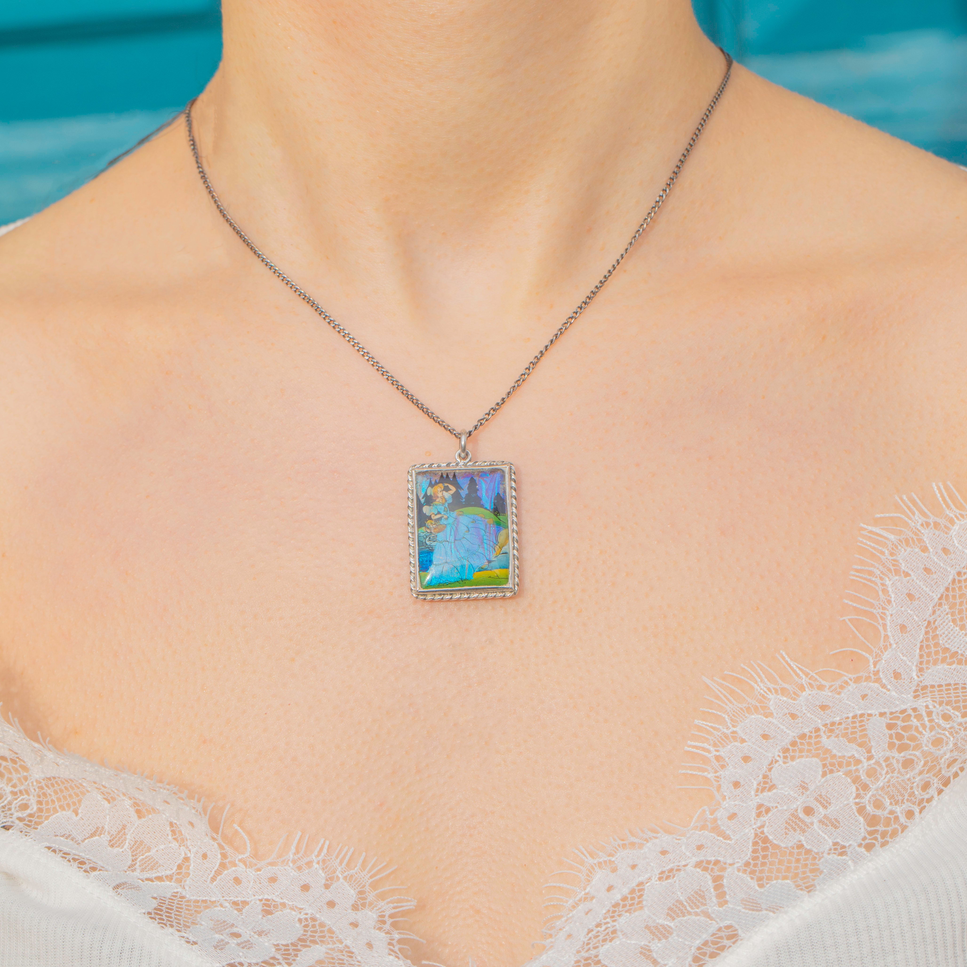 The butterfly wing has been skillfully hand-painted, showcasing a woman wearing a crinoline taking a stroll through the countryside. The level of detail achieved is a true testament to the craftsmanship of the era, making this Art Deco pendant a coveted addition to your collection!