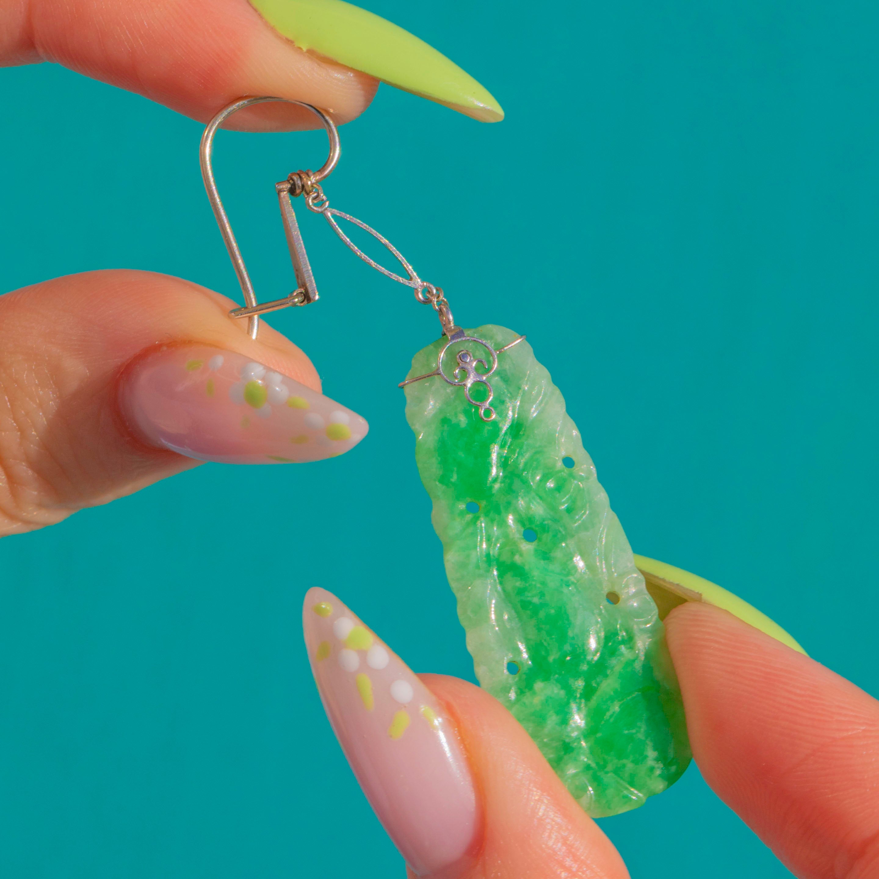 Art Deco Ohrhänger mit geschnitztem Jade-Anhänger, 9ct Weißgold