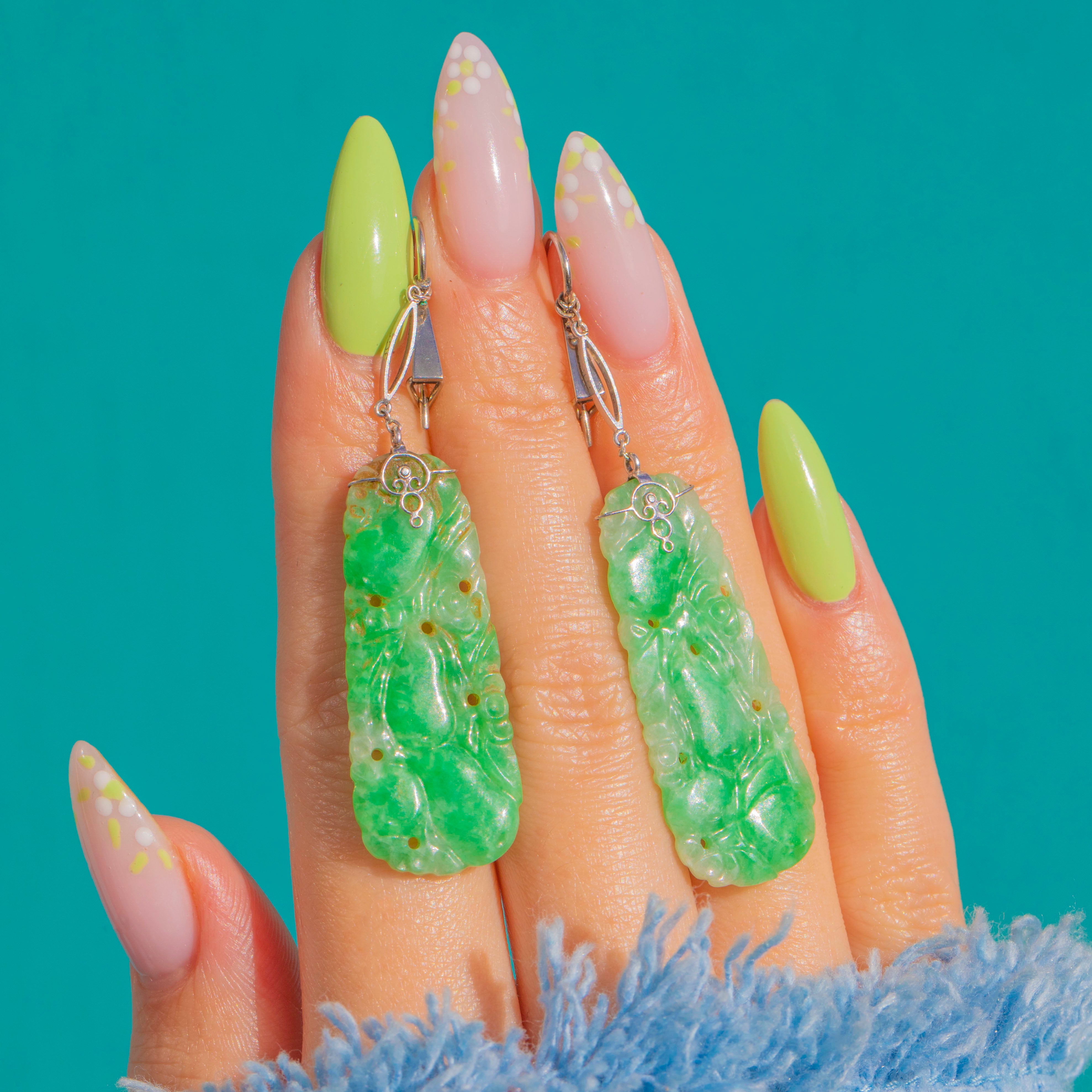 Ein leuchtendes Duett aus geschnitztem Jadeit-Jade: Diese Art Deco Ohrhänger bezaubern mit ihrer frischen, grünen Transparenz und romantischen, in flachem Relief gearbeiteten Blattvoluten. Die eleganten Plaketten strahlen von innen heraus, wobei natürliche Wolken und Nuancen ihnen Tiefe und eine ruhige, gläserne Ausstrahlung verleihen. An raffinierten Fassungen aus 9ct Weißgold schwebend, bewegen sie sich anmutig und setzen ein ausdrucksstarkes, skulpturales Statement.