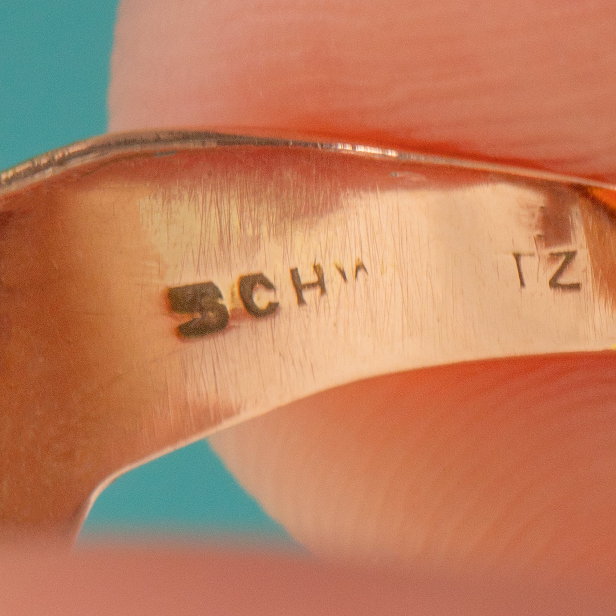 Rich with symbolism and presence, it’s a striking statement piece that wears effortlessly day to night. The ring is stamped 9ct and SCHMITZ to the inner shank, and its craftsmanship and patina speak to its vintage charm.