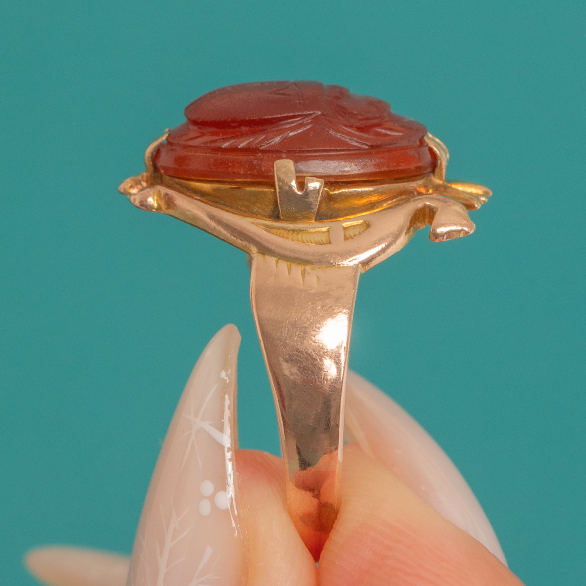 VERY GOOD: The Carnelian shows light abrasions and softening to the high points commensurate with age, with a lovely even glow. The setting and shank display minor surface scuffs and a warm patina; one claw is slightly worn but the stone remains secure. No visible structural issues noted.