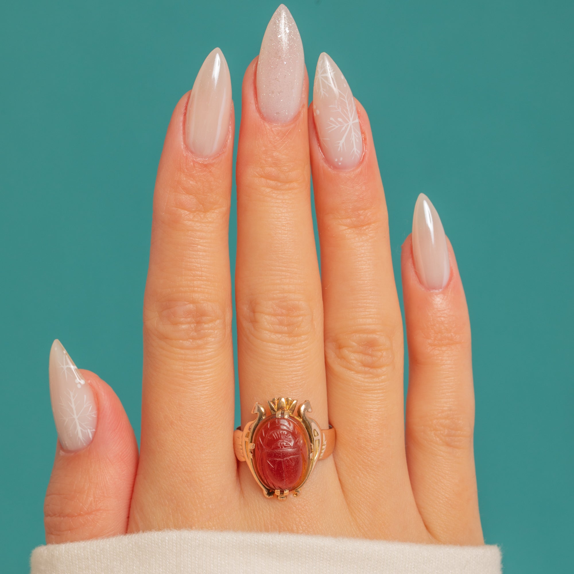 A bold ode to Egyptian Revival glamour, this Art Deco ring showcases a beautifully carved Carnelian scarab set in 9ct Gold. The translucent red-orange cabochon glows warmly, its scarab carving framed by sculptural lotus-like uprights and a decorative head that feels both architectural and elegant.