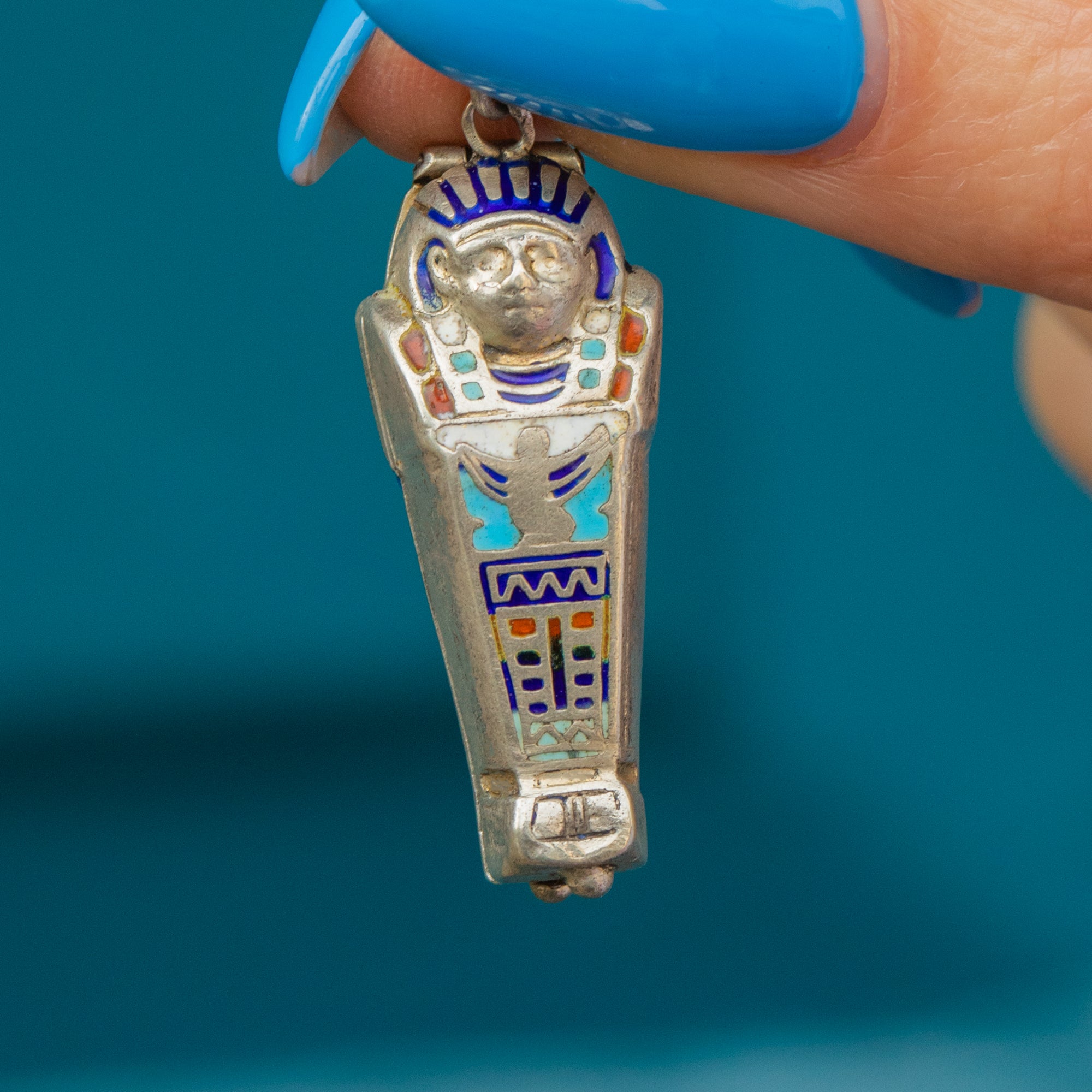 EXCELLENT. This Art Deco Egyptian Revival Silver Sarcophagus pendant is in excellent condition. The sarcophagus pendant has a stunning Enamel exterior and a mummy on the inside, which a lot of these revival pieces don't retain! We think this is a gorgeous piece, and quirky at that, which your collection needs.